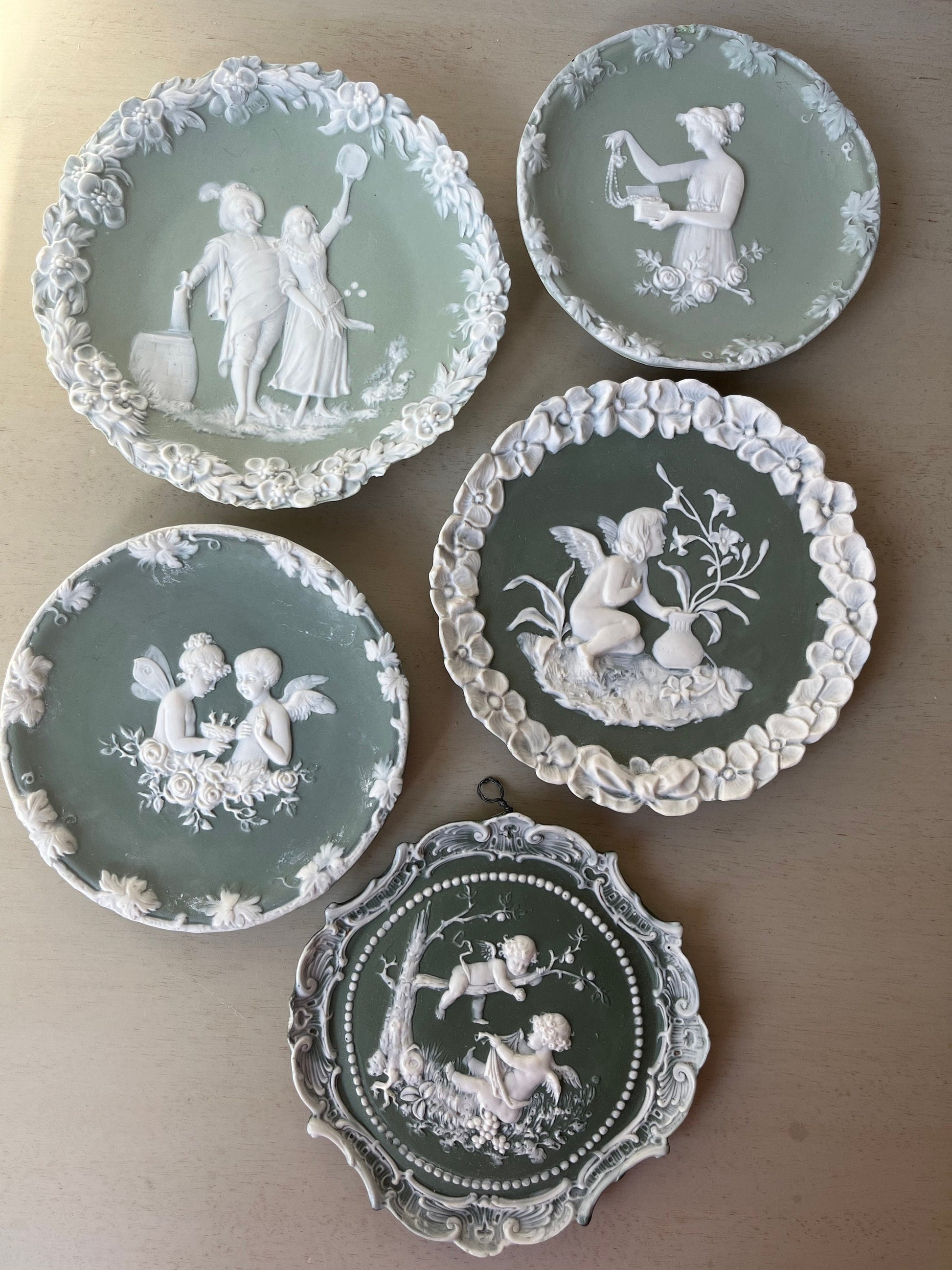 This is a fantastic collection of antique Victorian Jasperware by Schafer and Vater. There are 5 plaques / plates with wall hanging loops on the back. Additionally, this set consists of 3 other dishes (a creamer, a small pitcher and a bud vase).