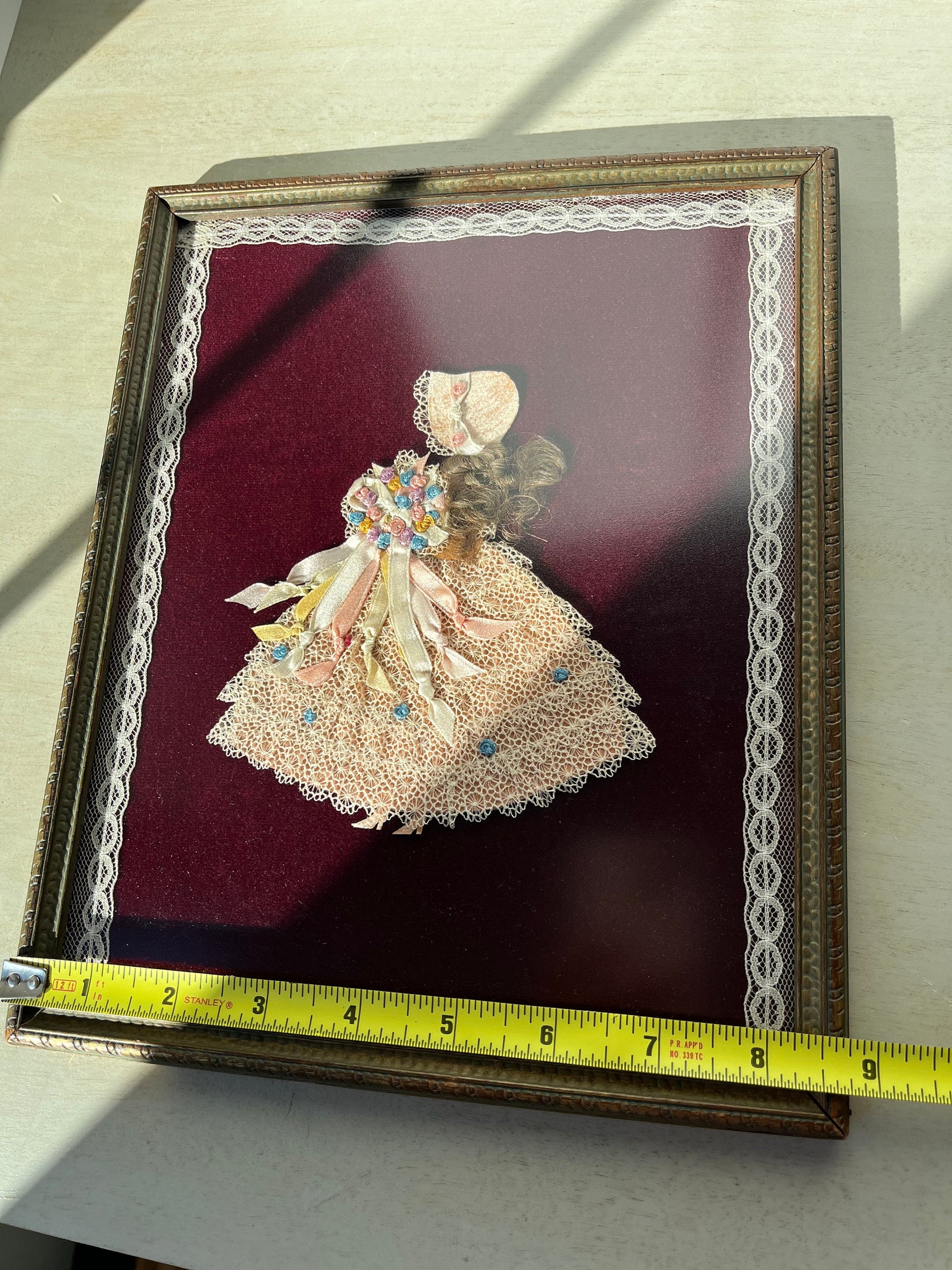 Wonderful antique wall hanging - a paper and fabric girl wearing a peach colored dress made out of lace and ribbons and holding a bouquet in a frame.
