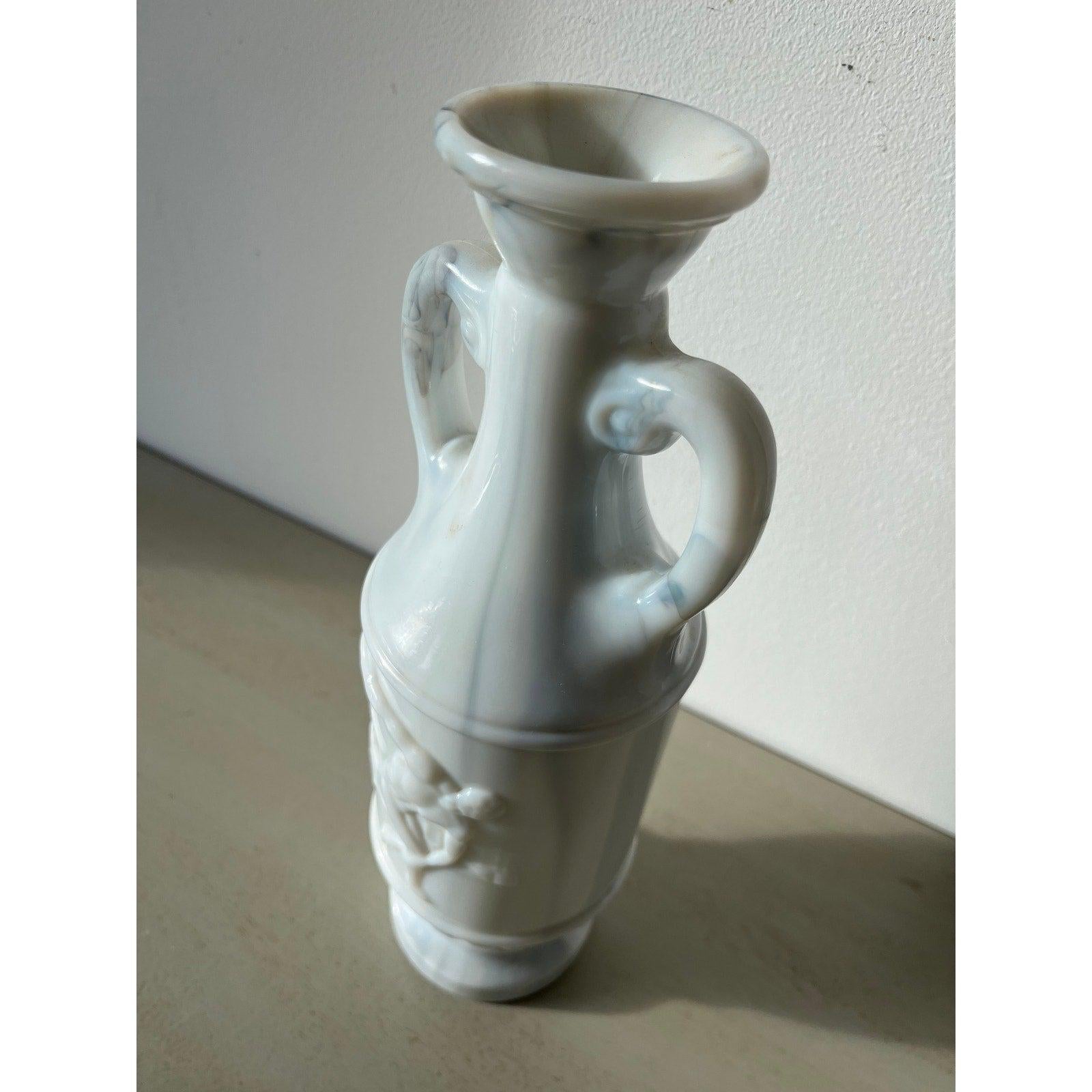 Cool raised image of a male Grecian discus thrower on both sides with Greek Colosseum in background. Milk glass with gray vein. Empty bottle without a stopper.