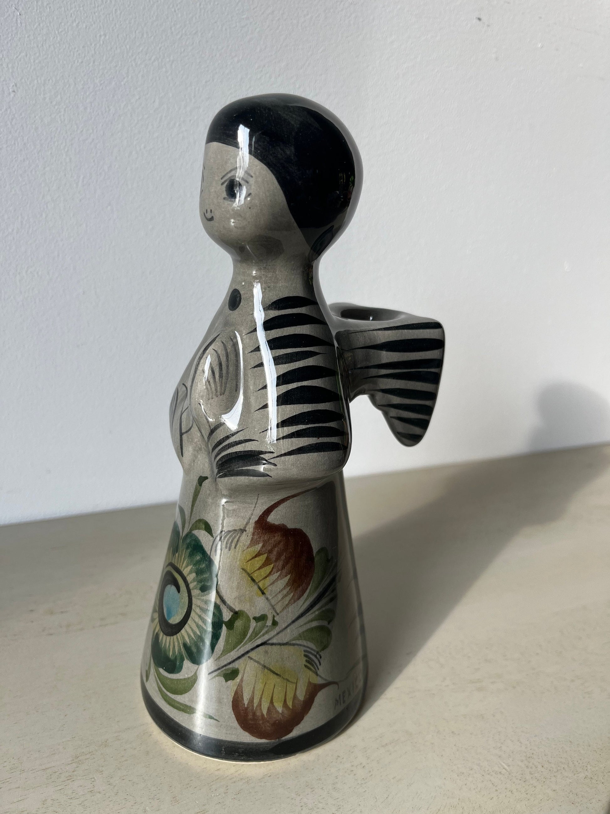 Adorable vintage folk art votive pottery angel candle holder Tonala Mexico
