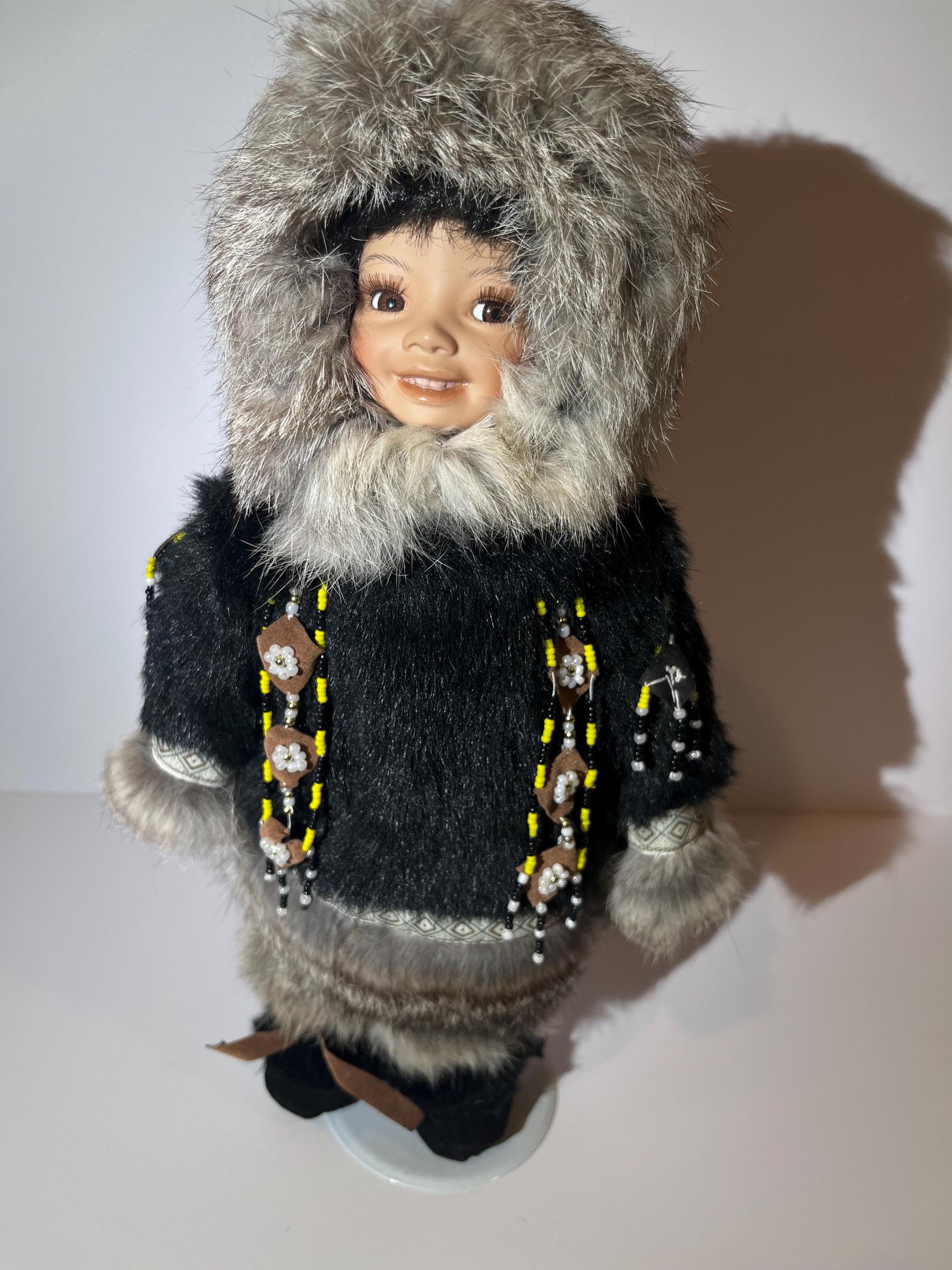 This is a beautiful Alaskan Friends porcelain doll (porcelain hands, face, and feet) dressed is traditional Eskimo fur clothing. Very lifelike, handcrafted by skilled artisans. Approx. 14 inches tall.