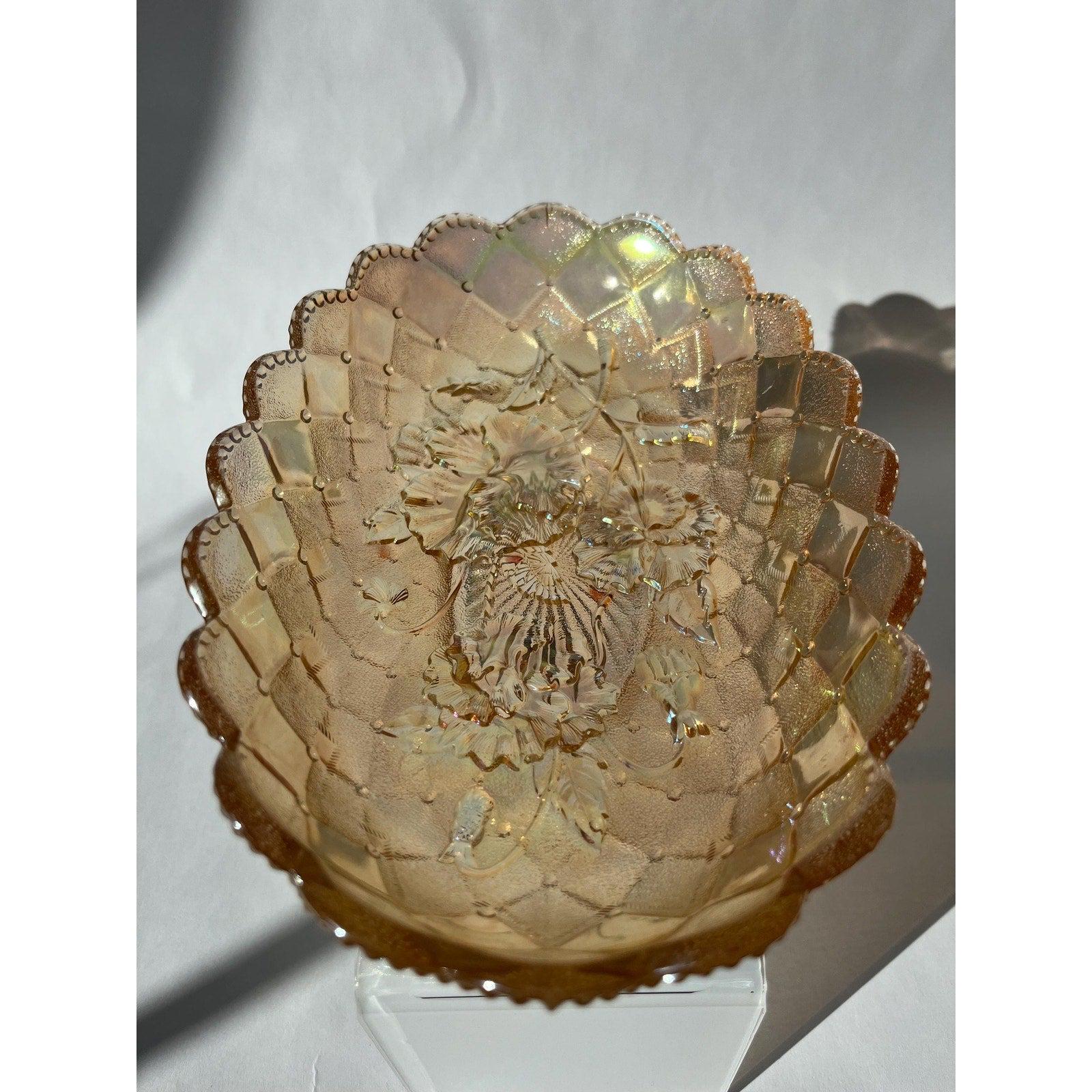 Gorgeous iridescent Pansy carnival glass pickle dish / vanity or candy dish with scalloped edges, made by Imperial Glass Company during the period of 1911-1918 in color Pastel Marigold. Absolutely stunning!