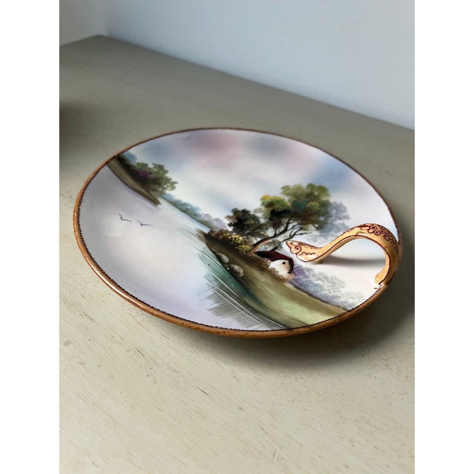 Look at those colors! and the details!Absolutely gorgeous dainty and sweet antique Noritake Morimura hand painted motifporcelain Lemon Dish, depicting a lake scene.