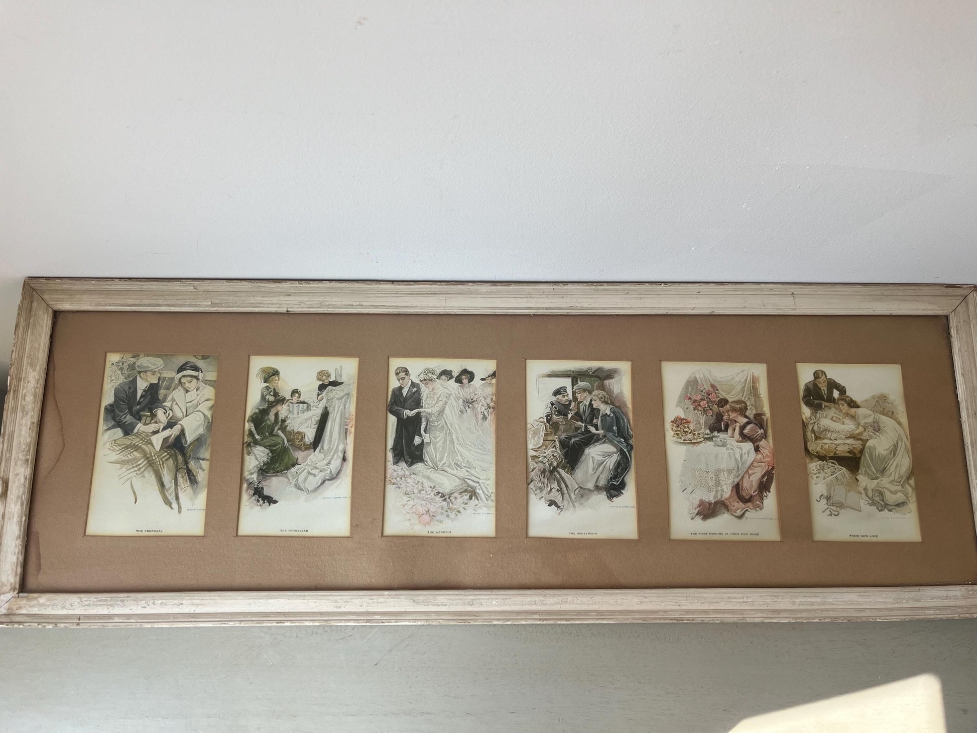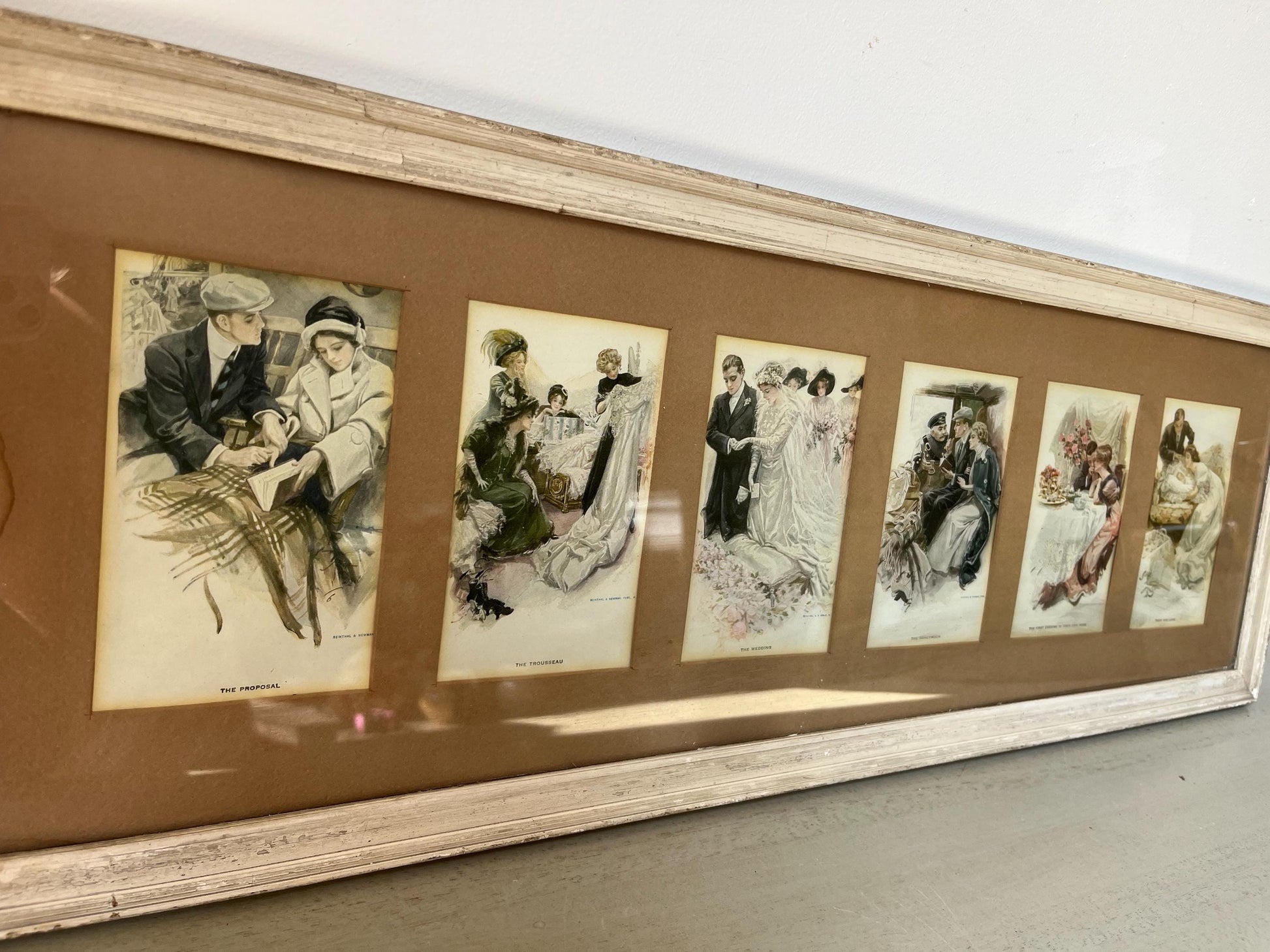 Wonderful antique set of lithographs / postcards “Six Stages of Love by Harrison Fisher, printed by Reinthal & Newman. They depict a courting couple going through 6 different stages in their life from engagement until the birth of child.