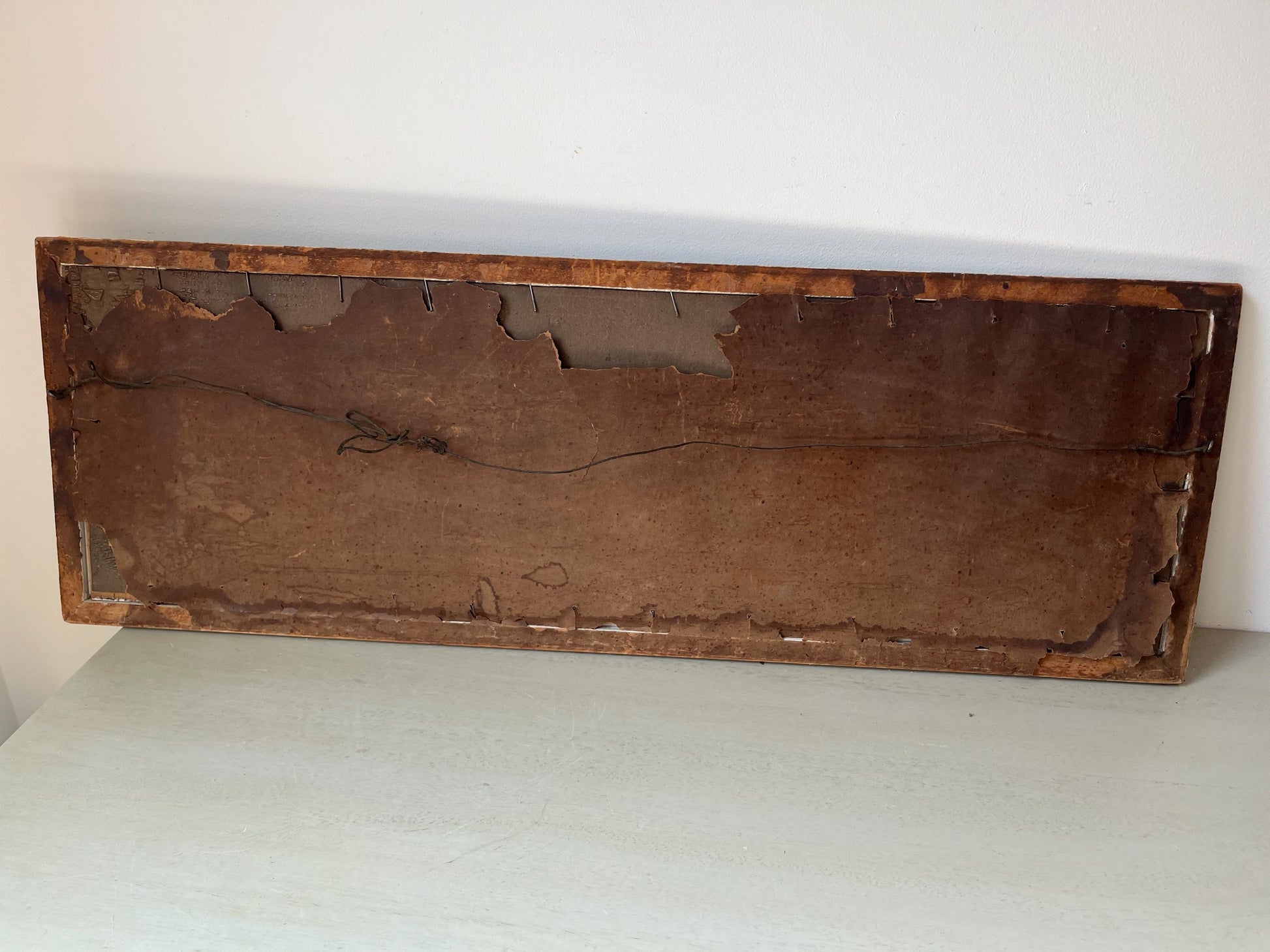 There is minor water damage to the matting and the frame. This is reflected in the price. A great candidate for a small restoration project or reframing.