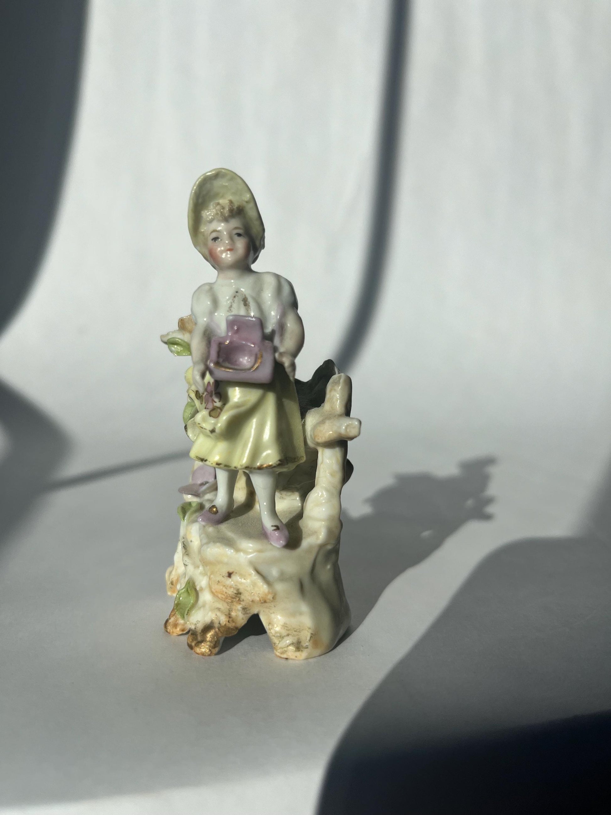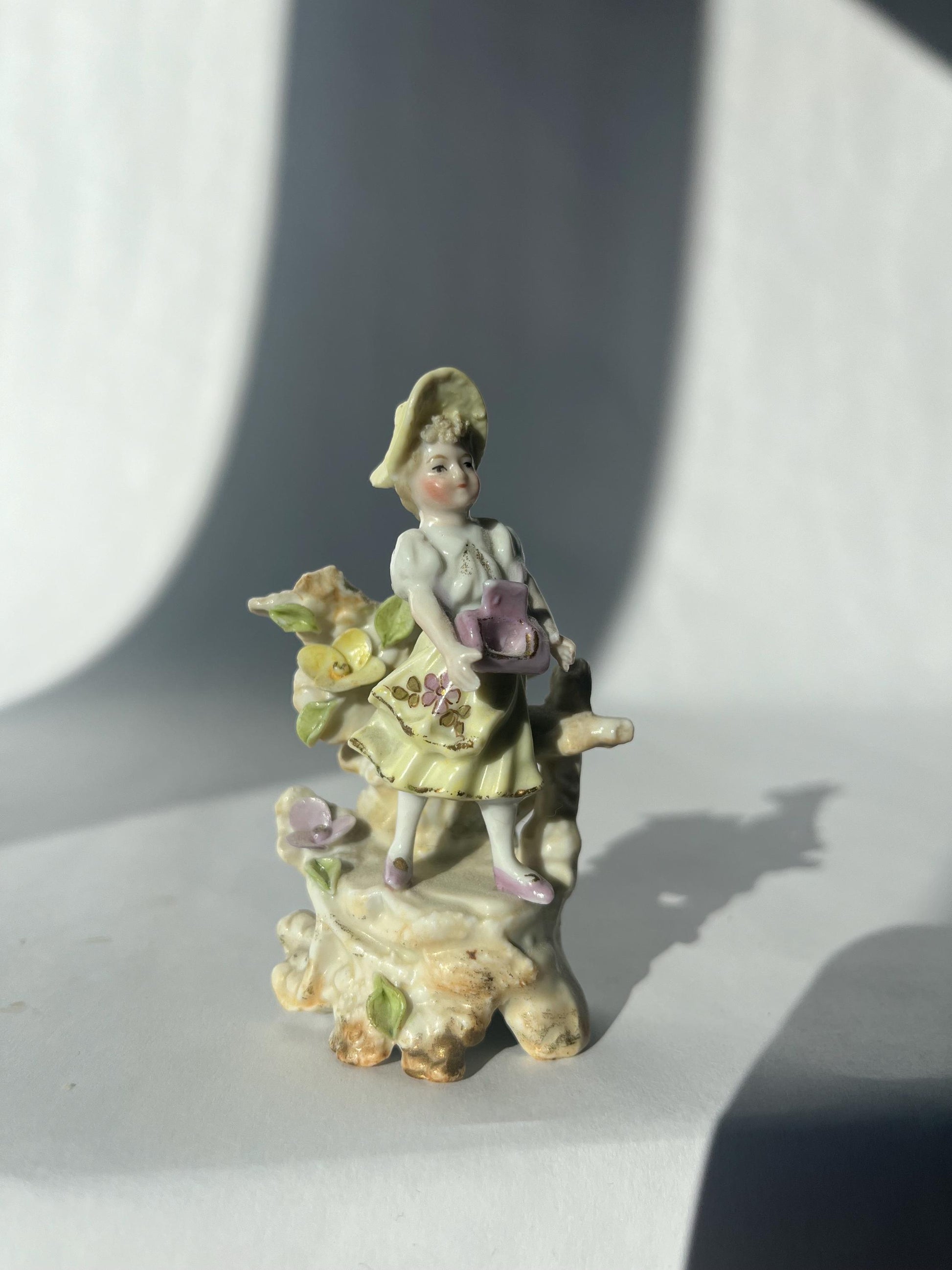 Lovely tiny antique porcelain figurine of a girl with flowers. Approx 3 inches tall.
