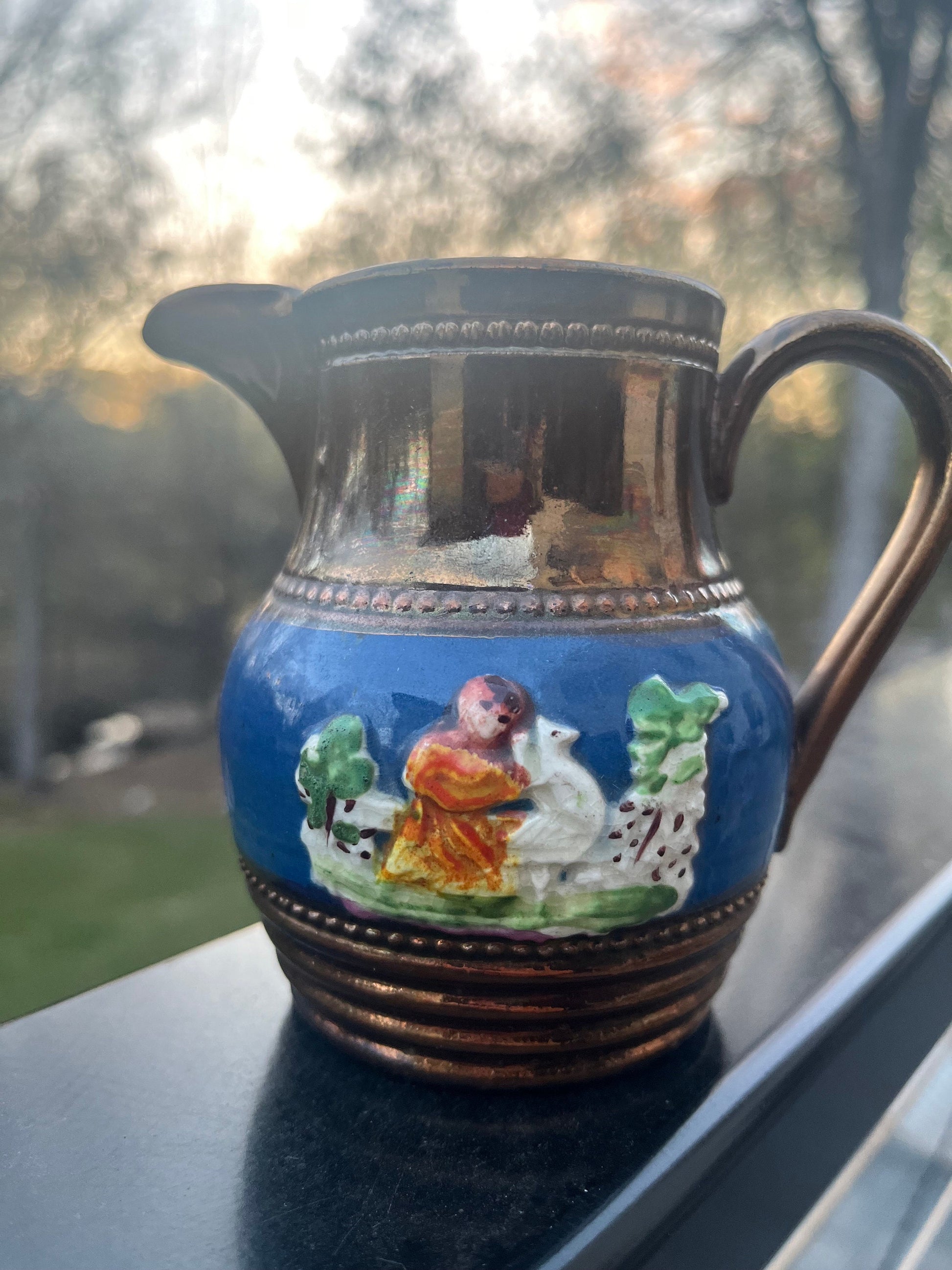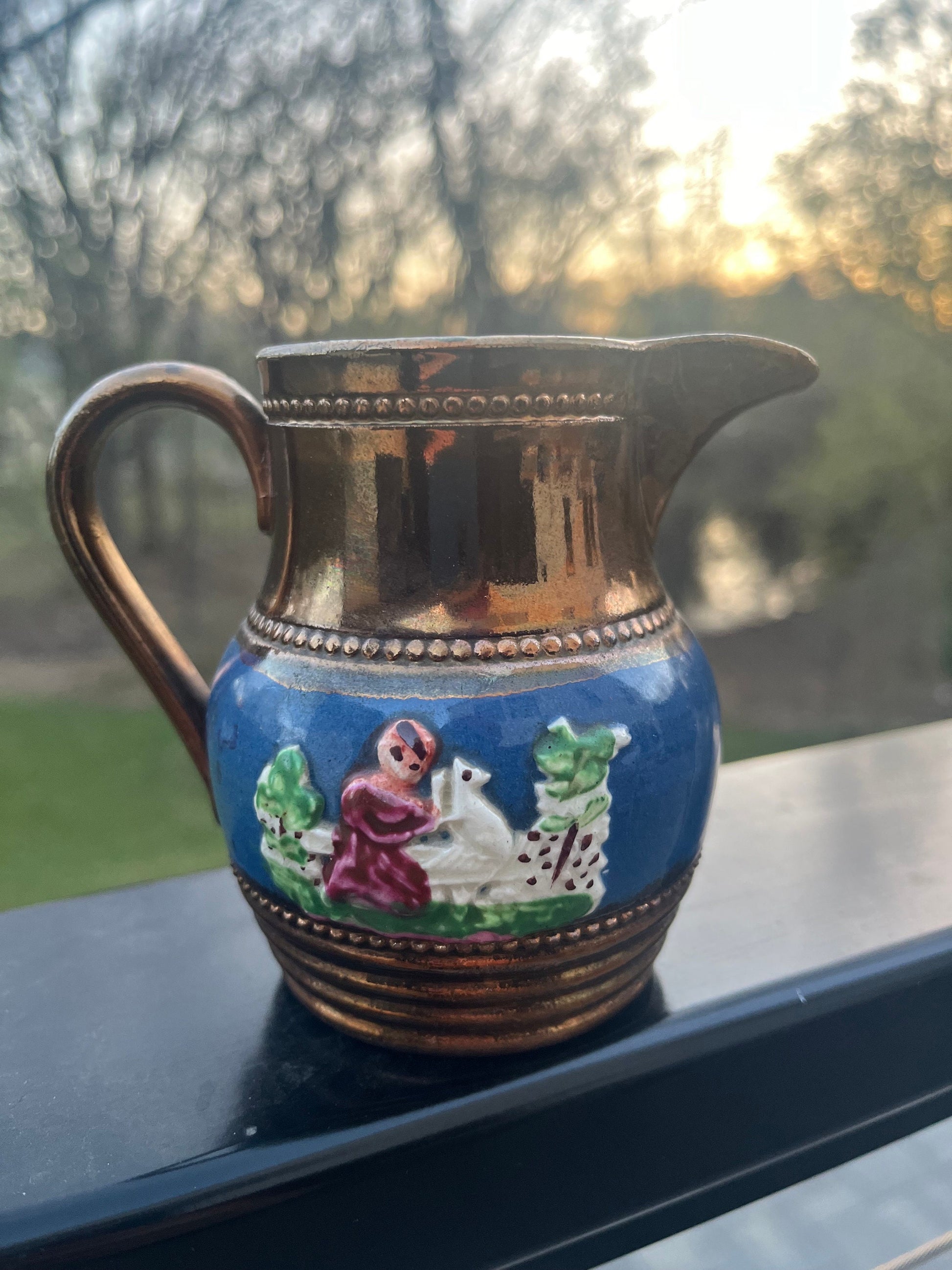 Lovely antique English Victorian copper luster glaze creamer. Blue slip band around the middle with raised decoration.