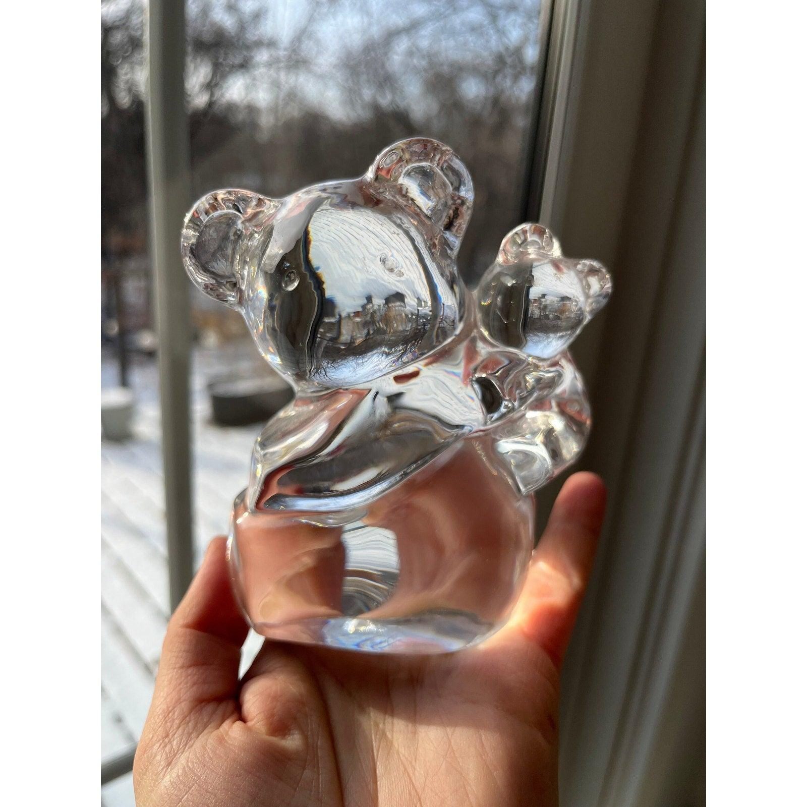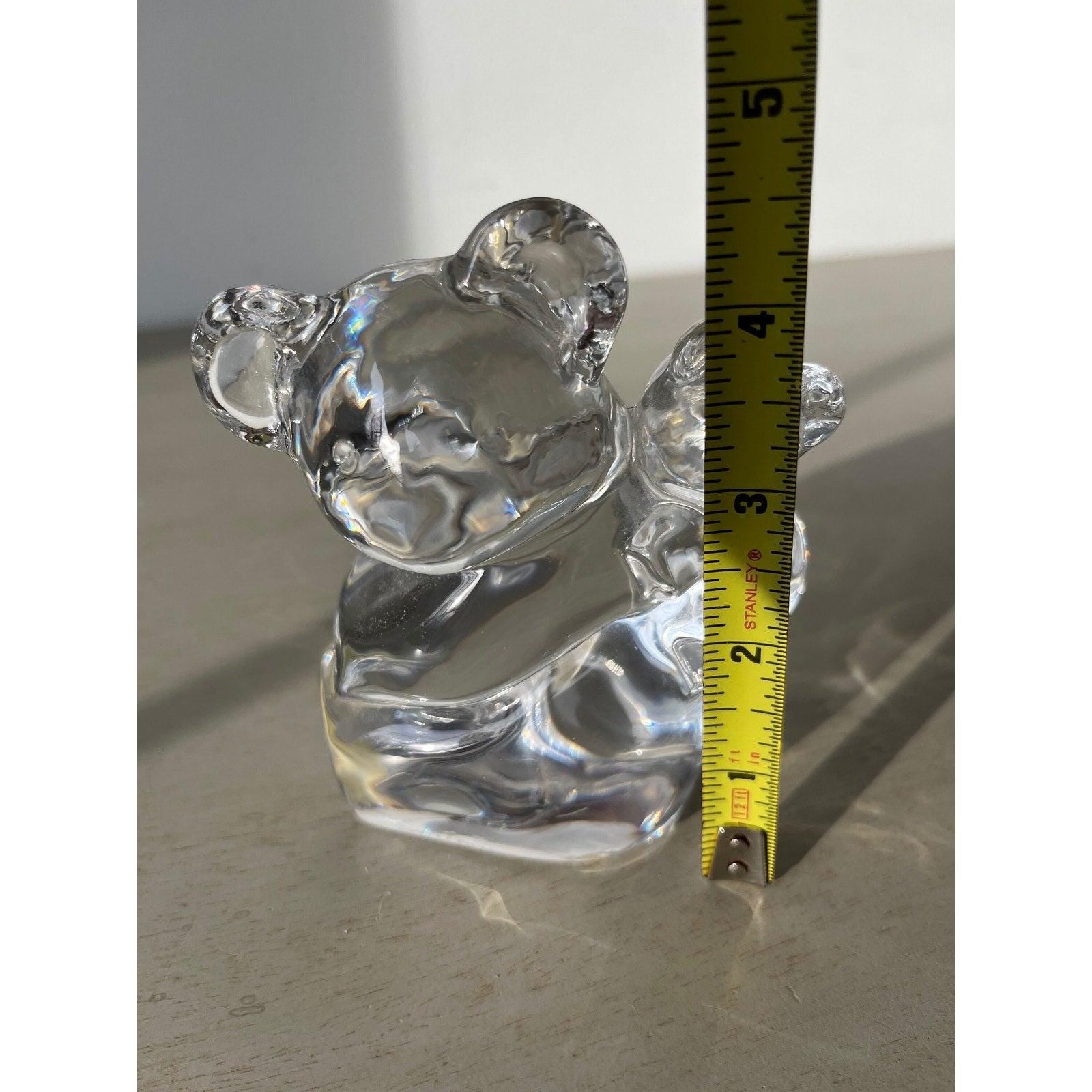 A clear heavy crystal glass figurine, measuring around 4.5 height and 3 width, around 2 lbs weight.