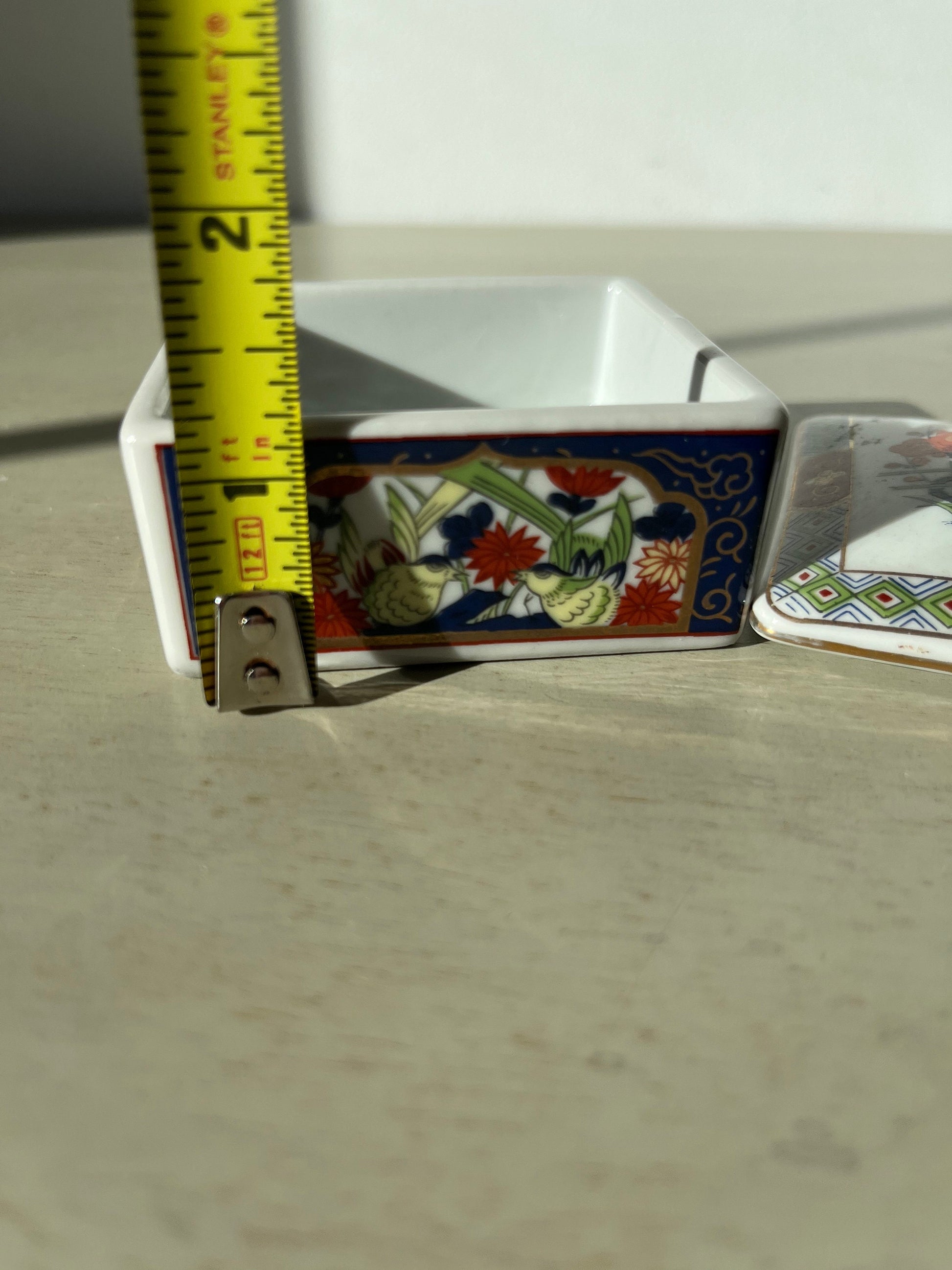 Japanese Imari porcelain trinket box (3 x 3 inch) with birds and flower design.