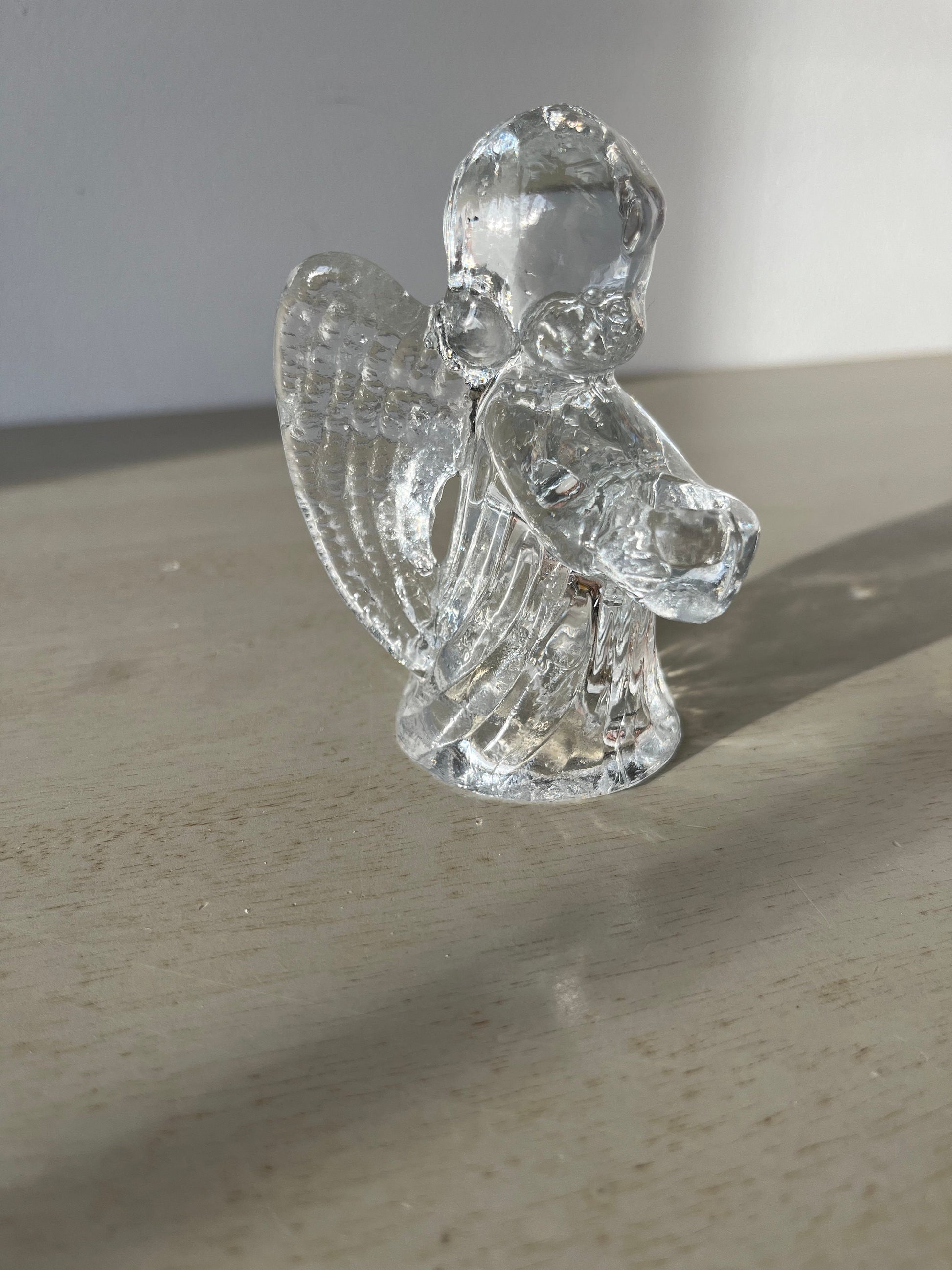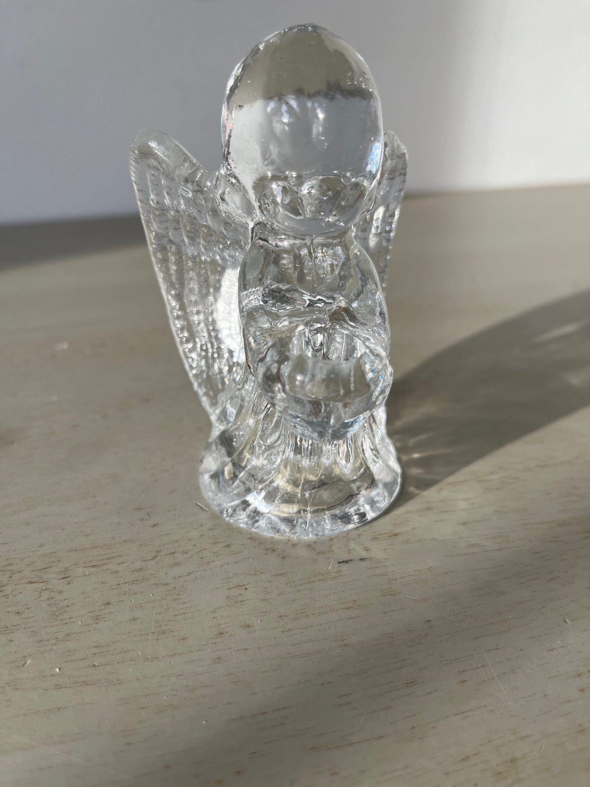 The angel is holding a small bowl which appears like it could hold a very thin candle.
