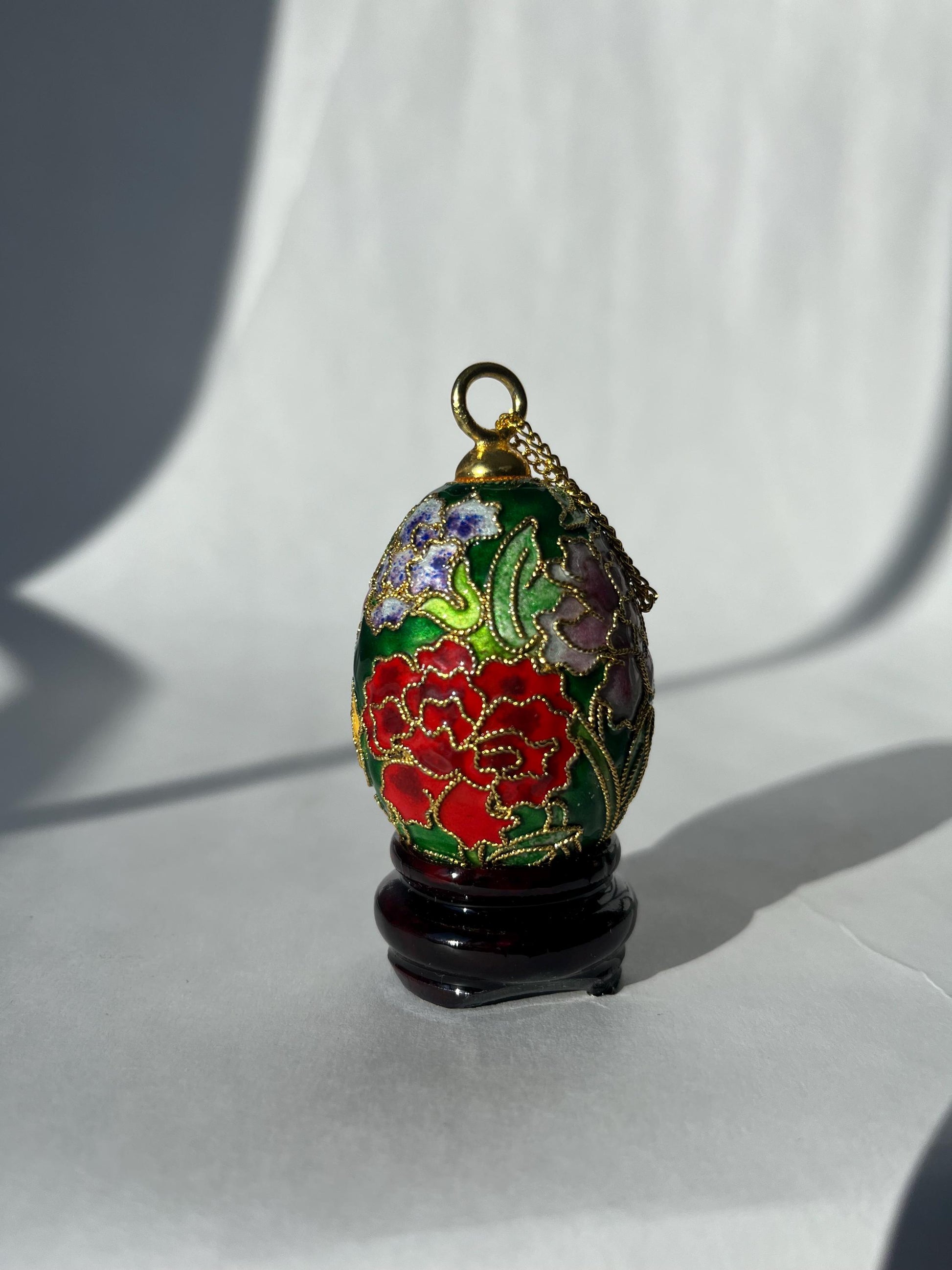 Wonderful set of 2 cloisonné eggs (approx 2 inches tall) in a box. A small stand for each egg included.