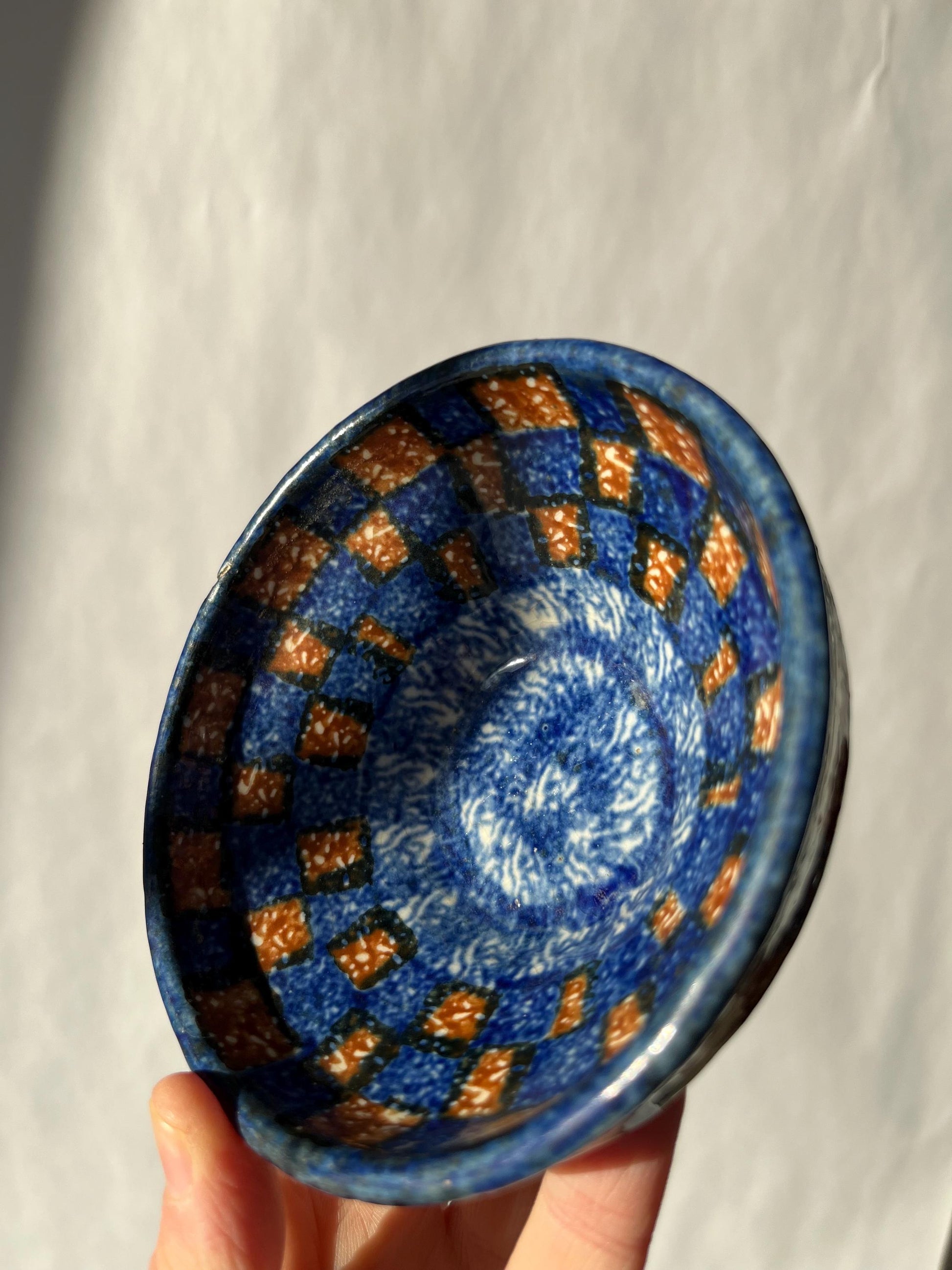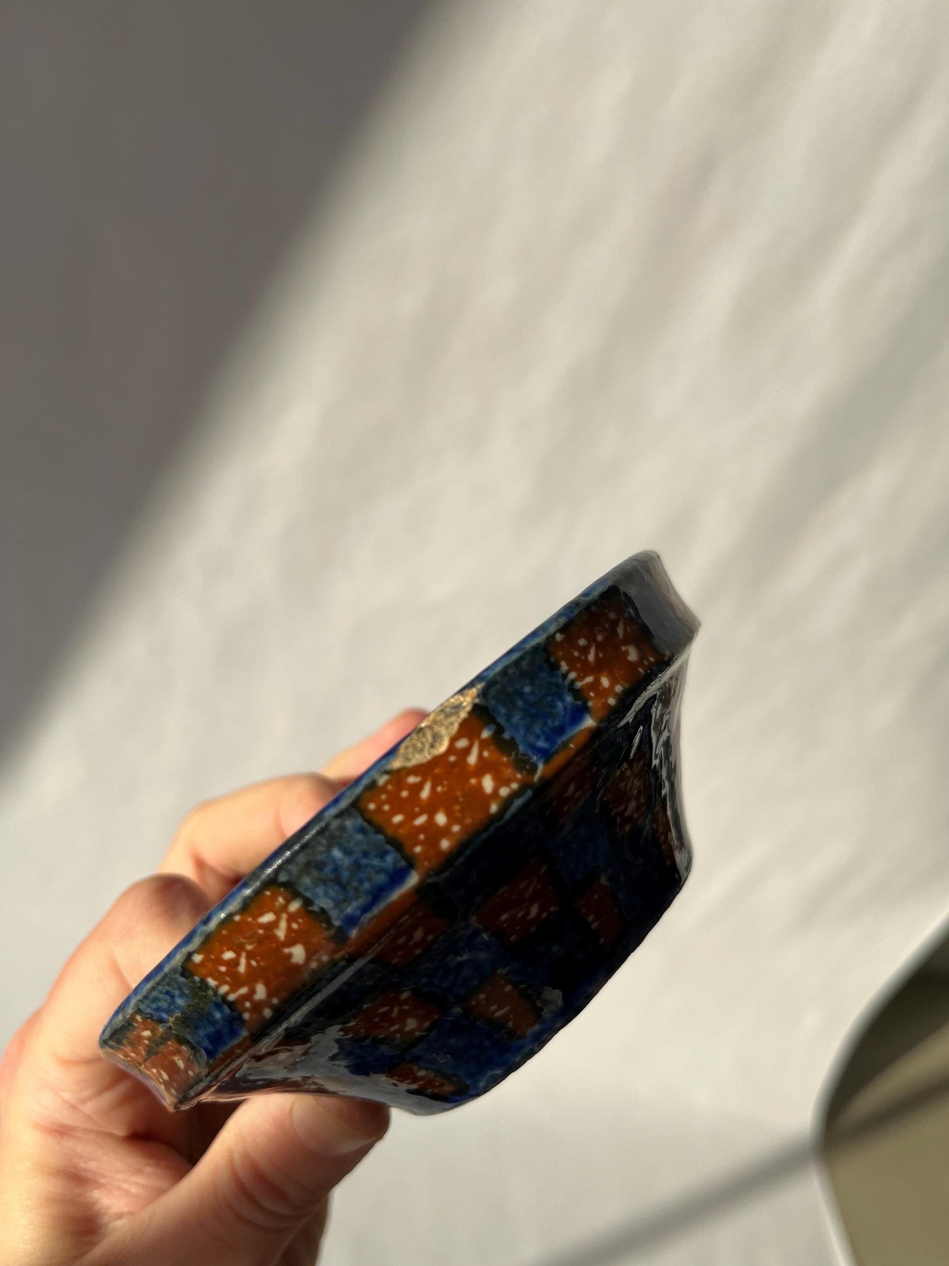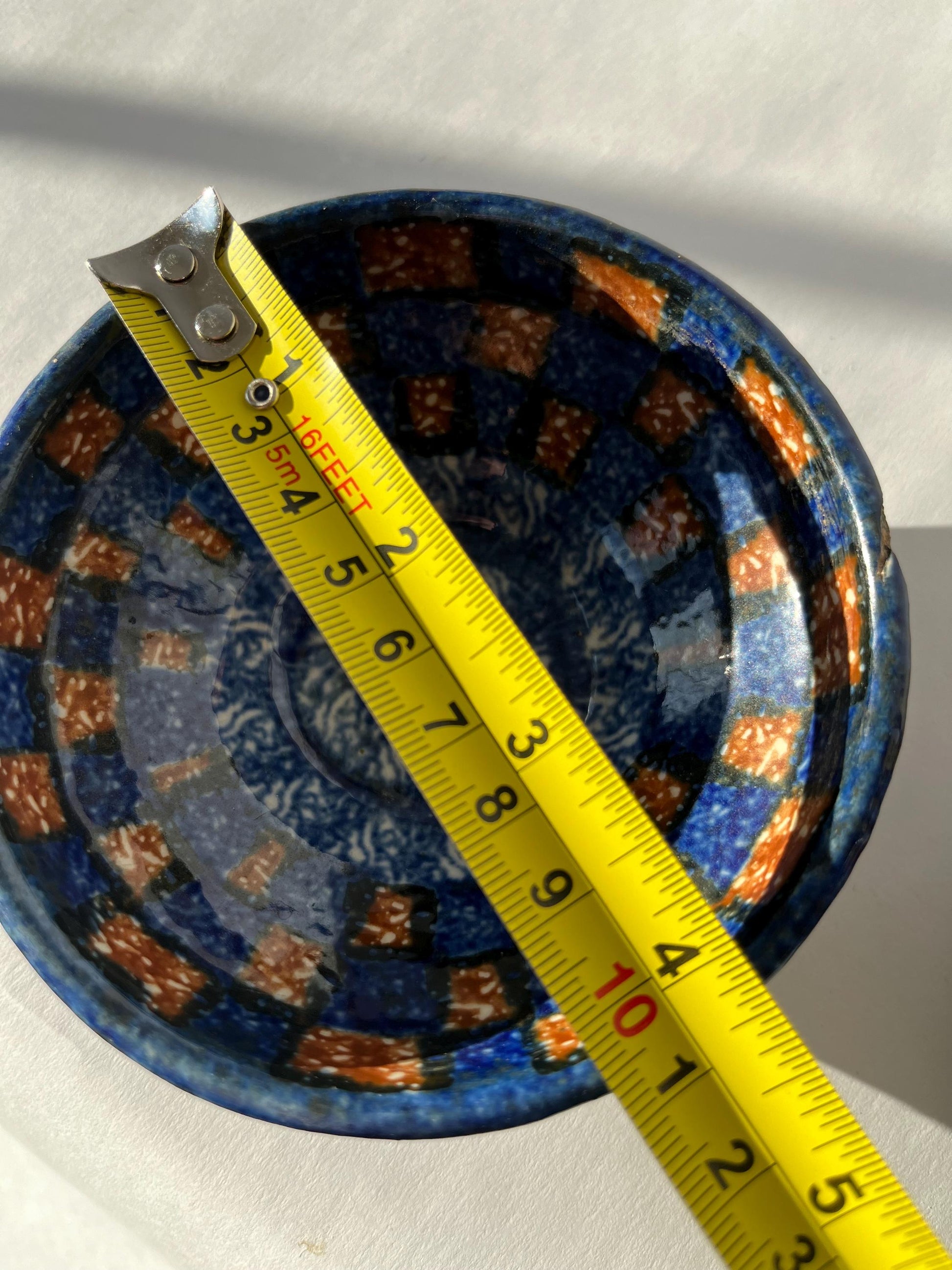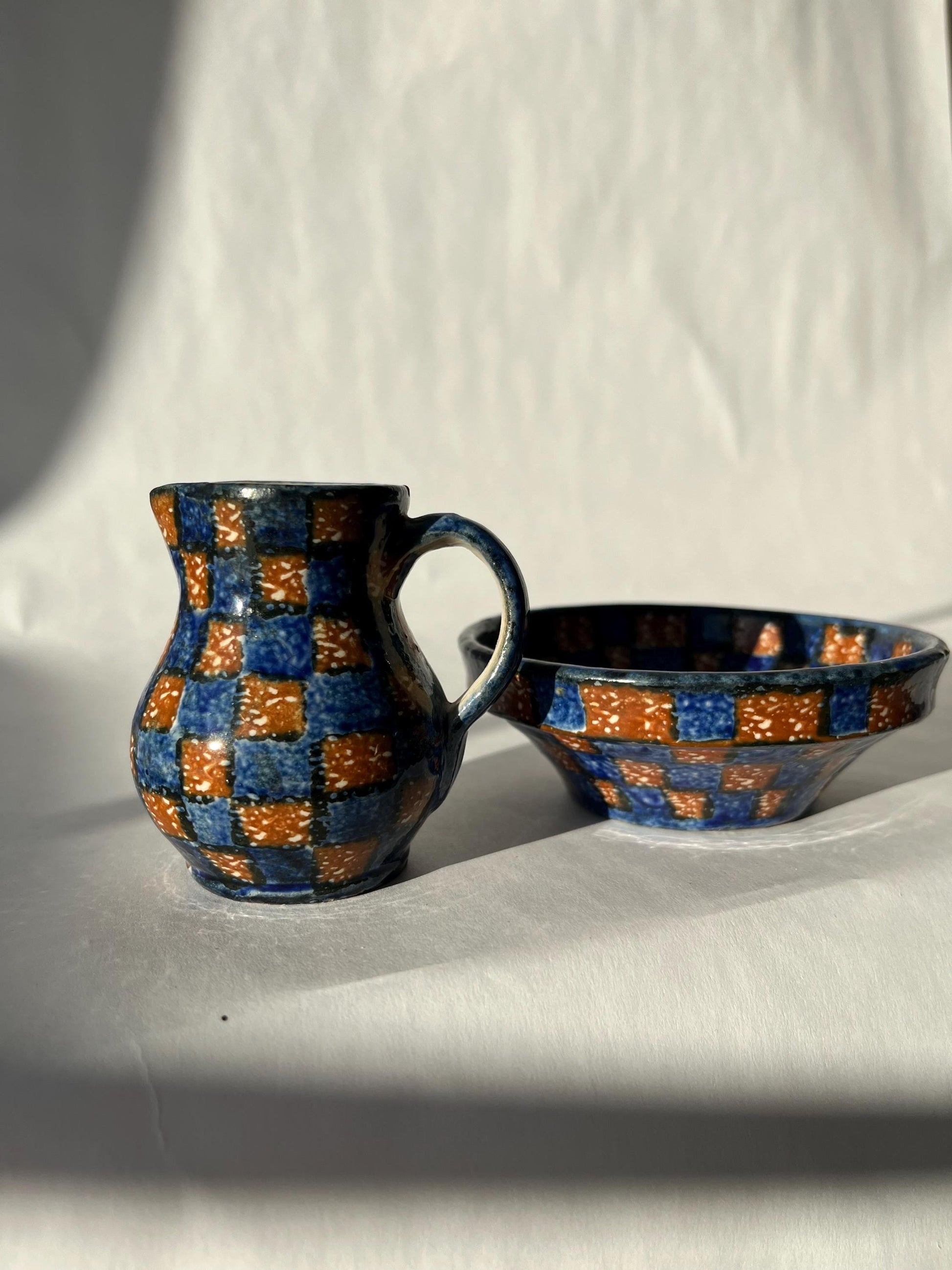 Lovely little set of a vintage reddish brown and blue checkered creamer and bowl by Erphila Germany. Please see measure in the photos.