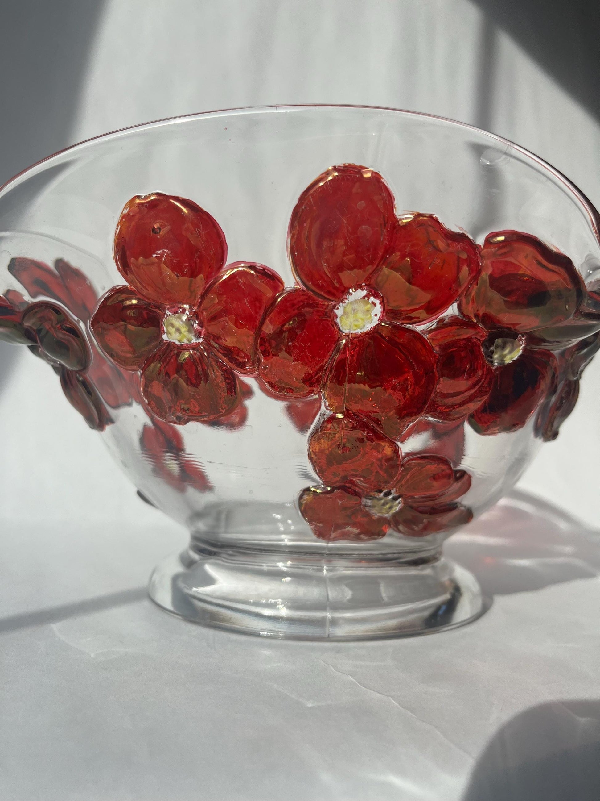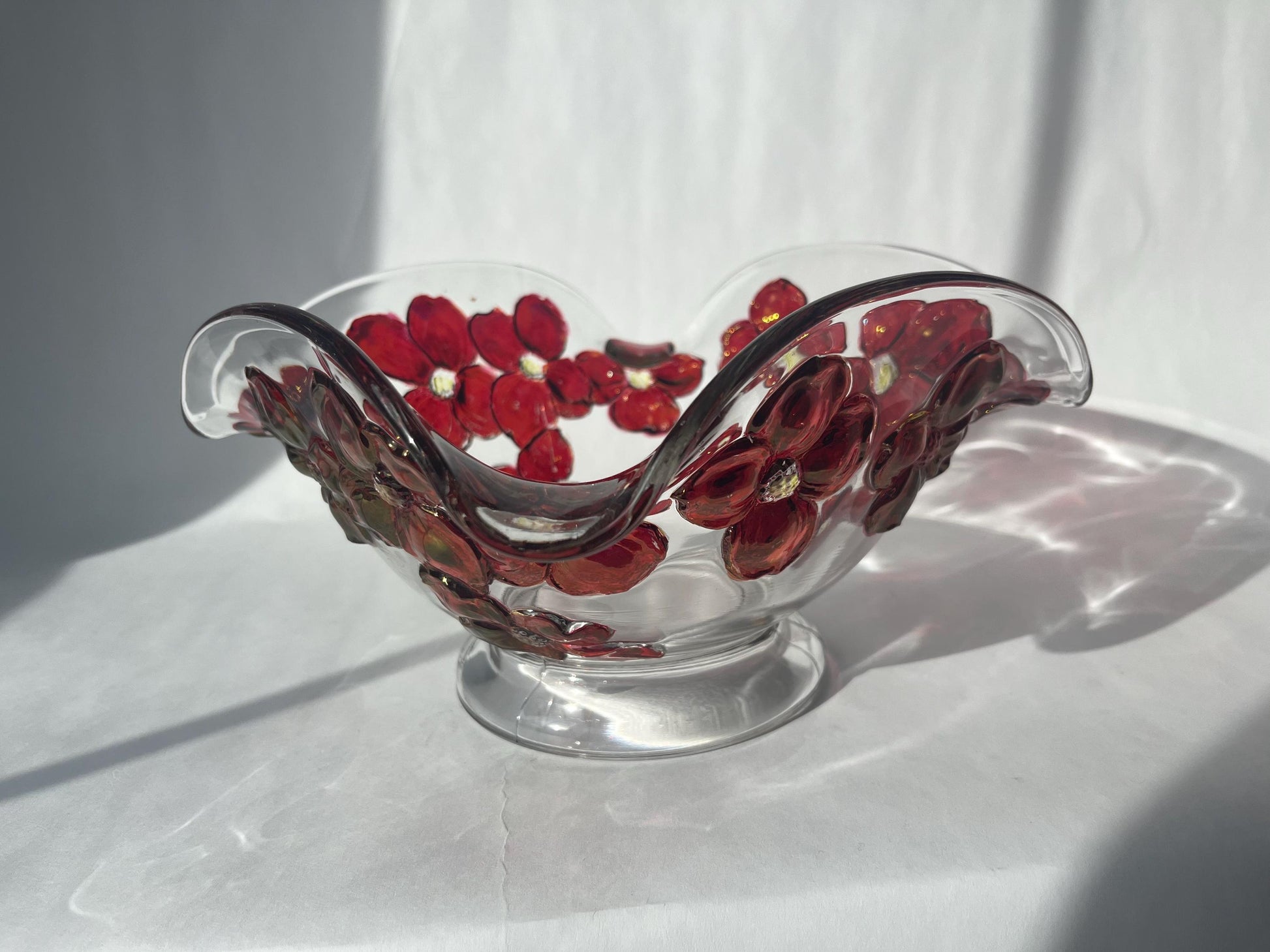 Heavy glass bowl with a scalloped rim and raised molded red iridescent flowers with a yellow centre. Breathtaking!