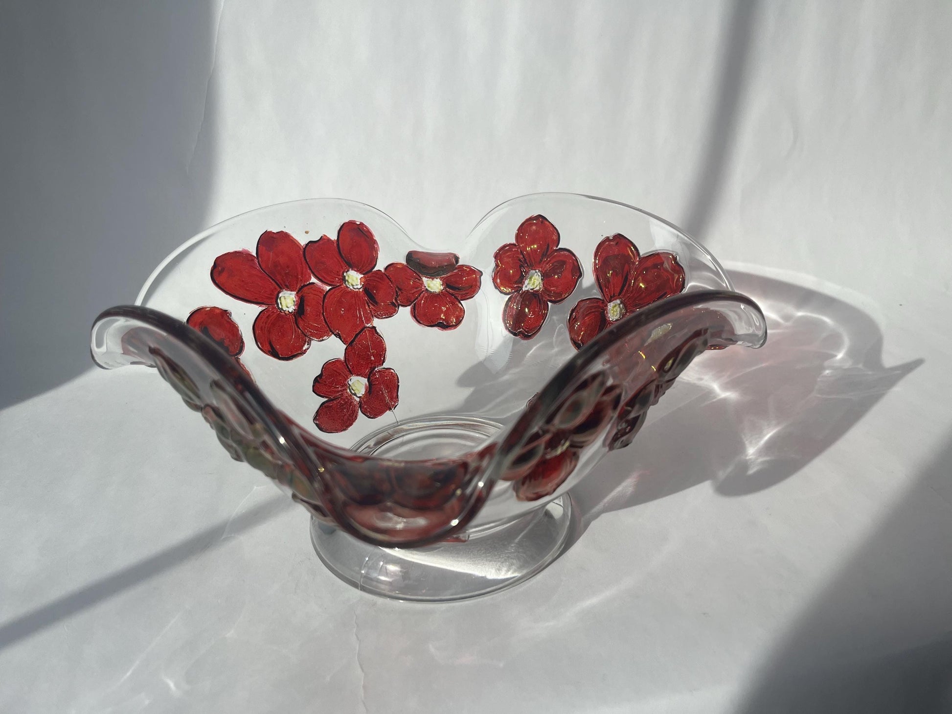 Stunning Colony Glass Dogwood Scalloped Glass Bowl Ruby Red Flowers