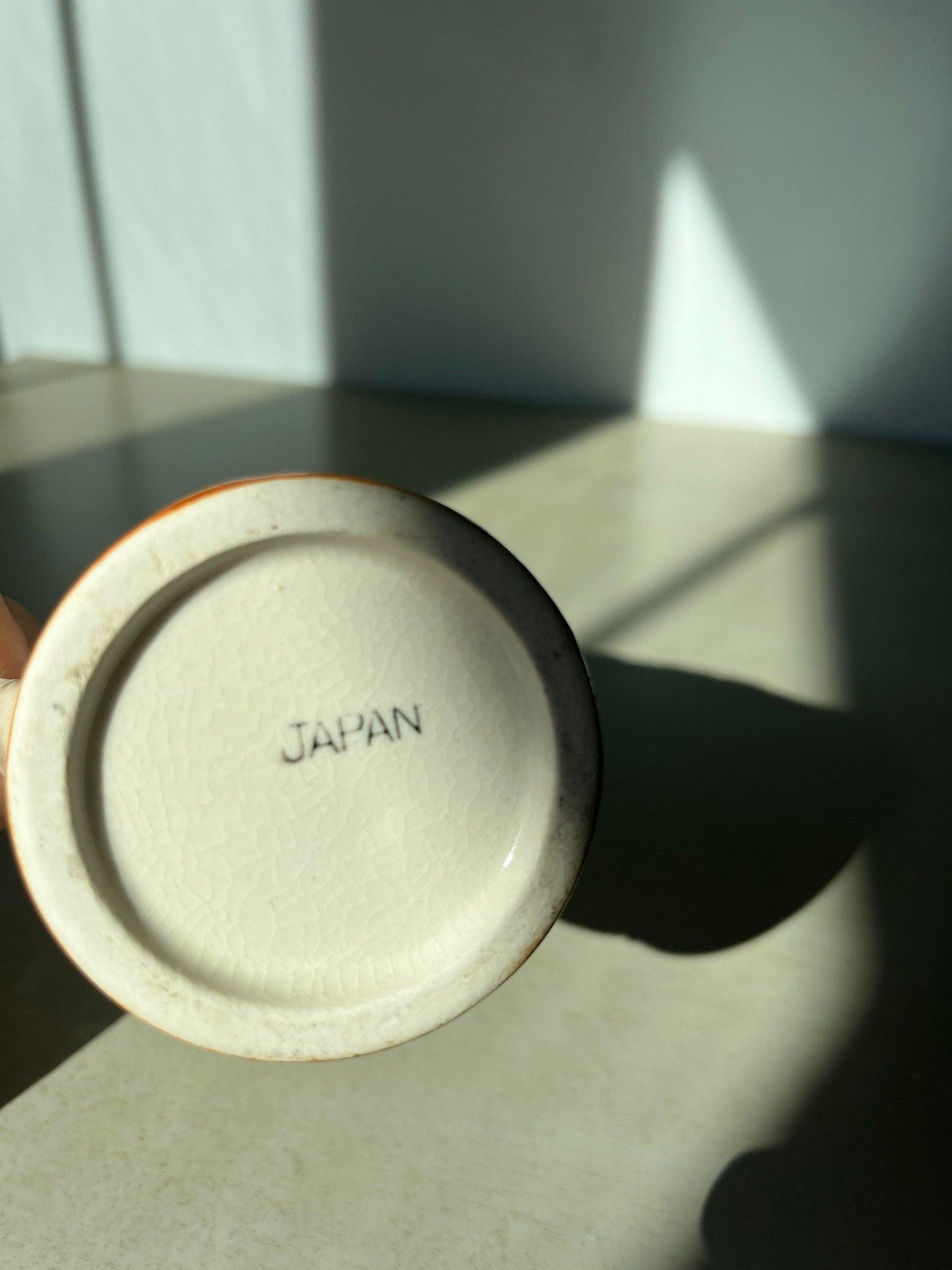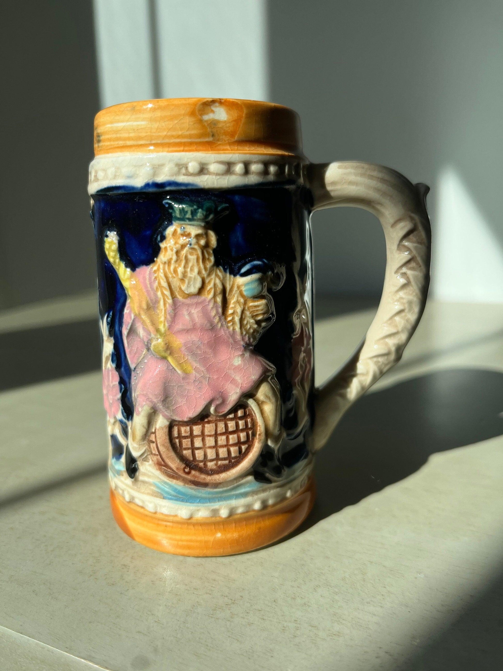 Vintage small beer stein, with mountain castle scenery on one side and bearded mas sitting on a keg on the other. Made in Japan, 4 inches tall.