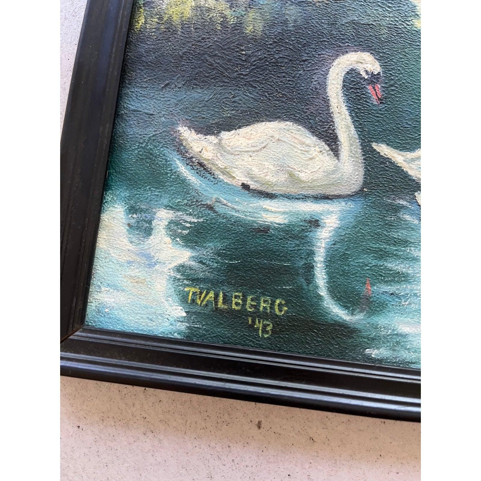 Most darling little painting of a family of swans? Signed TVALBERG ‘43.