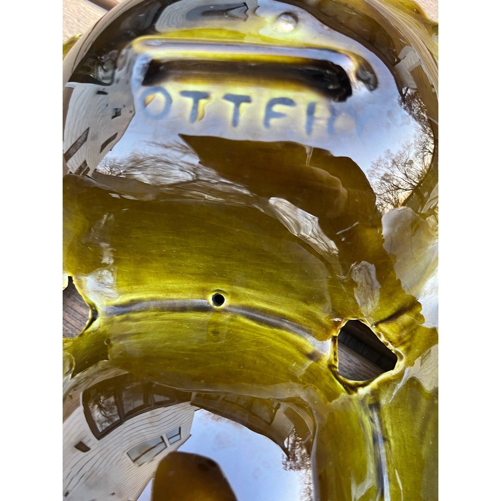 Great vintage condition, the only thing is a piece of ceramic had been broken off and glued back on the bottom of the dish (see last 2 pictures). Its only visible when turned. It will ship taped to make sure no one gets cut on it (or furniture scratched).