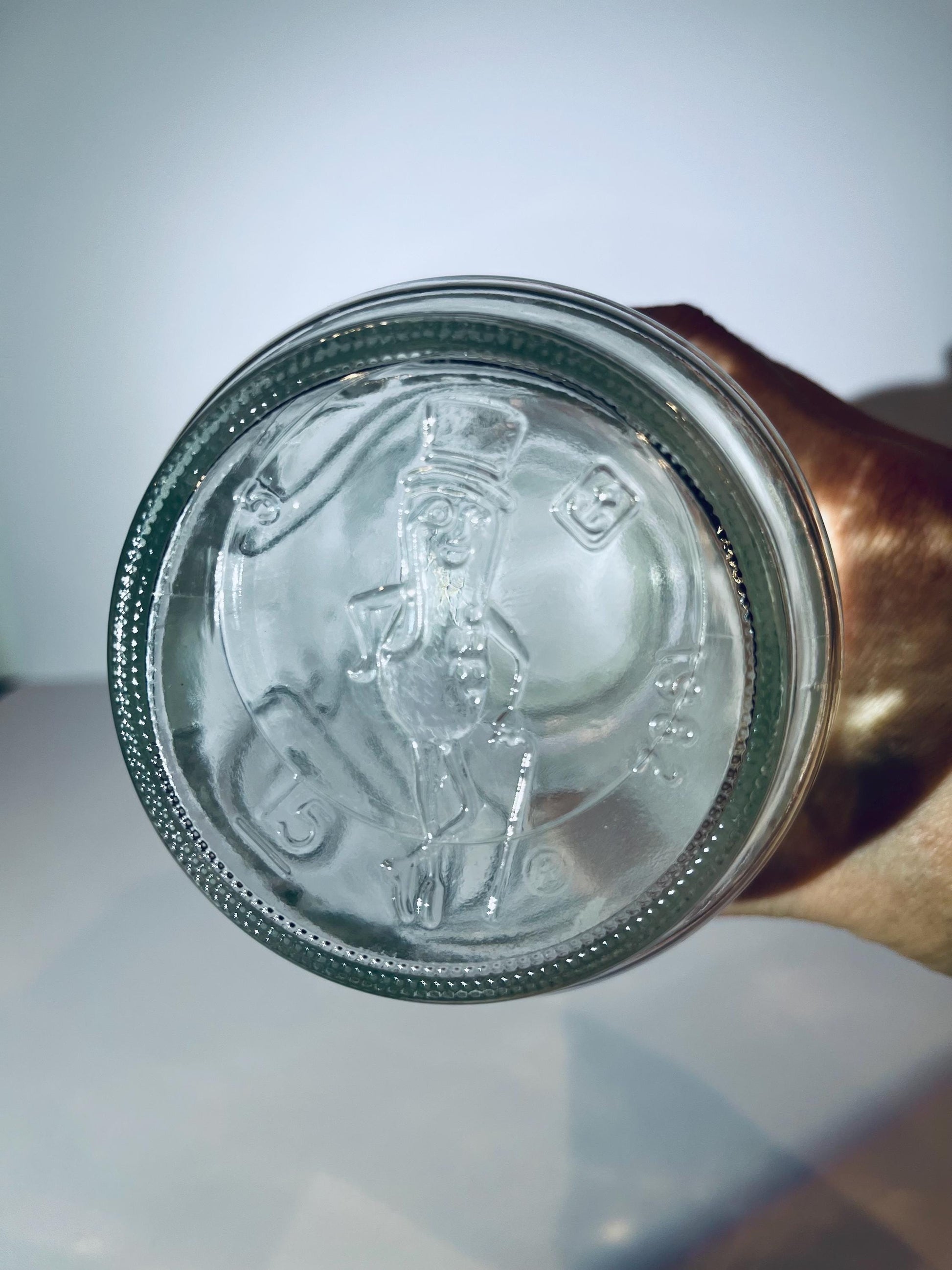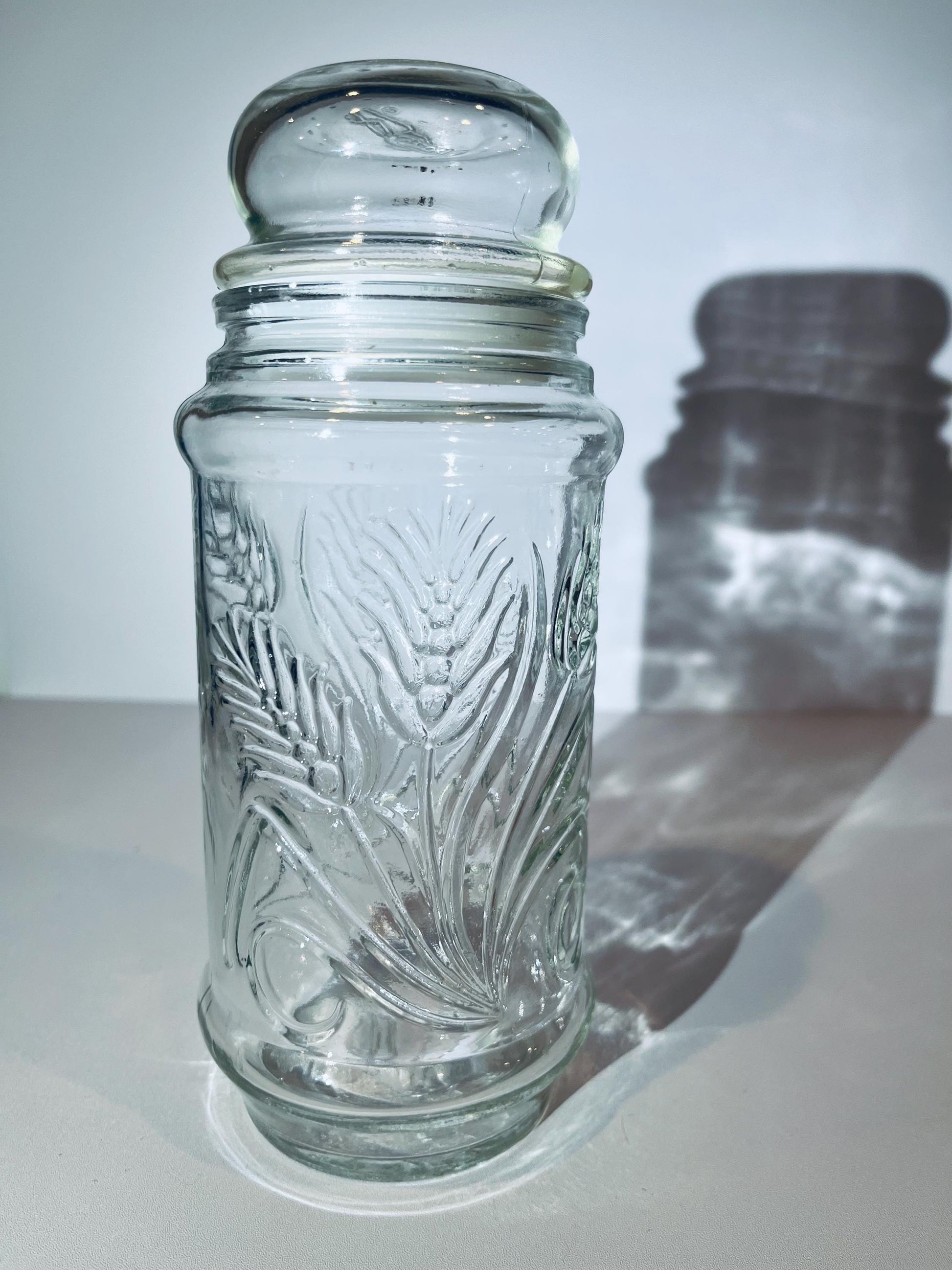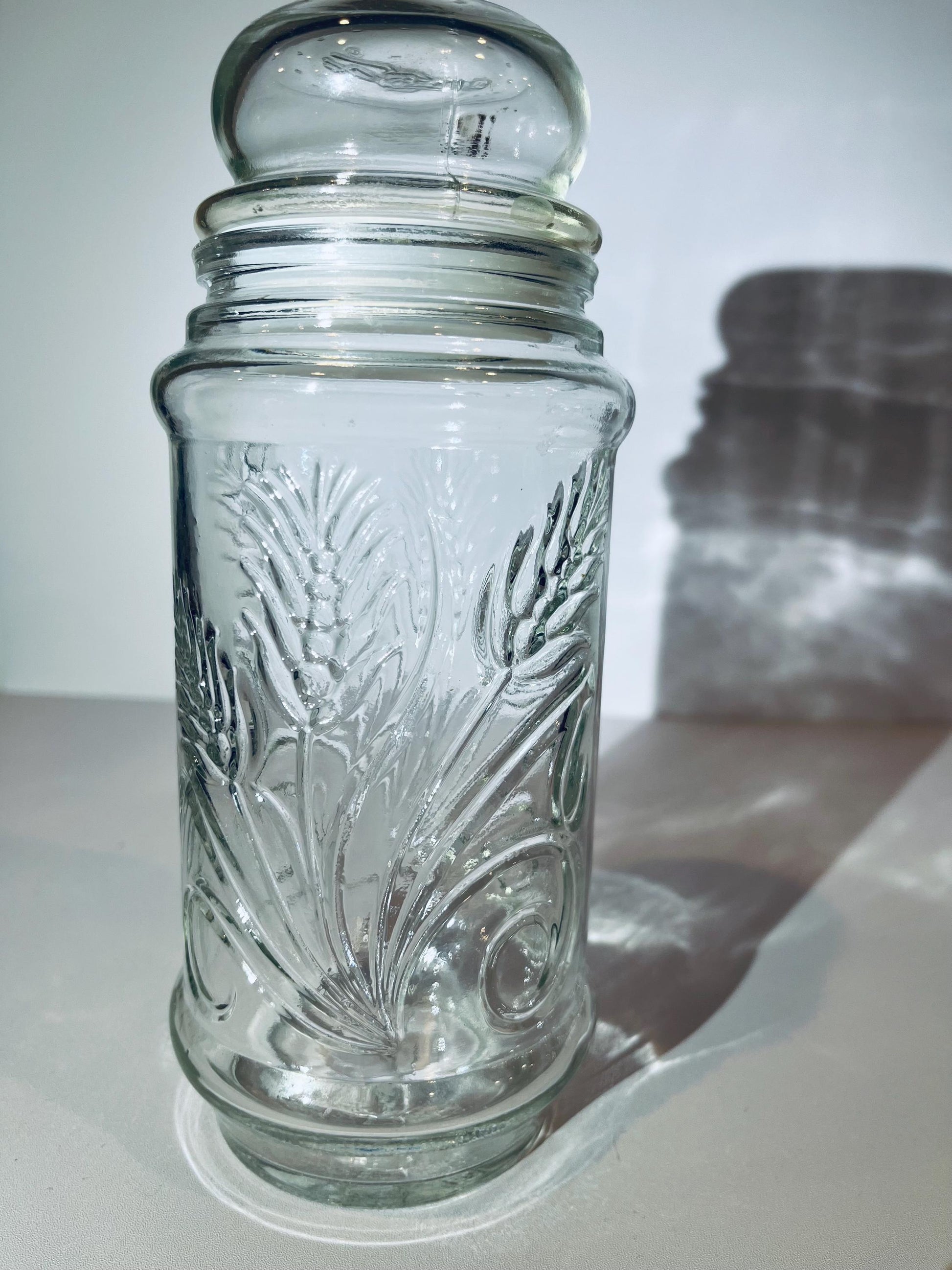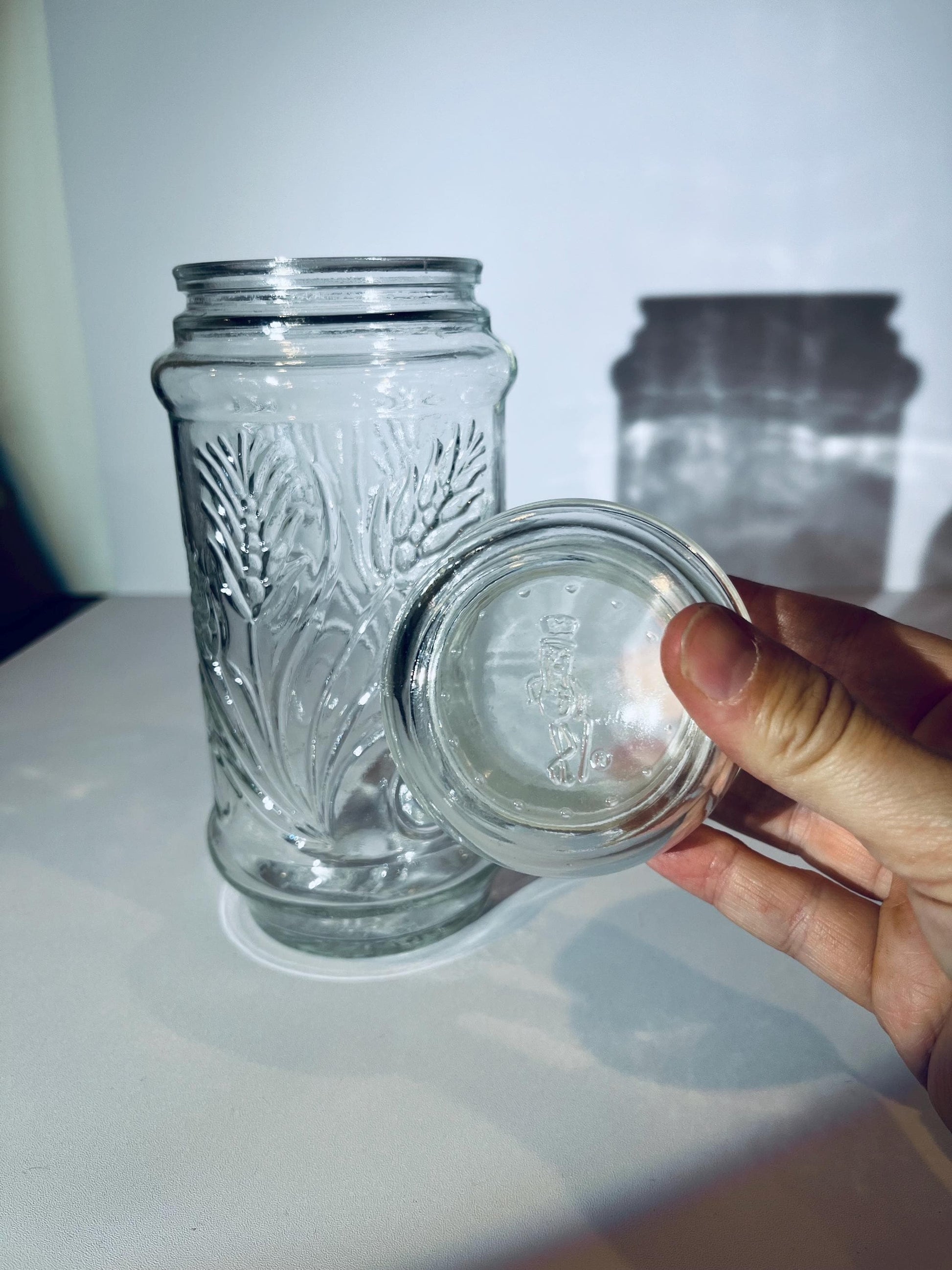 Vintage 1982 Mr. Peanut Anchor Hocking collectible glass apothecary jar. Wheat stalk pattern. Mr Peanut depiction on the top of the lid and on the bottom of the jar.