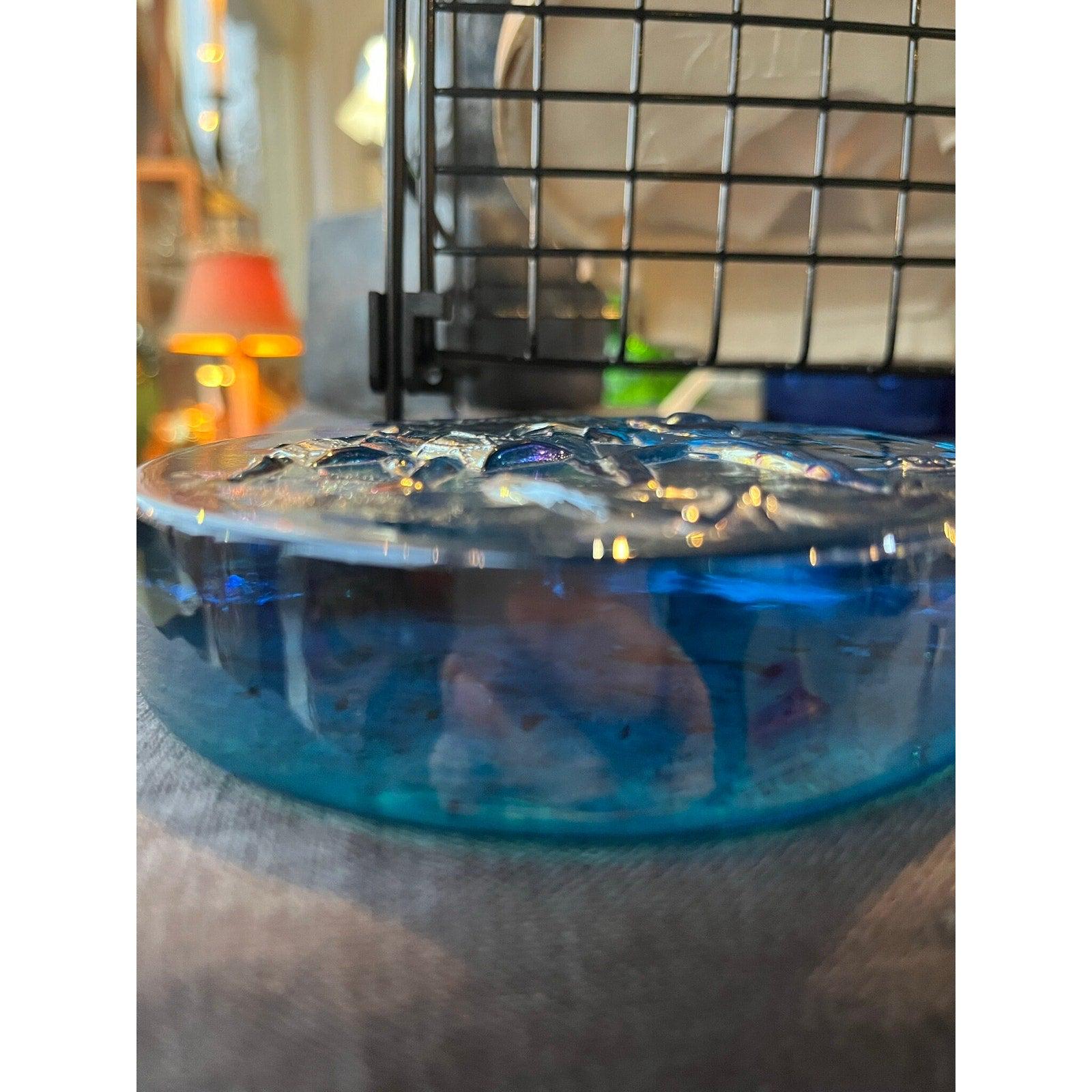 The iridescent glass handmade paperweight measures 4 1/4" x 1".