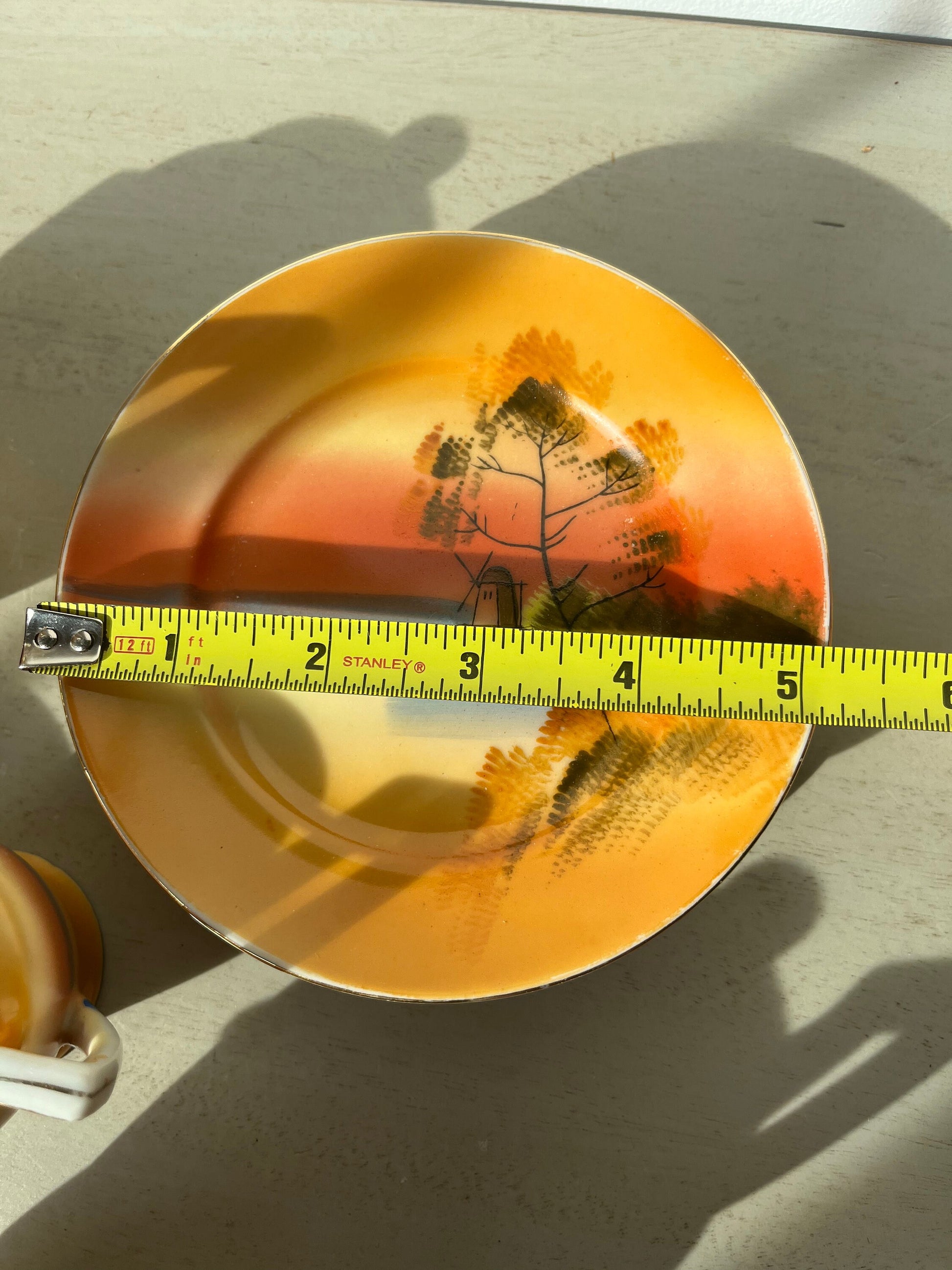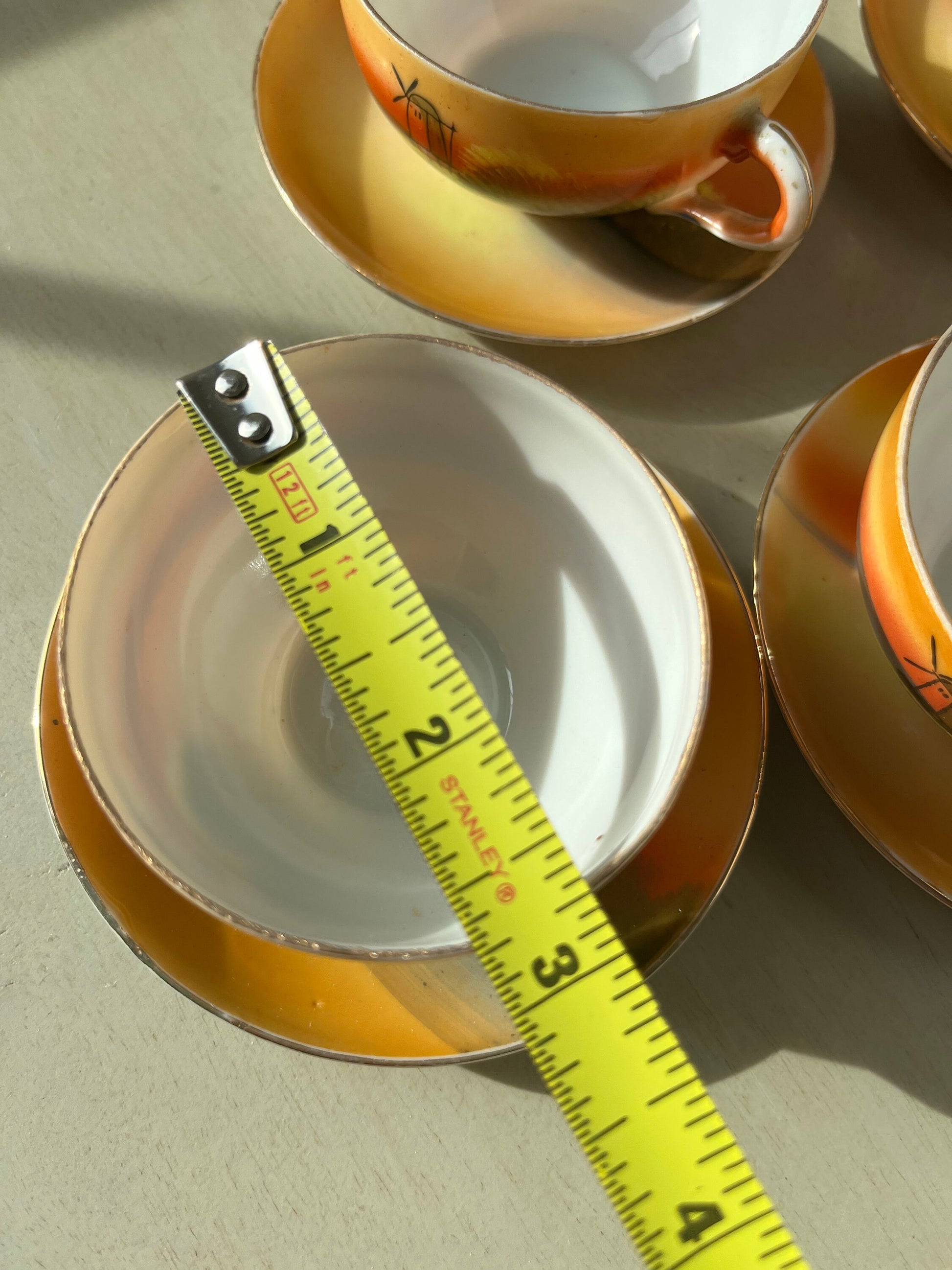 Vintage children‘s tea set in orange and yellow lusterware, depicting a windmill scene on each piece.