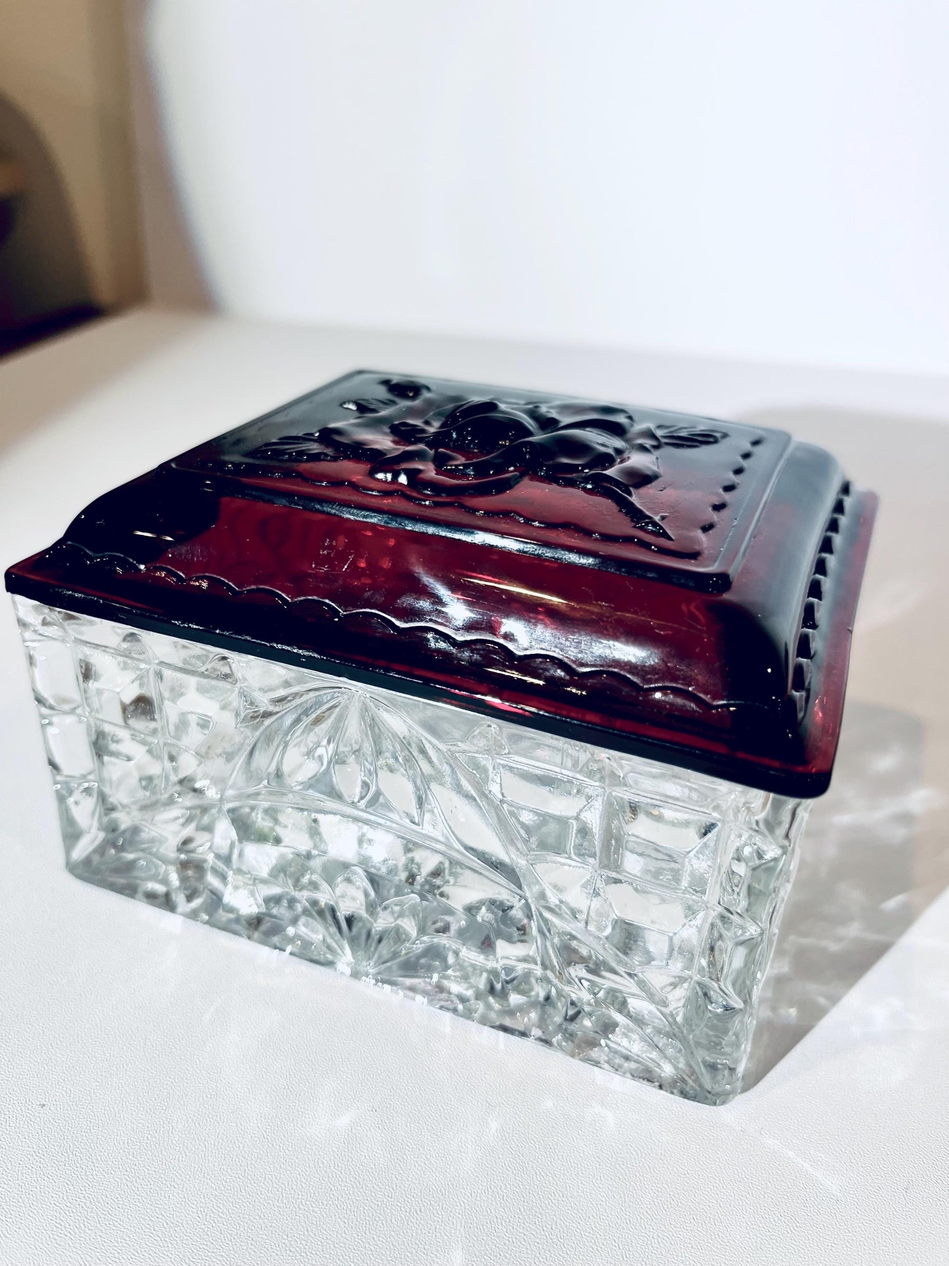 This is a gorgeous vintage ruby red and clear crystal glass jewelry / trinket box with rose on the lid.