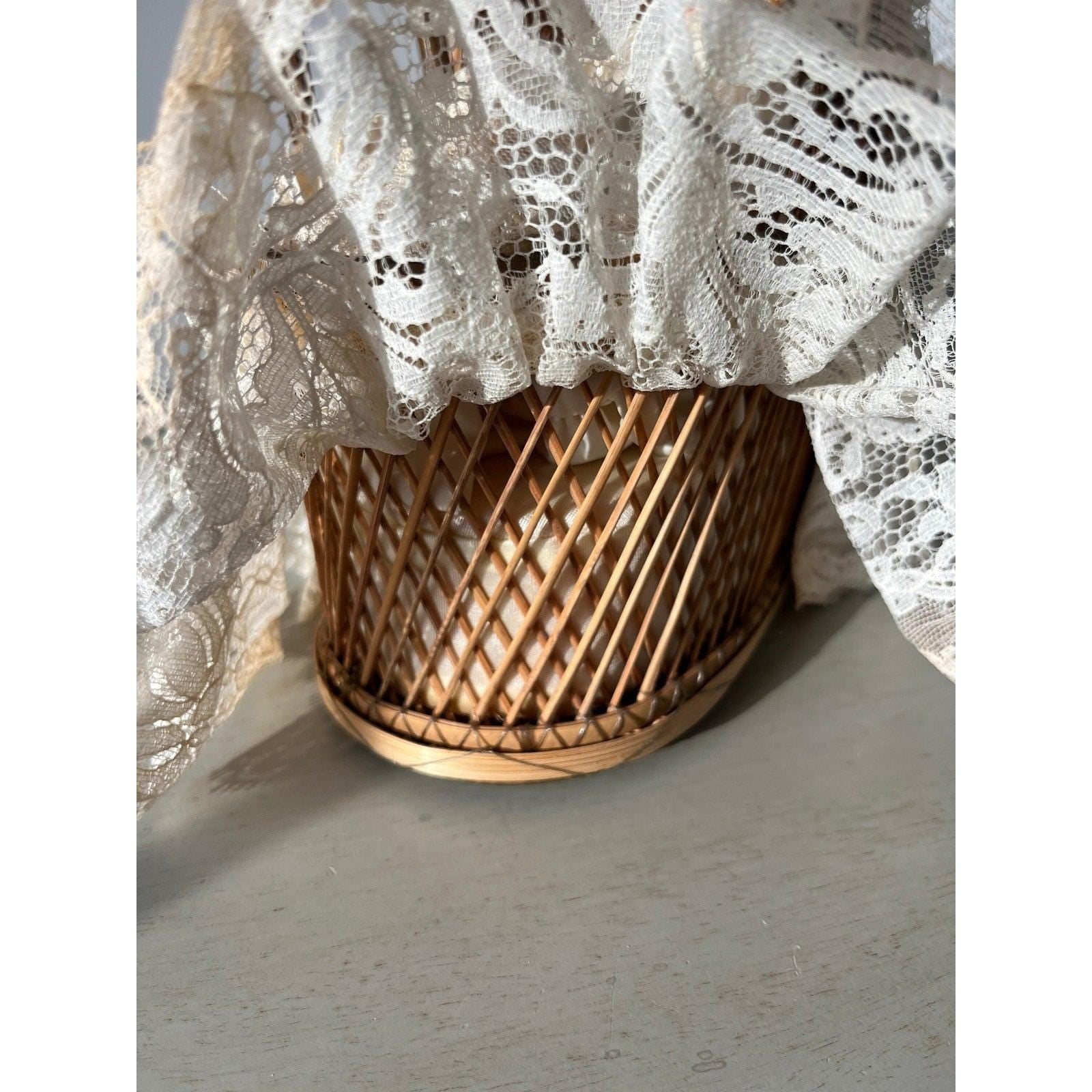 A lovely vintage doll wearing a lace gown and pearl necklace in a wicker basket with handles, decorated with lace, beads and ribbons.