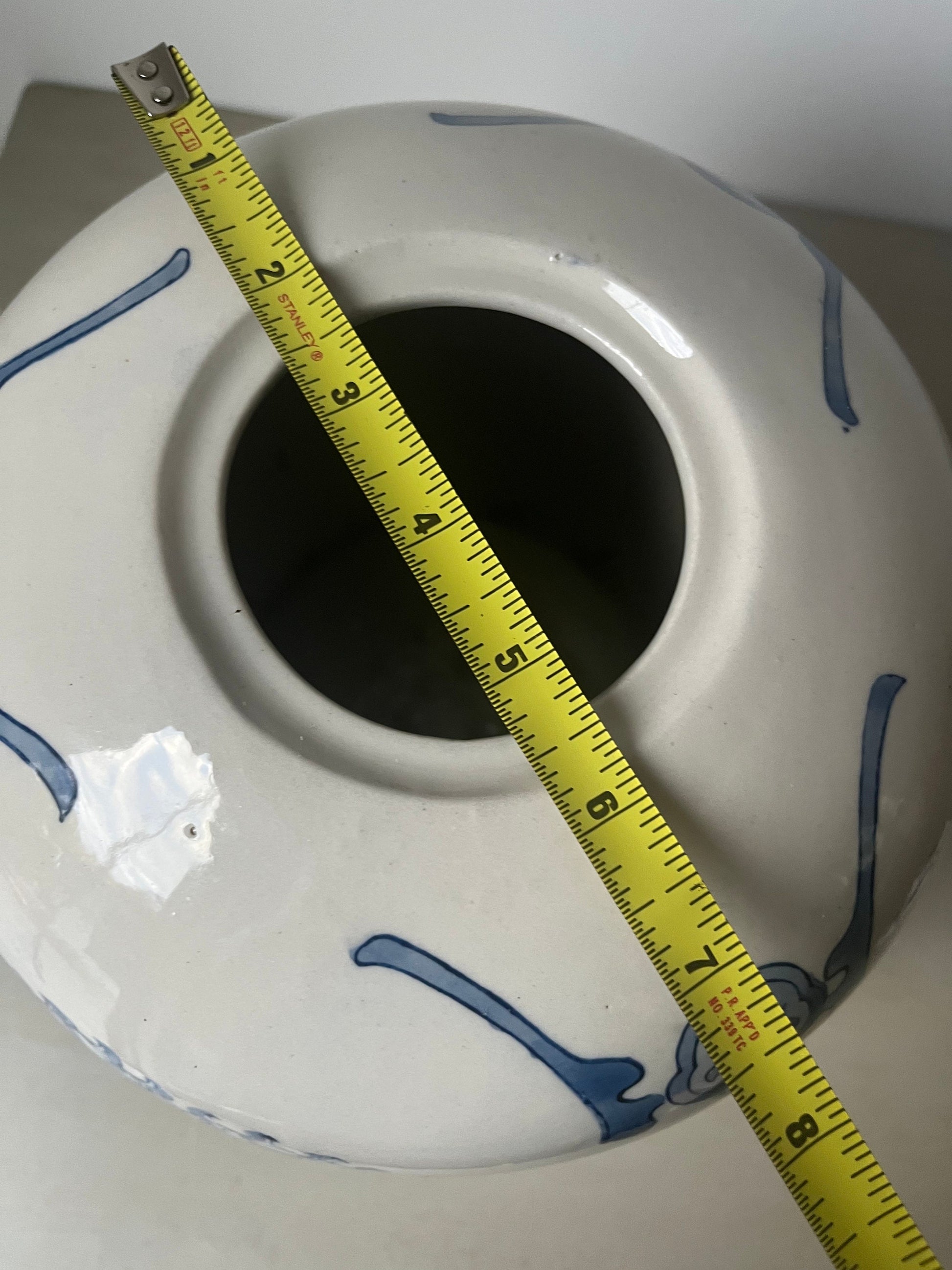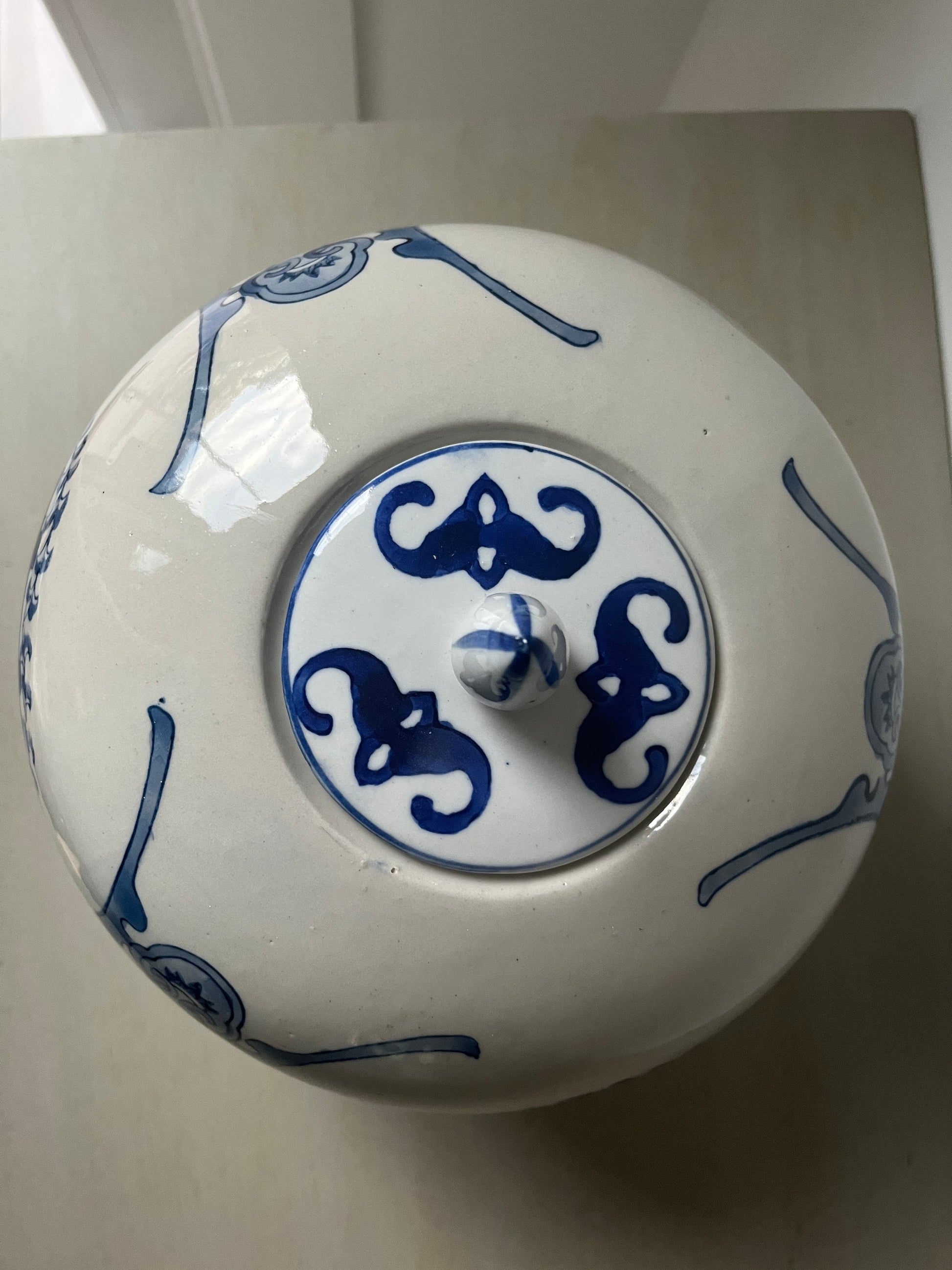 Vintage blue and white porcelain Chinese ginger jar or melon shaped vase / bulbous urn with a double happiness symbol front and back and a point lid. Mid 20th century.