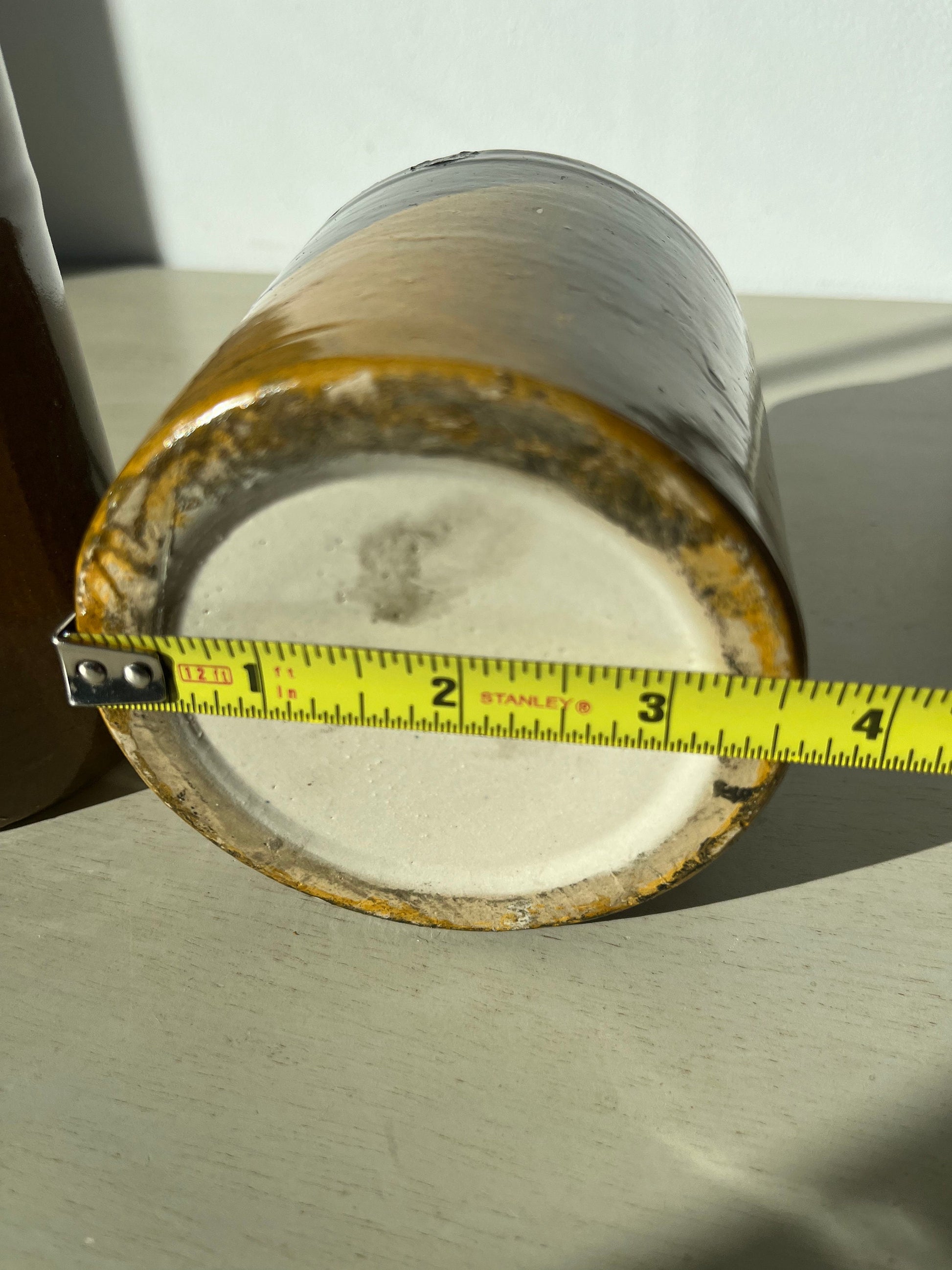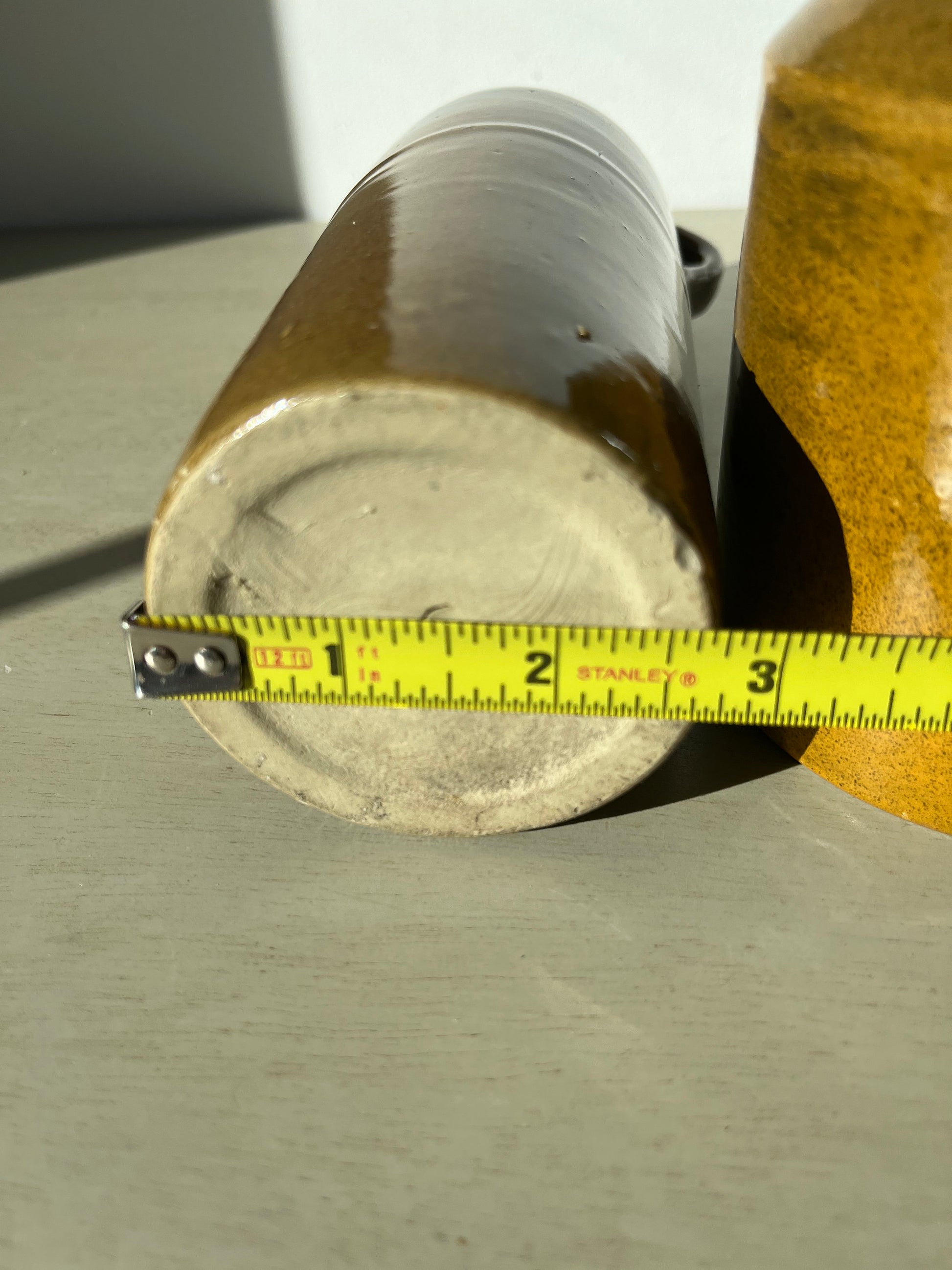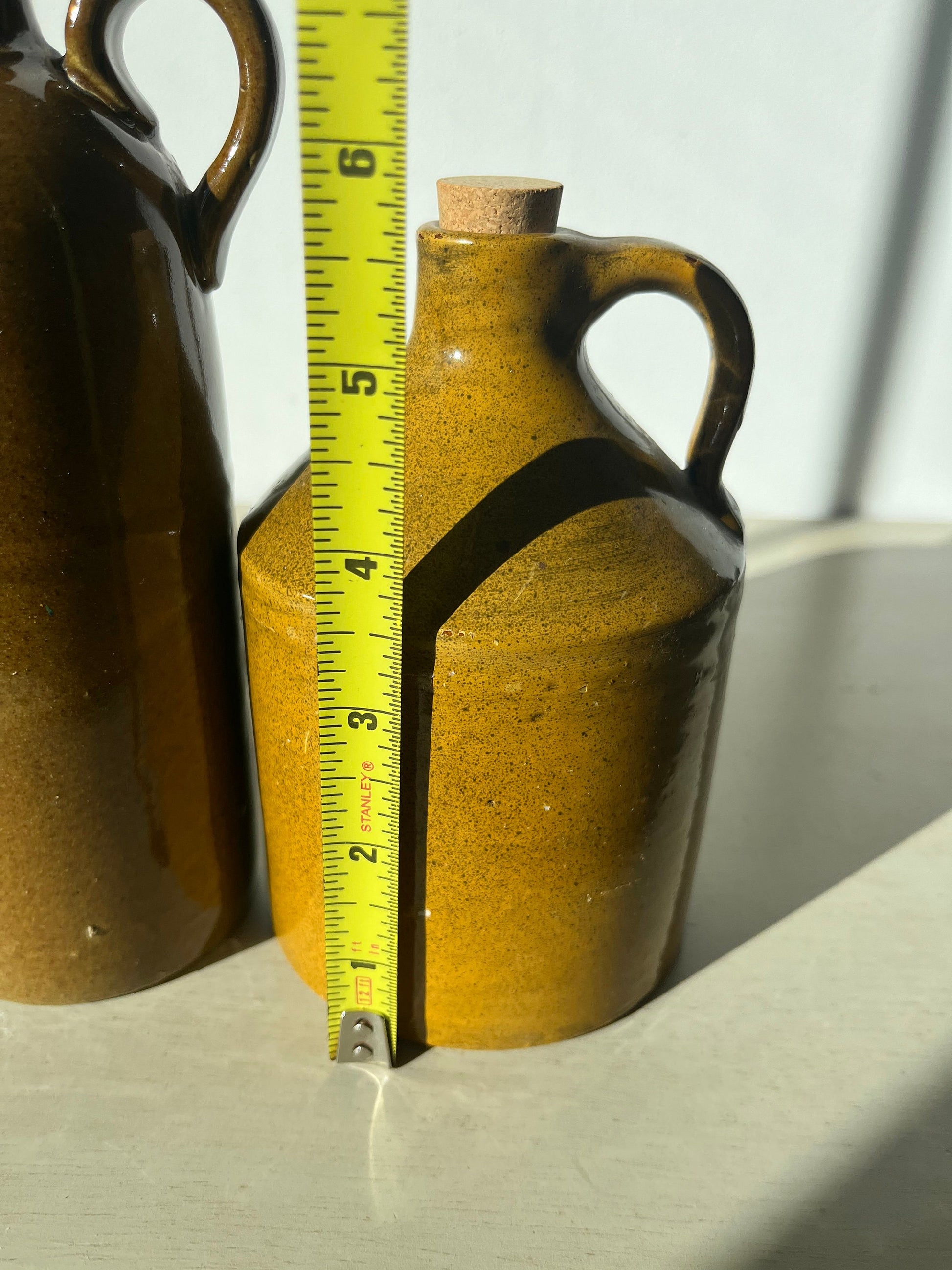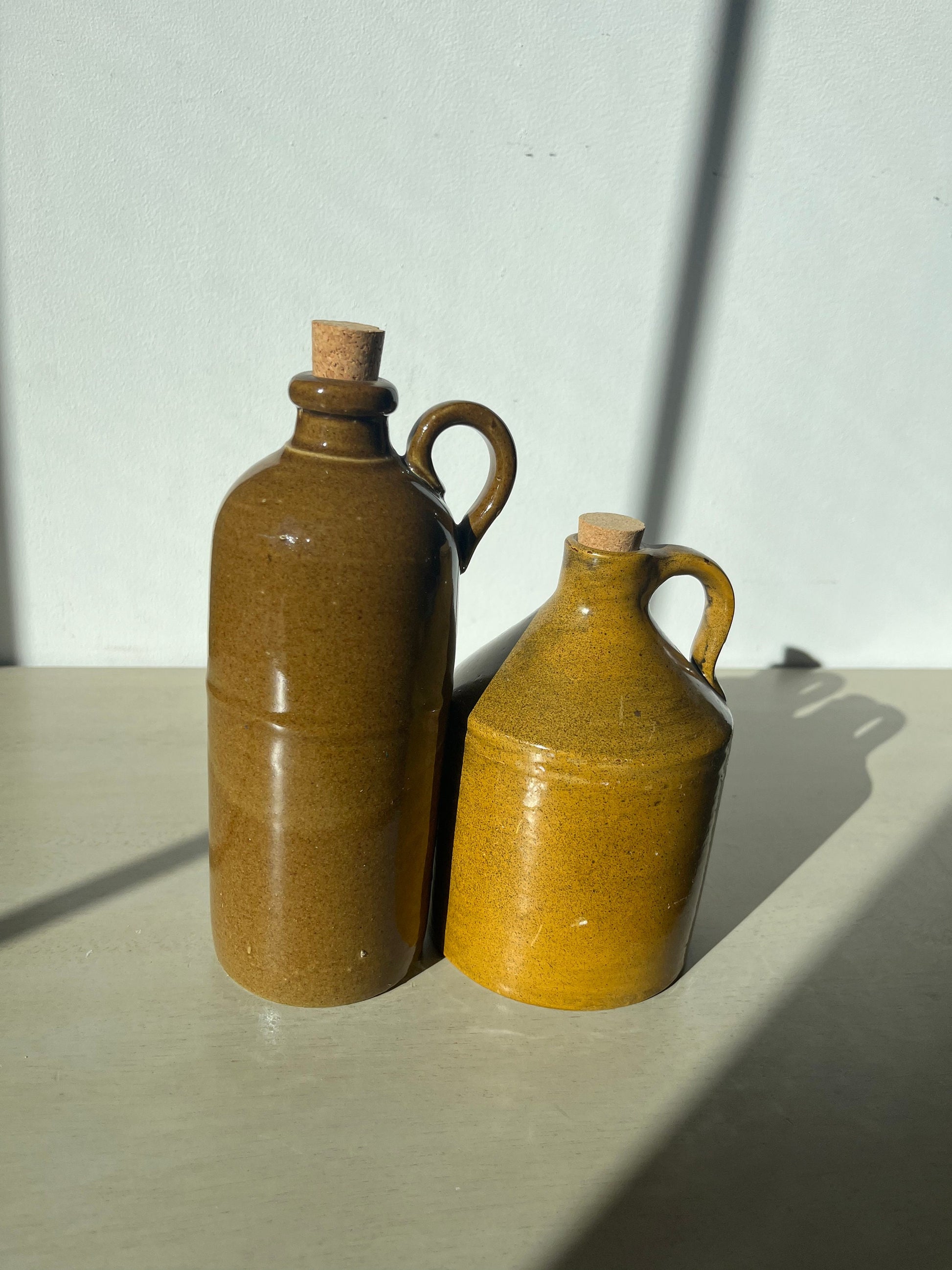 Gorgeous duo of vintage glazed pottery jugs / bottles! Single handle, cork stopper.