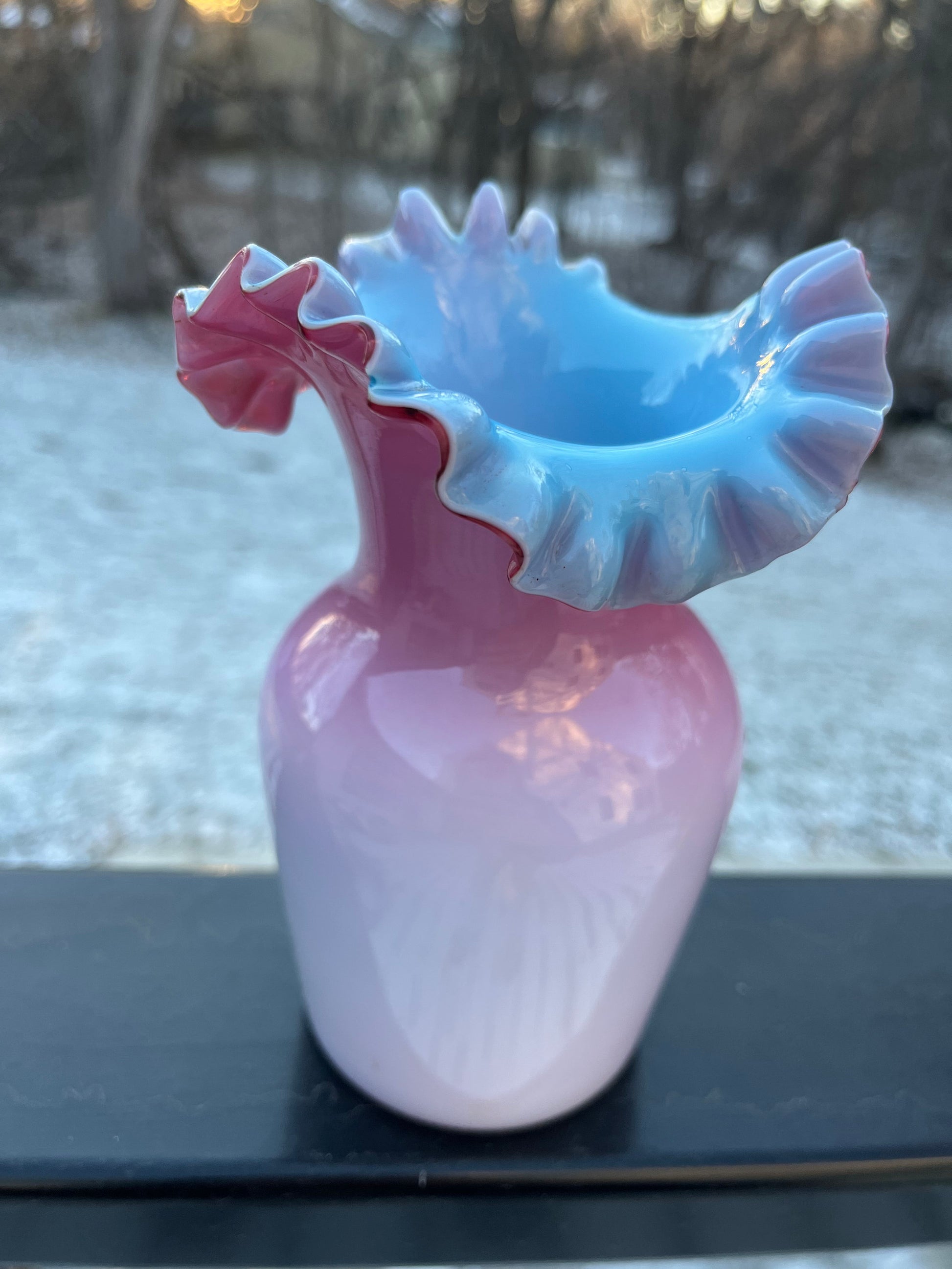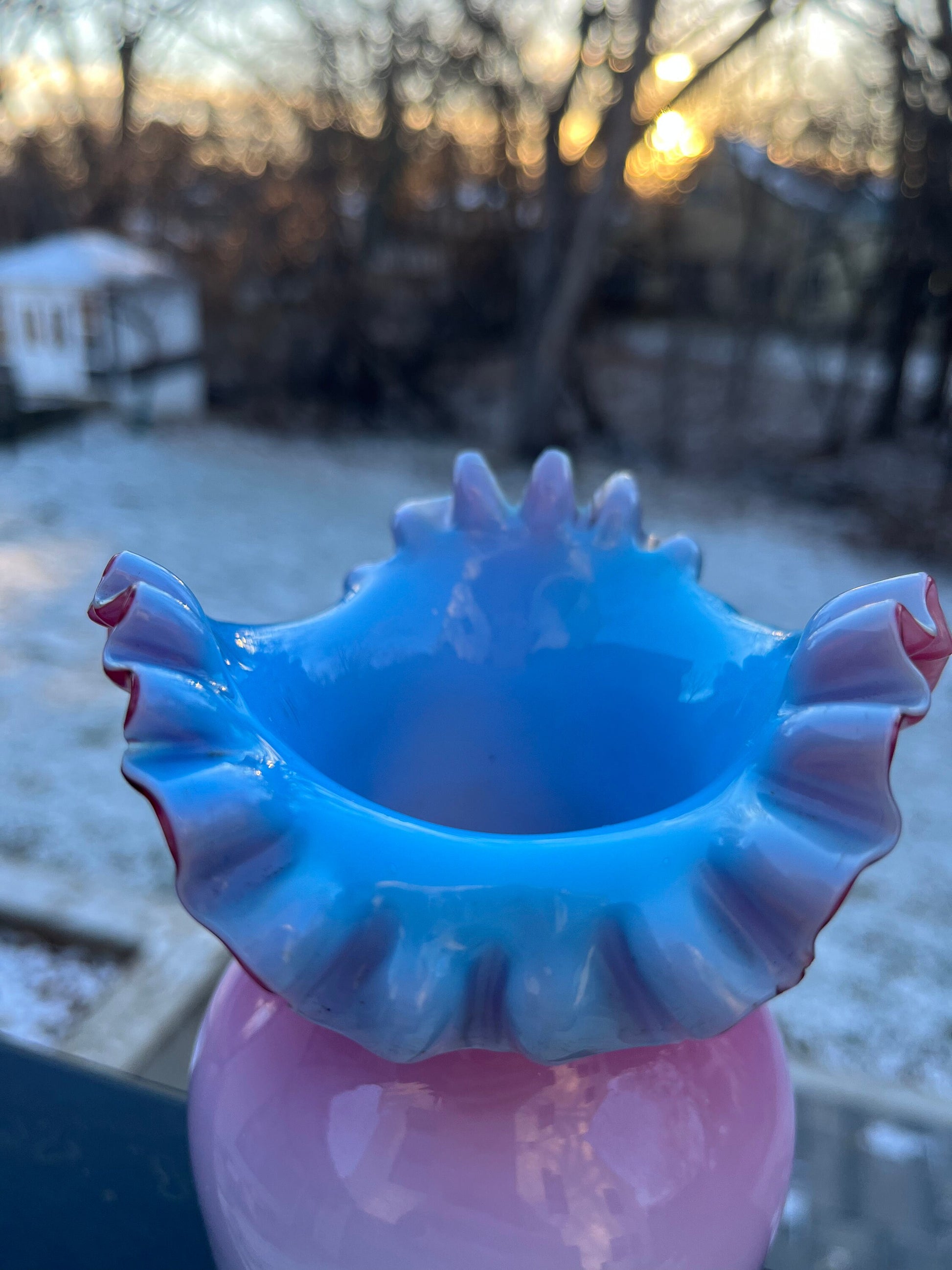 Gorgoes vintage Fenton art glass bud vase with a ruffled edge from the 1940s. Amazing vivid colors from the gradient pink body to the blue on the inside of the ruffled edge. Suck a wonderful piece!