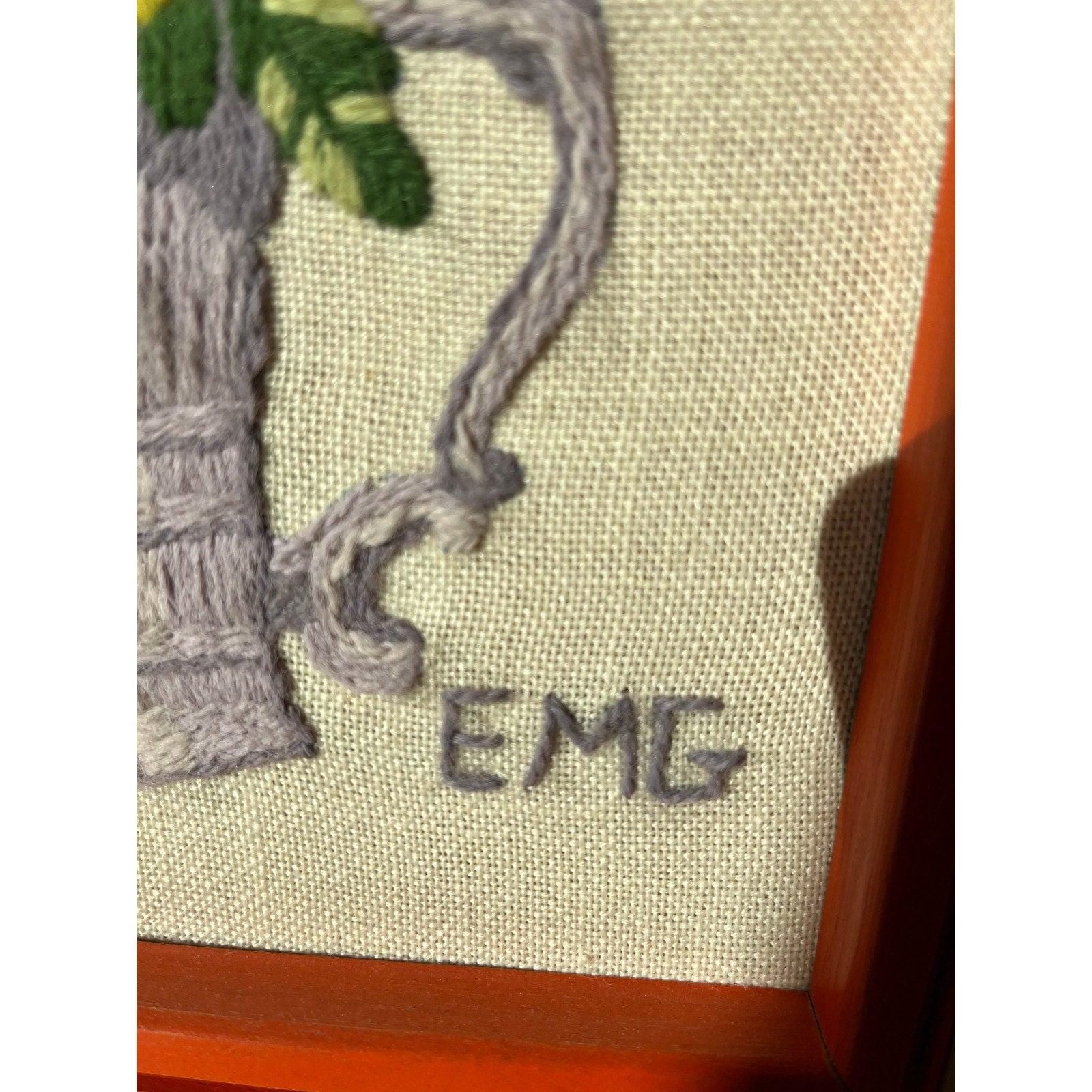 Beautiful vintage floral embroidery fiber art in red and gold frame. Lovely lilac colored vase filled with yellow and orange flowers.