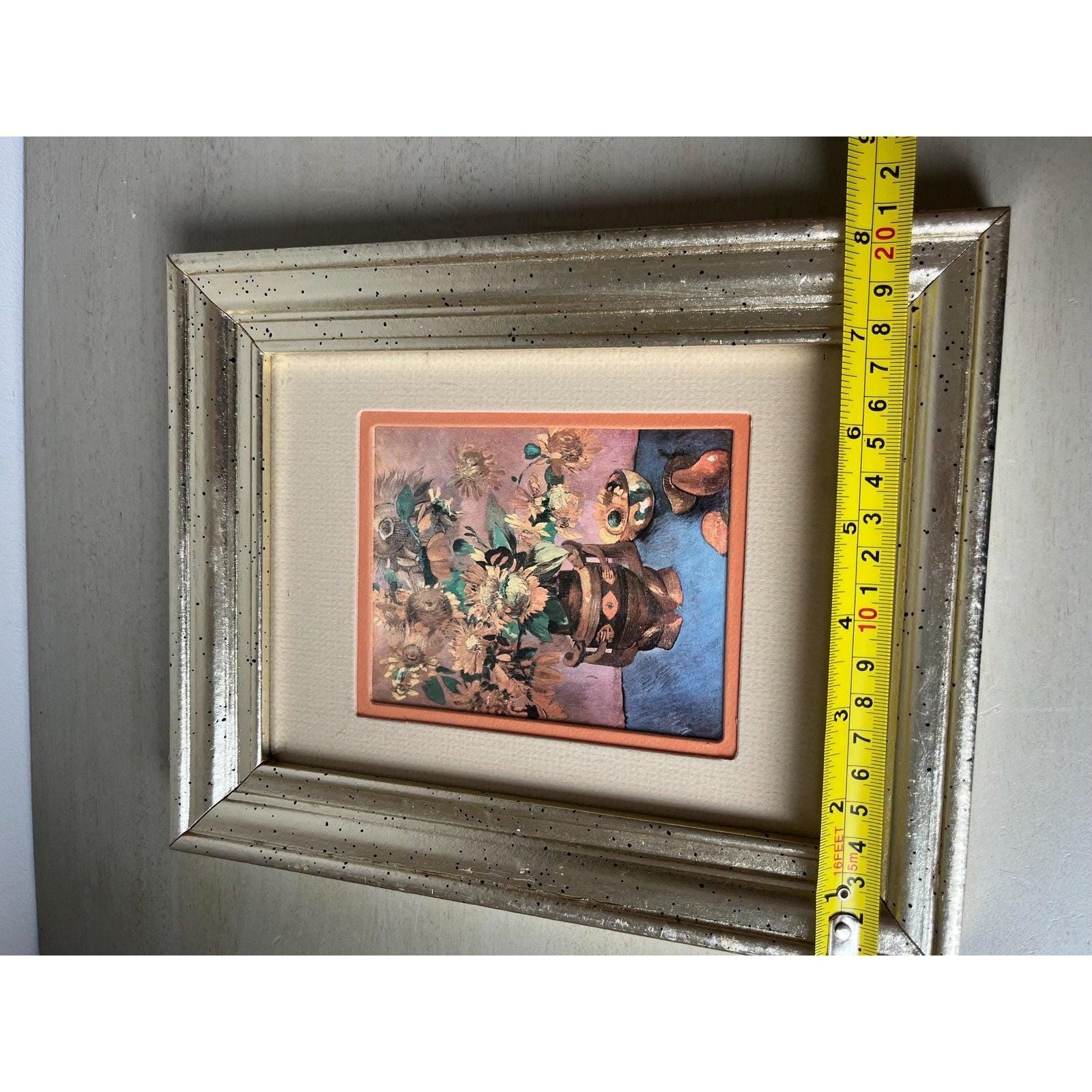 Lovely vintage floral print in a nice frame. Depicting a still life scene of a table with a bouquet of flowers in an interesting tribal vase, fruits, bowl.