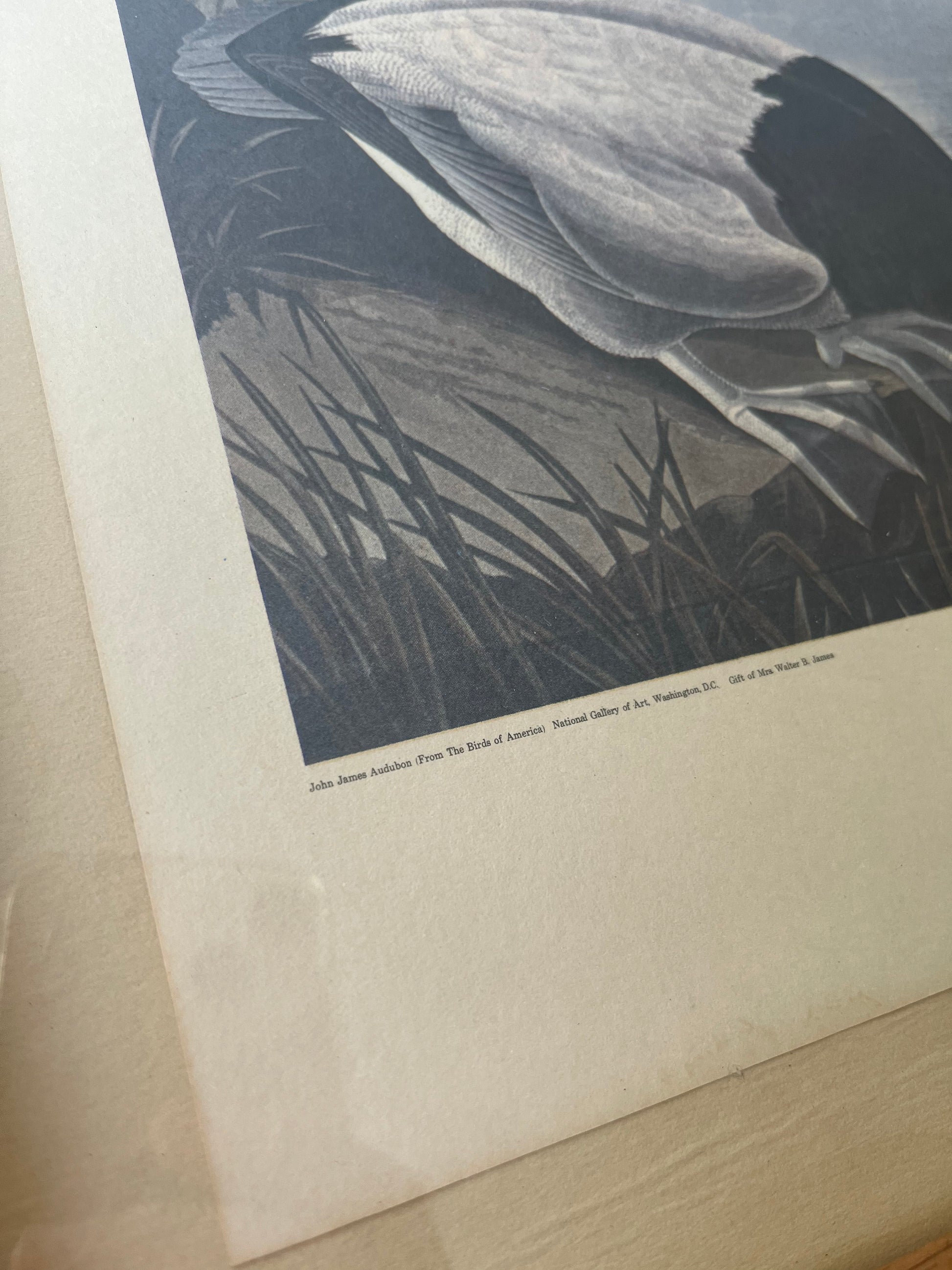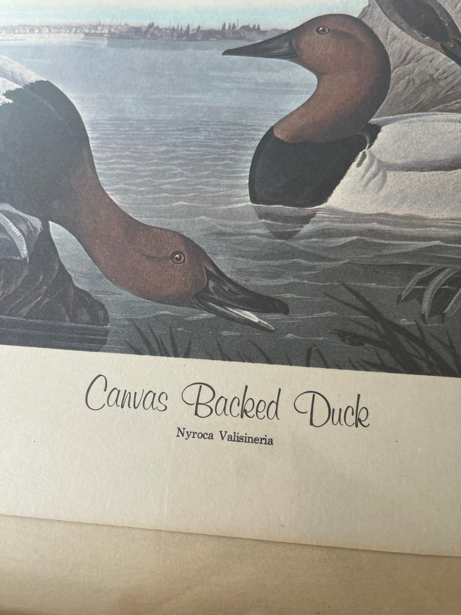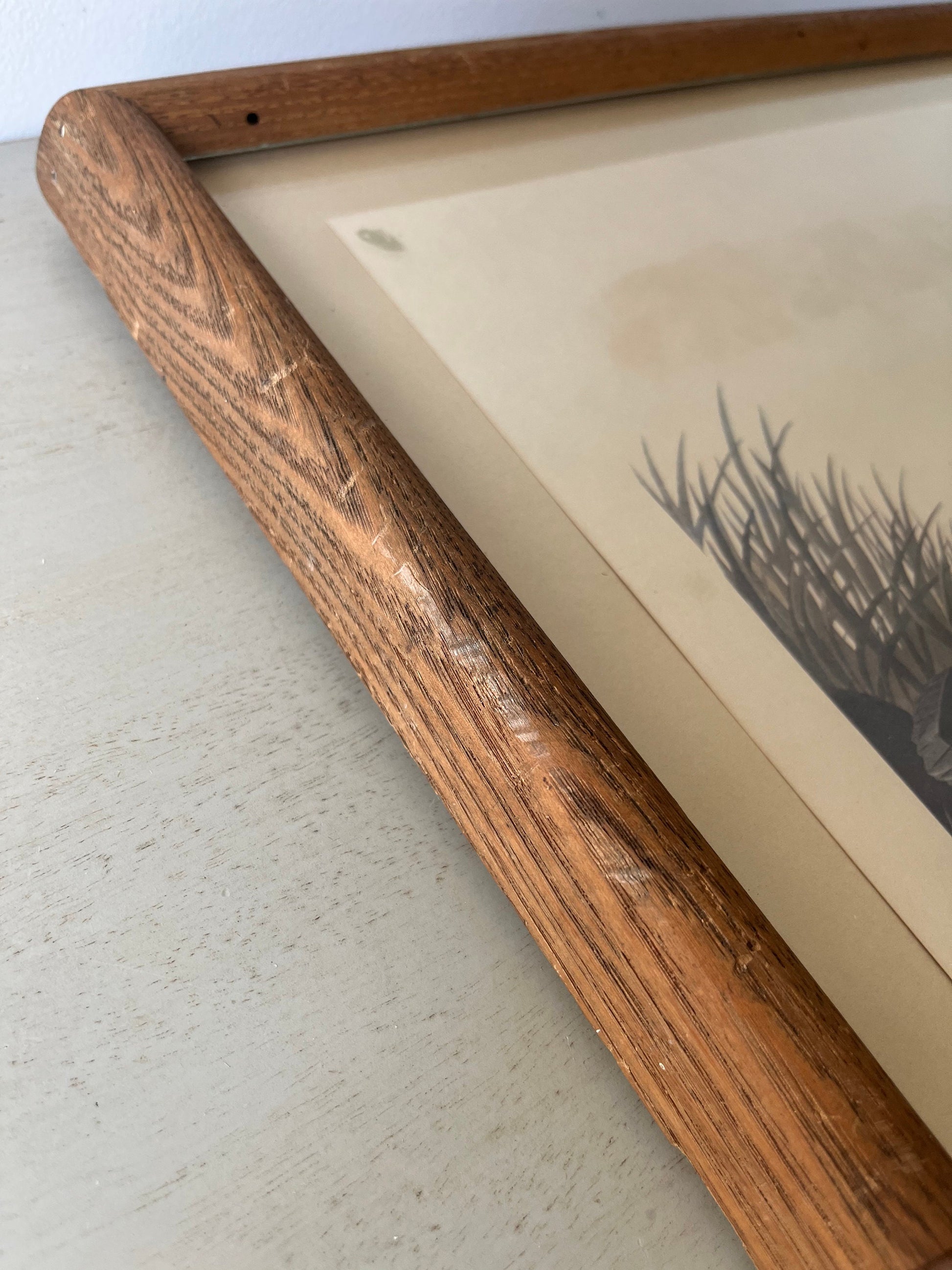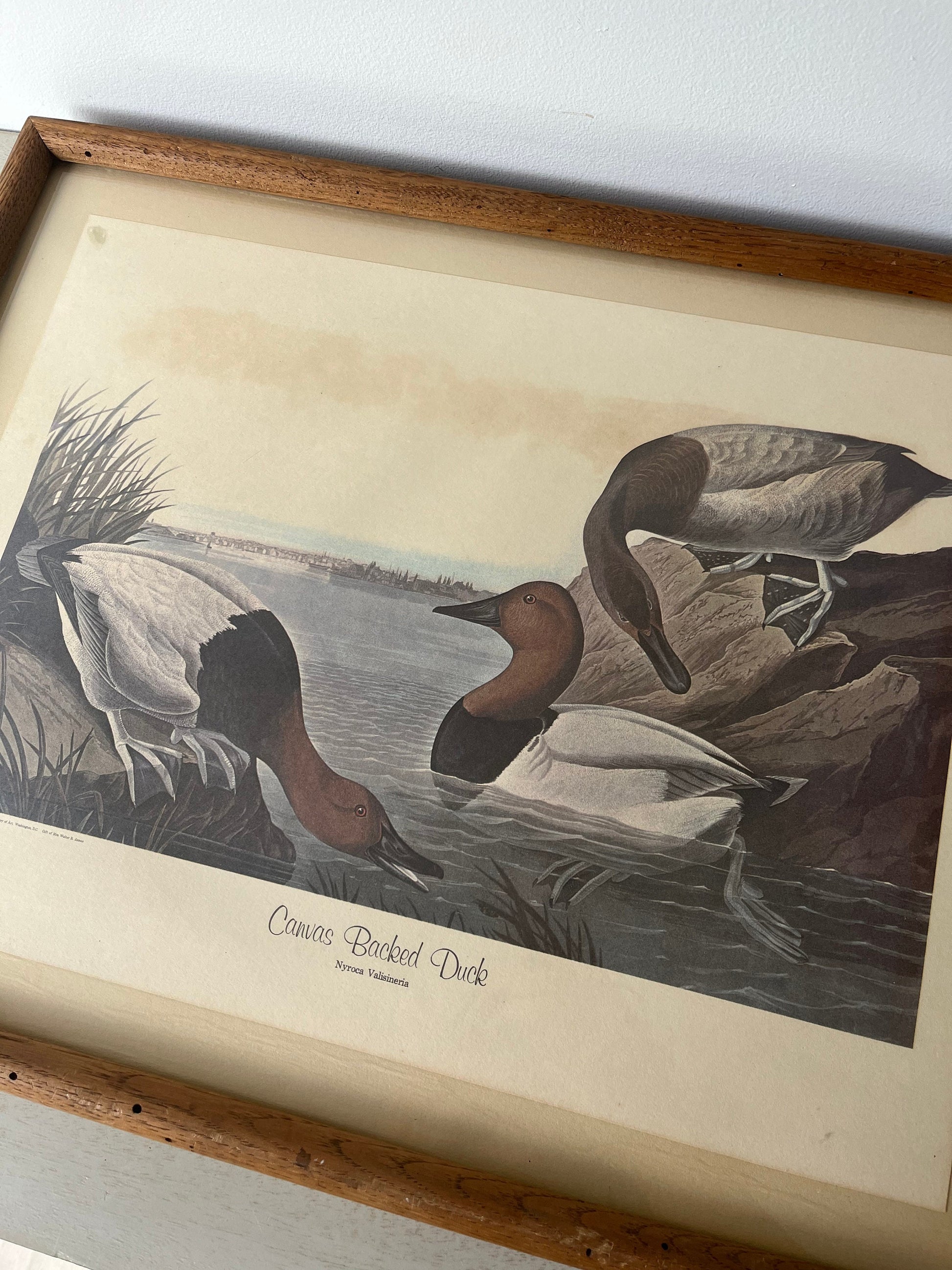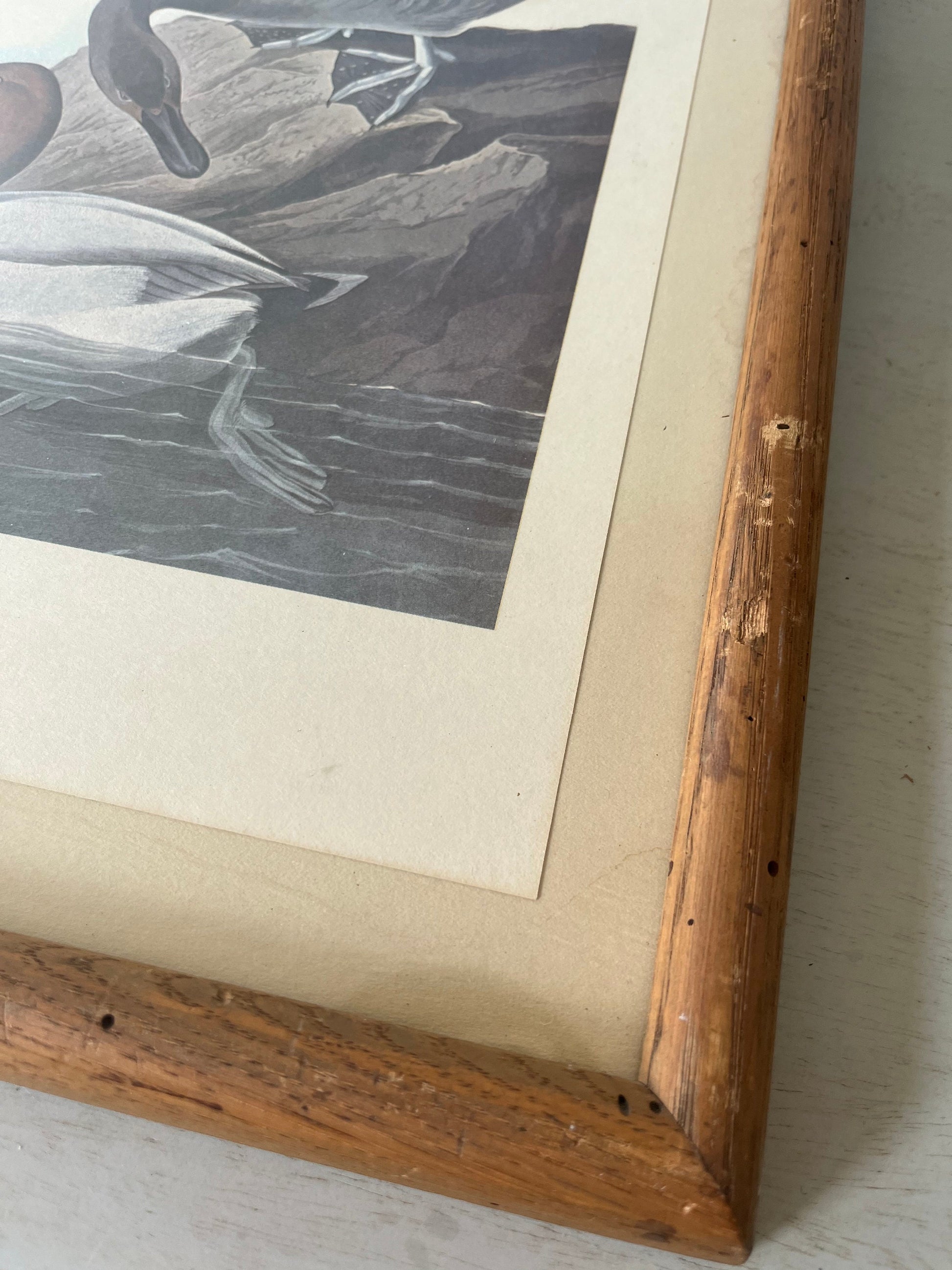 Beautiful wood framed vintage art print of Canvas Backed Duck, 1836, by John James Audubon (From the Birds of America). The wood frame has aged beautifully, though it is in a fragile condition and might require a little fixing upon arrival (a nail or two for it to hold together).