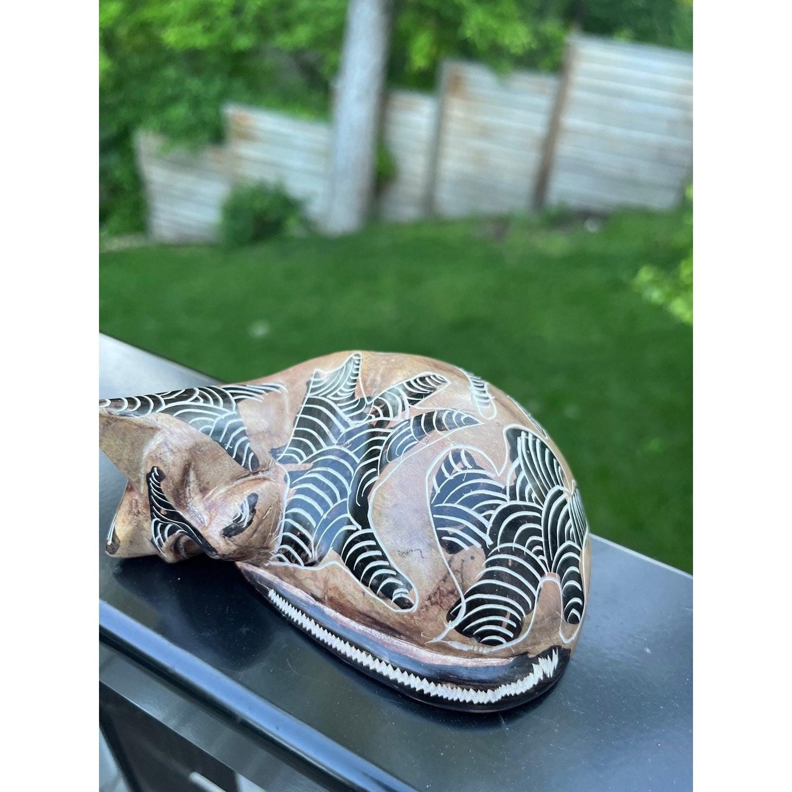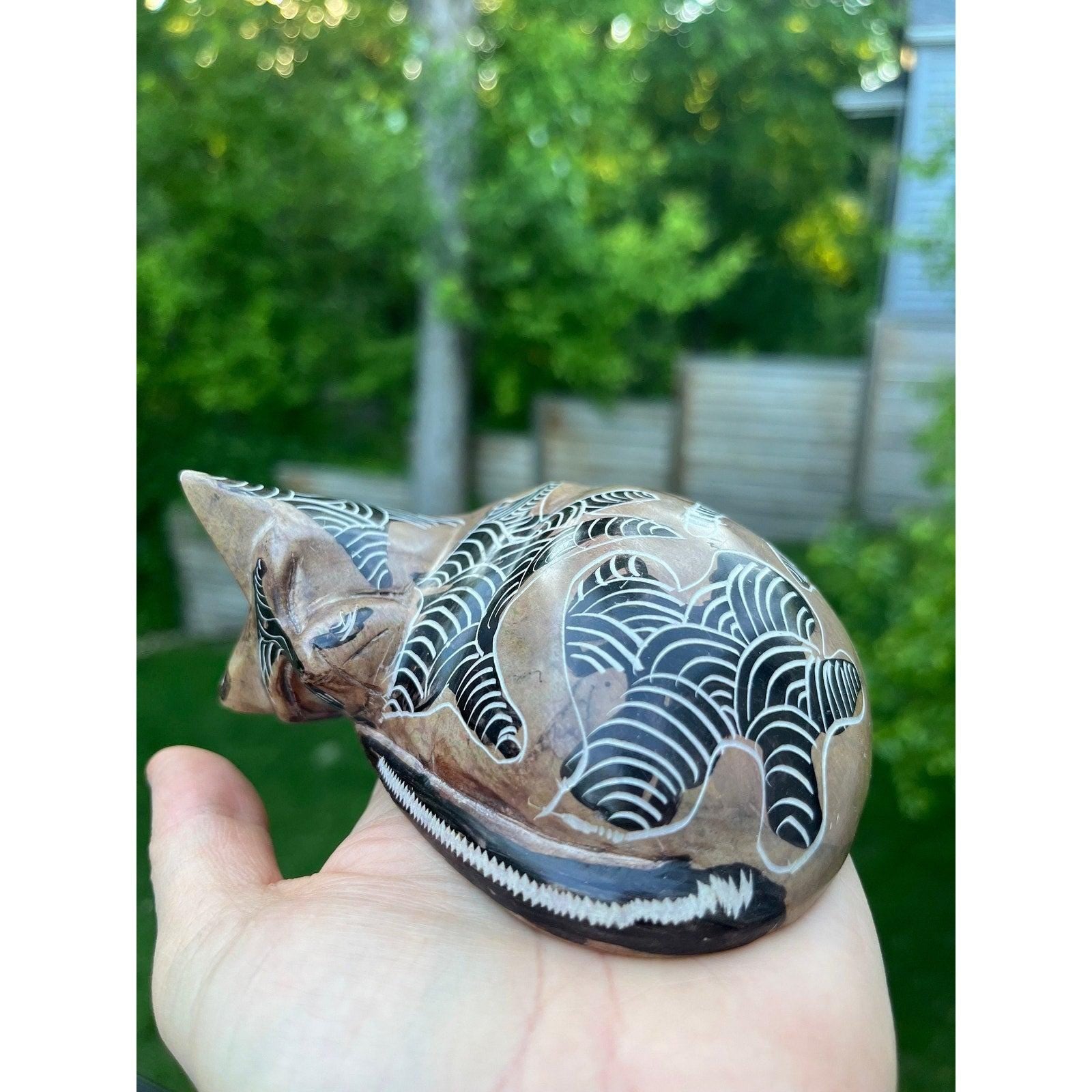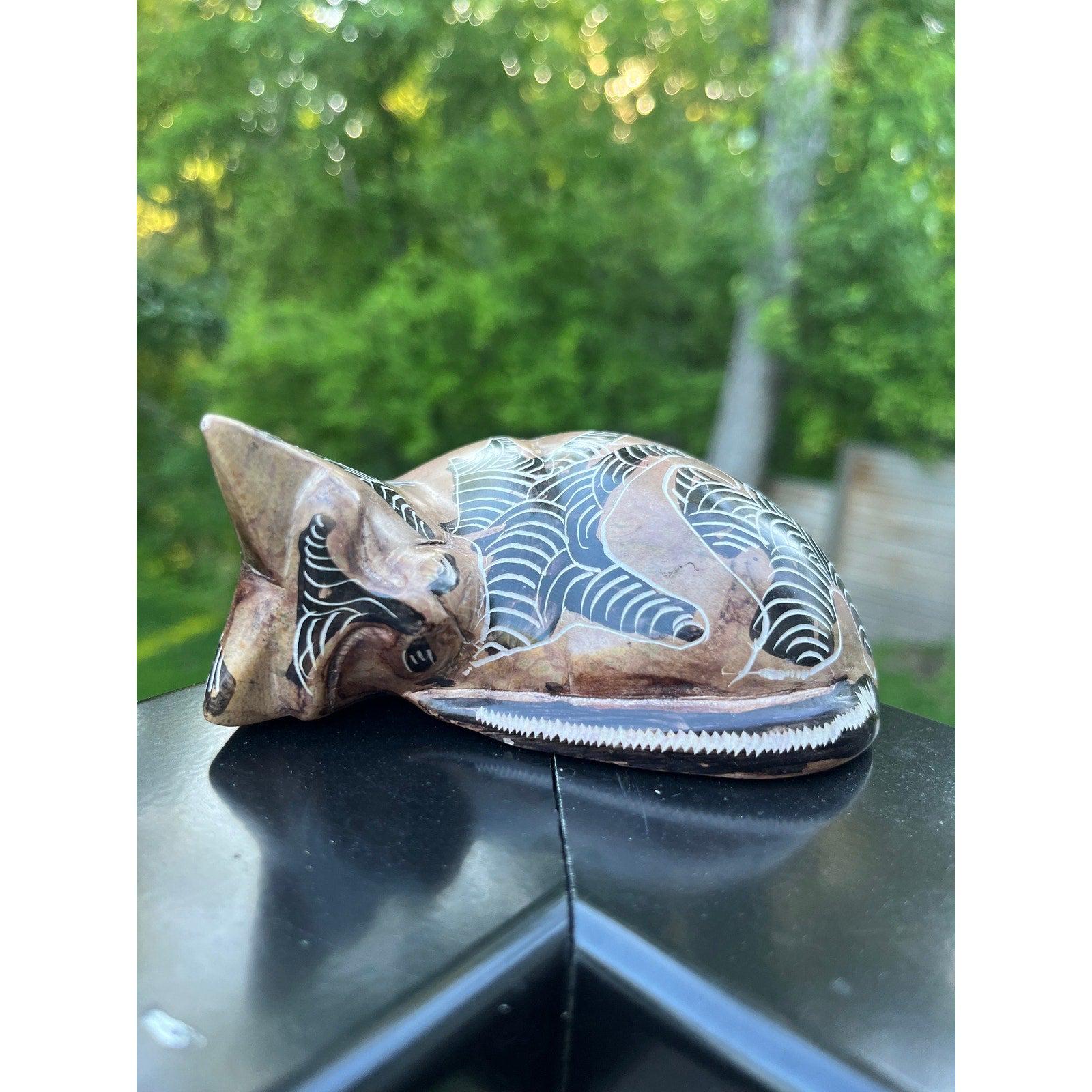 Delightful hand carved sandstone sleeping cat figurine with hand painted decoration. Most likely originating from Kenya.