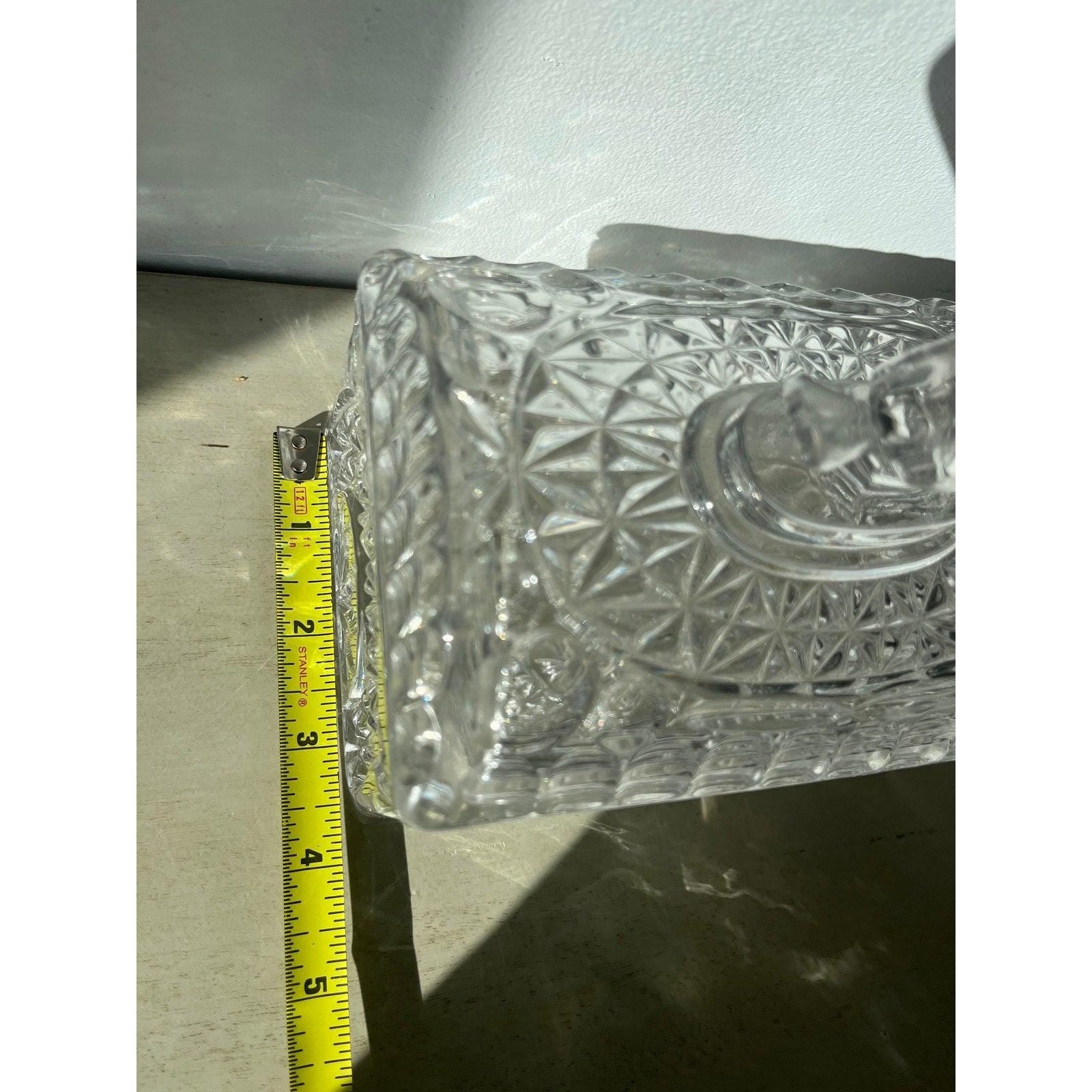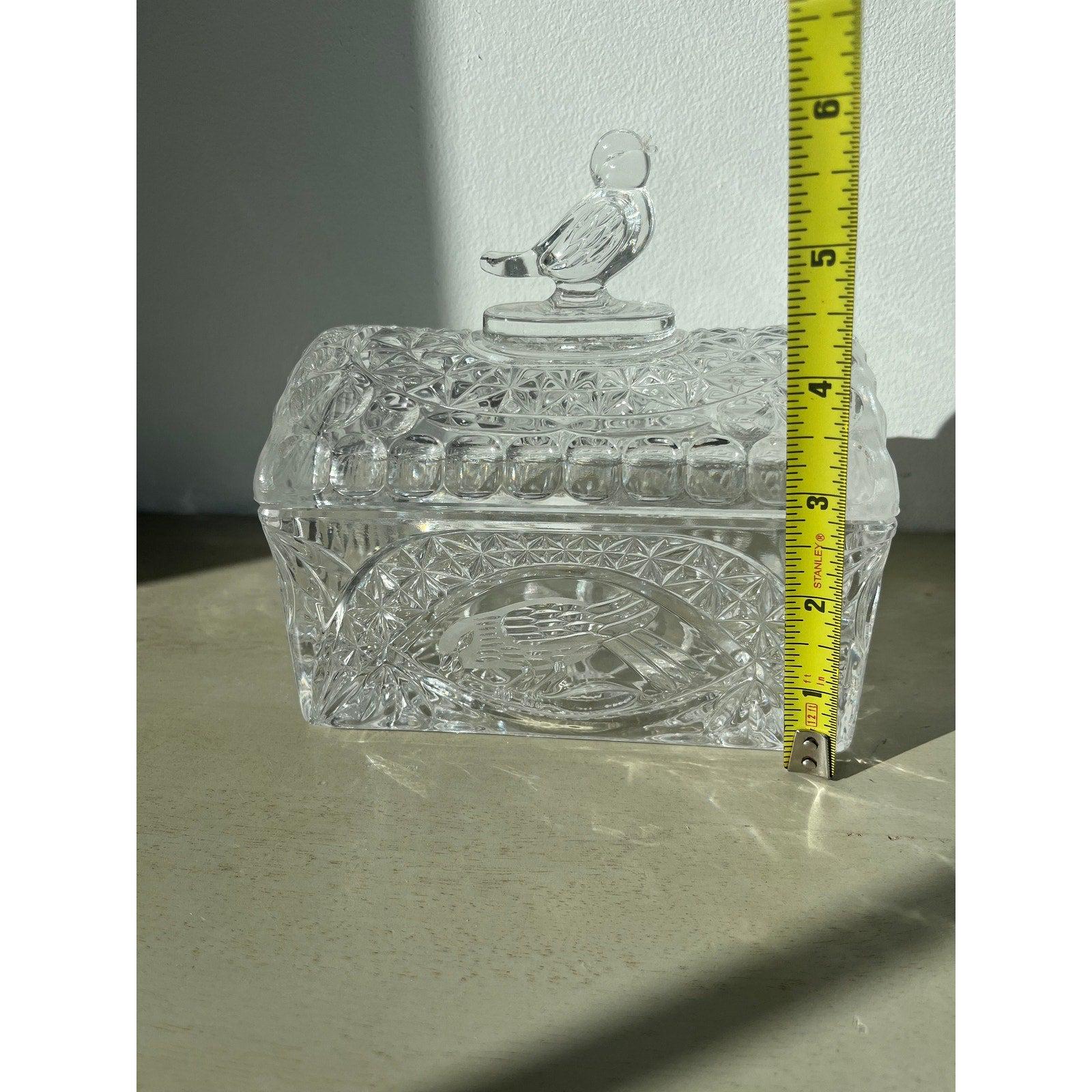 This is a gorgeous heavy lead crystal trinket box with a lid from the ‘Byrdes‘ collection by Hofbauer. Birds are etched on each long side of the box and one glass bird is perched on the lid. Made in West Germany.