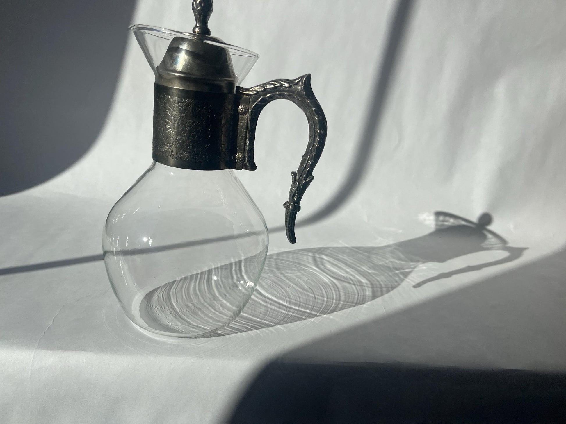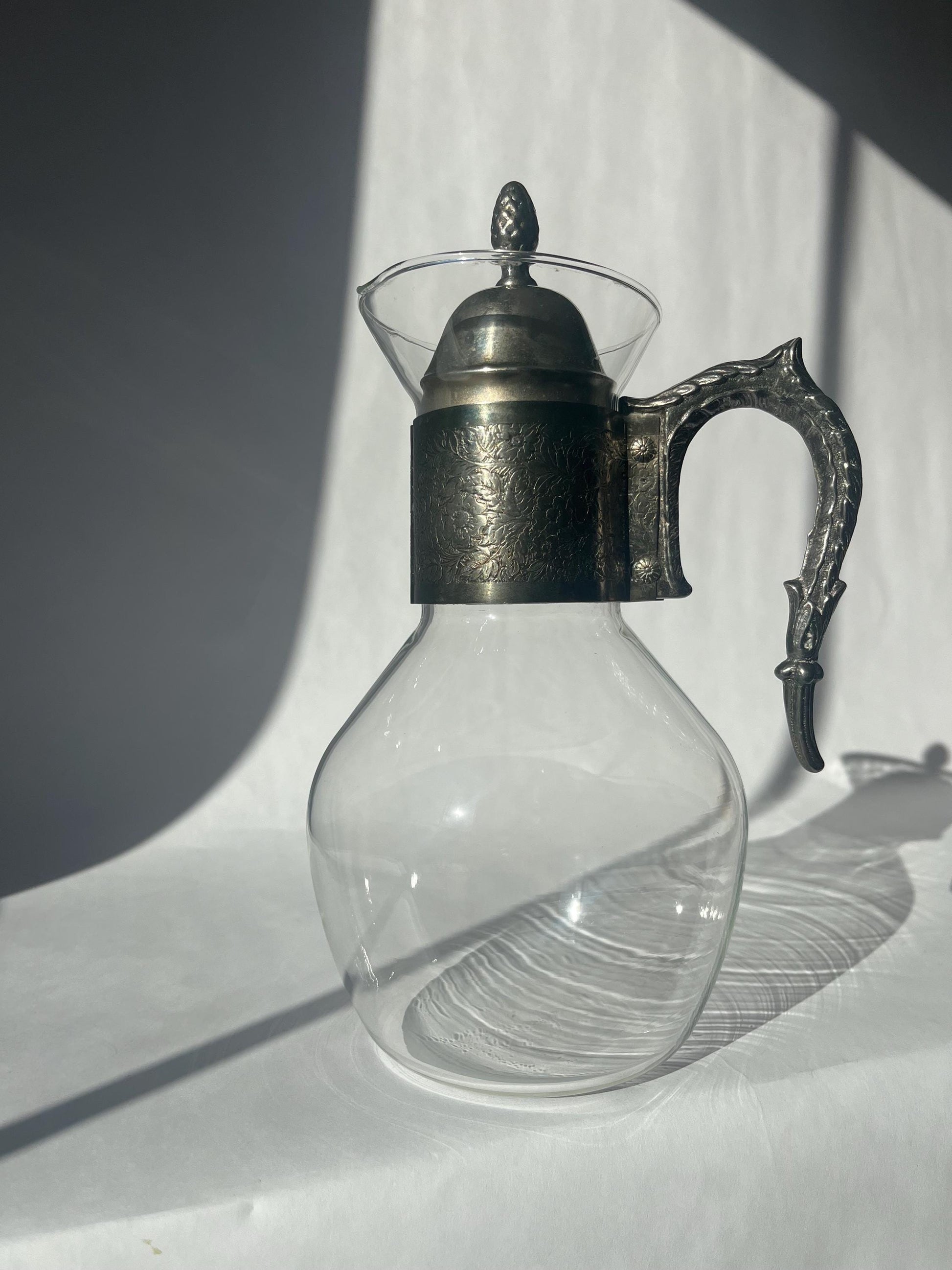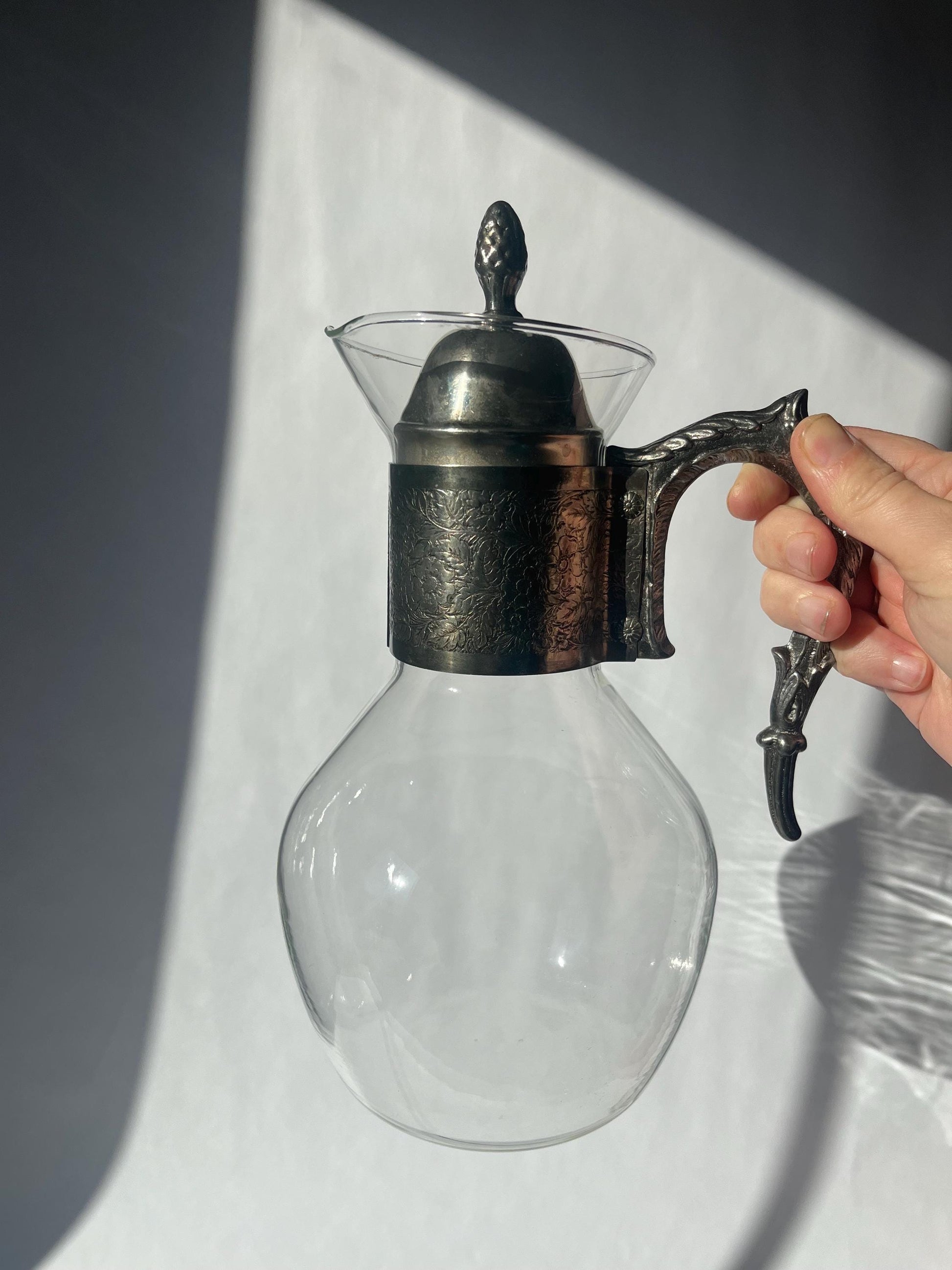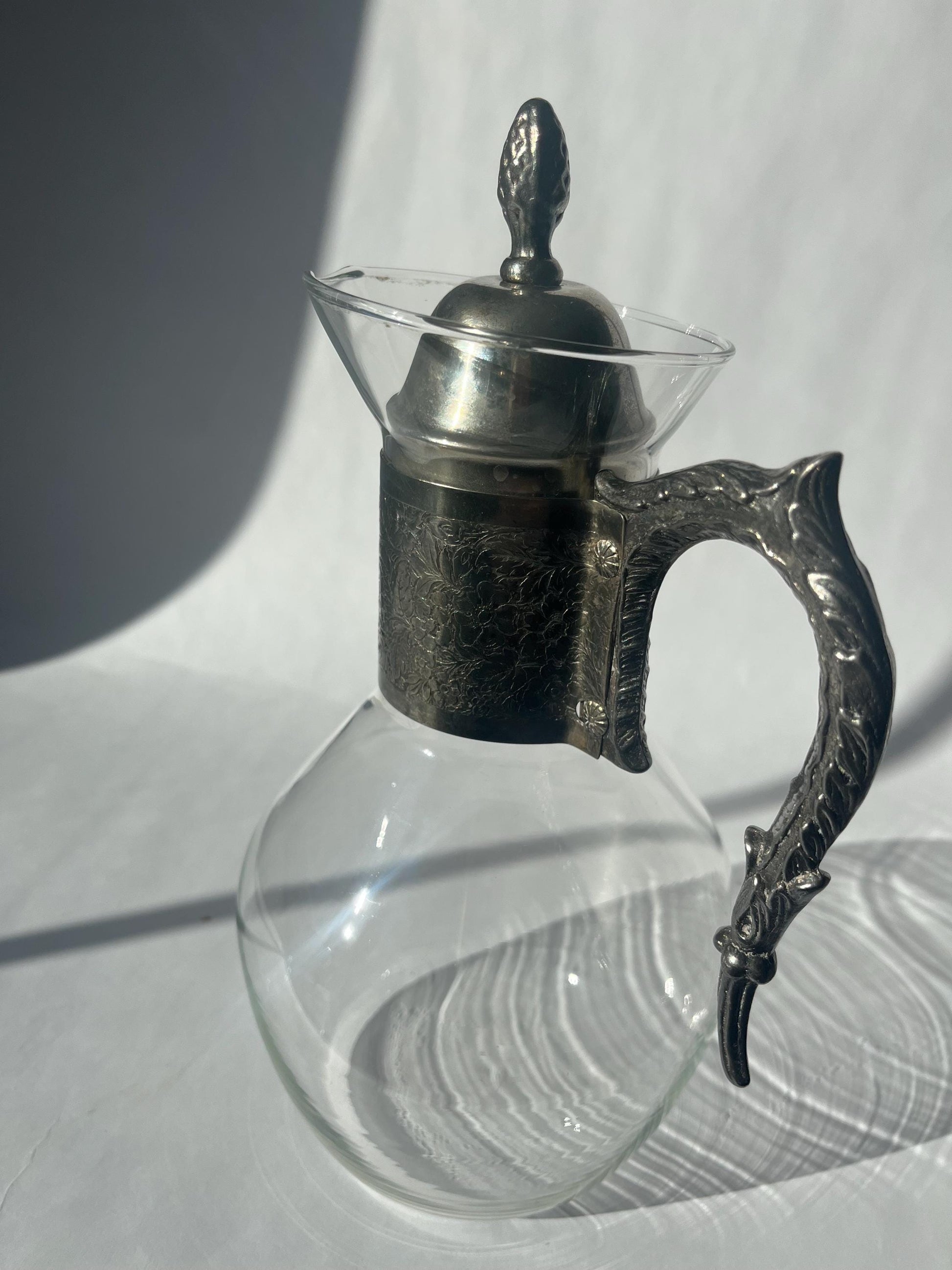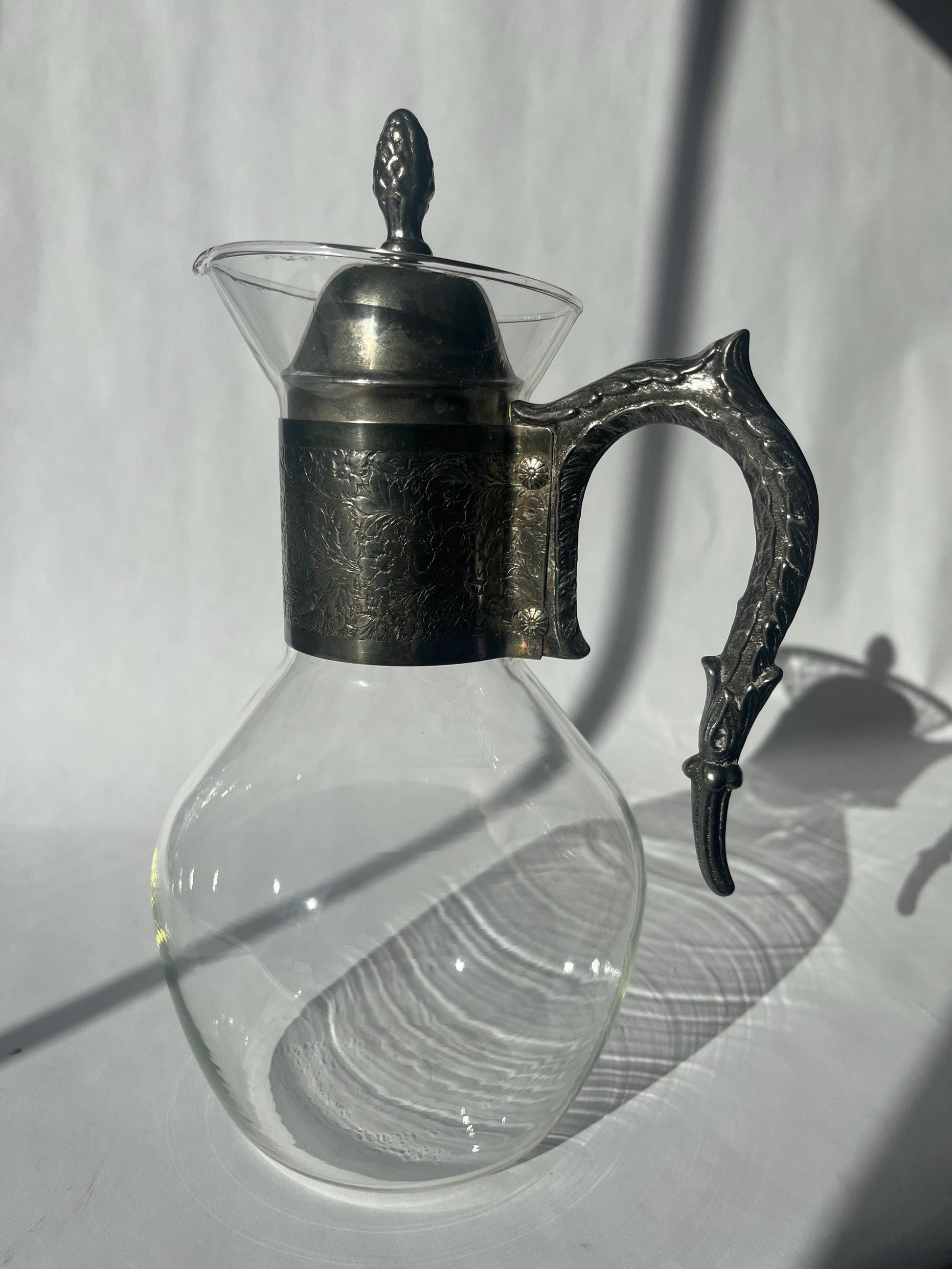 Wonderful vintage MCM wine carafe / coffee pot / pitcher. Clear glass with metal handle and top. Lovely decorative etched details on the metal part.