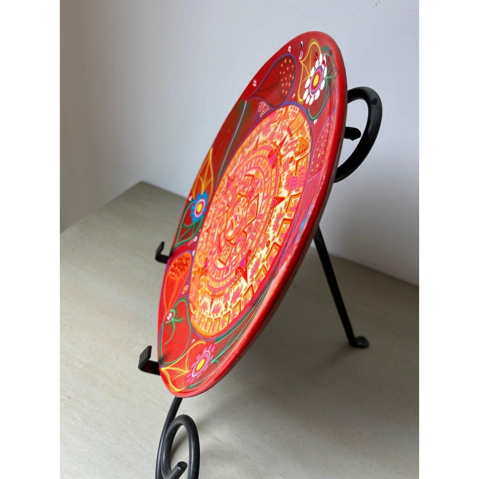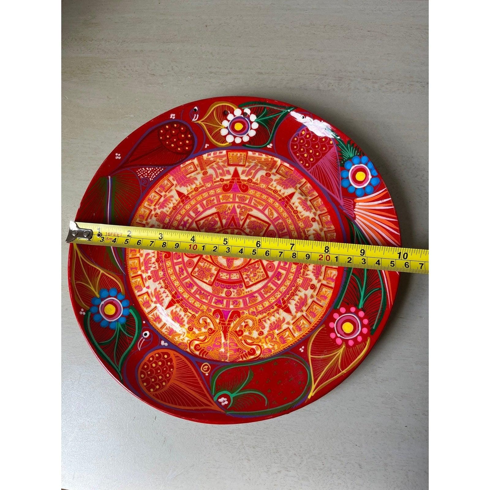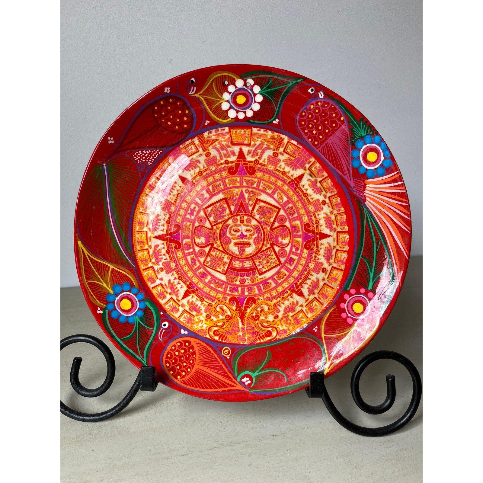 Beautiful Mexican Aztec sun calendar plate. Inlay mosaic in the middle, hand painted outer ring in Tonala style.