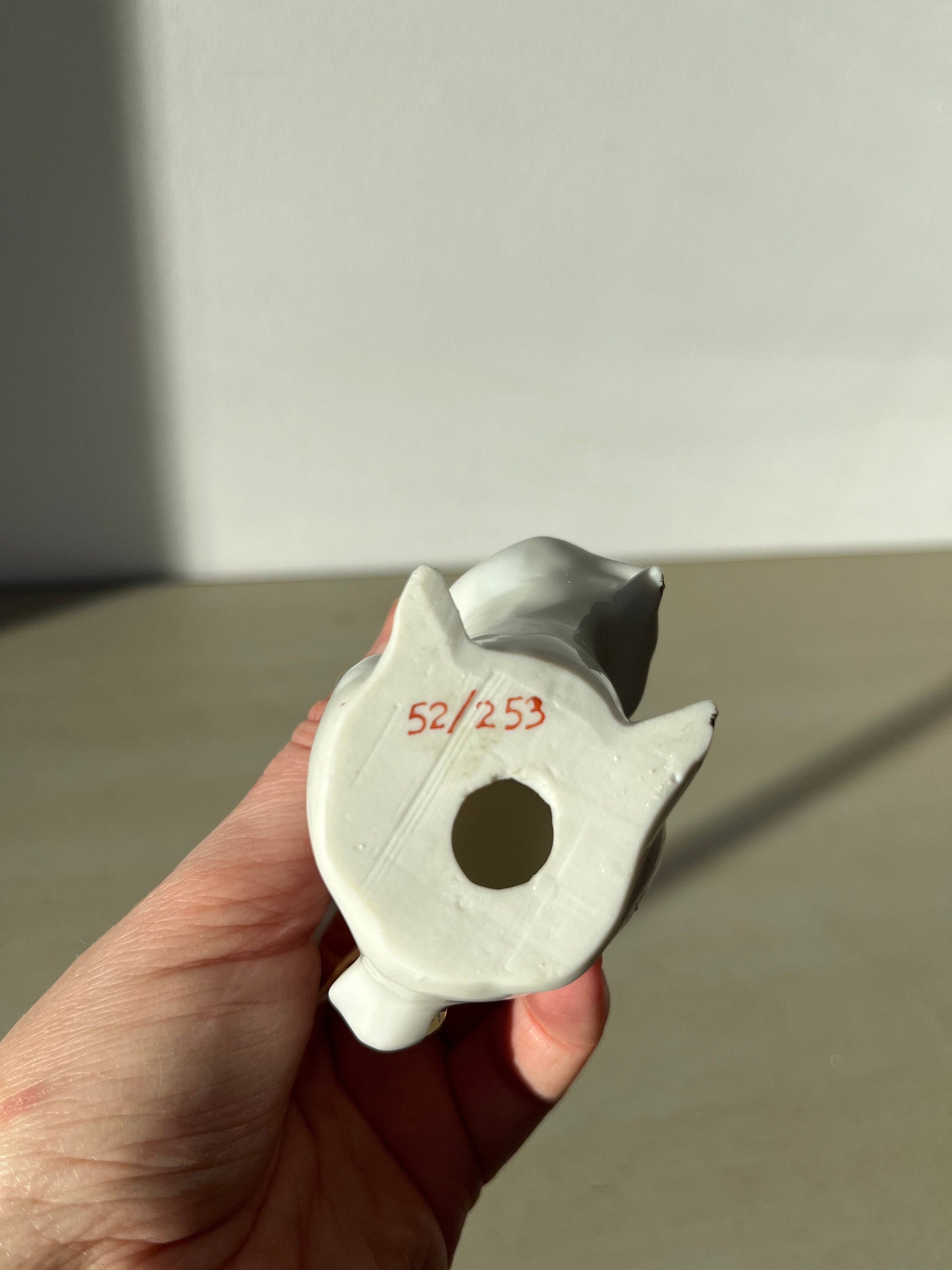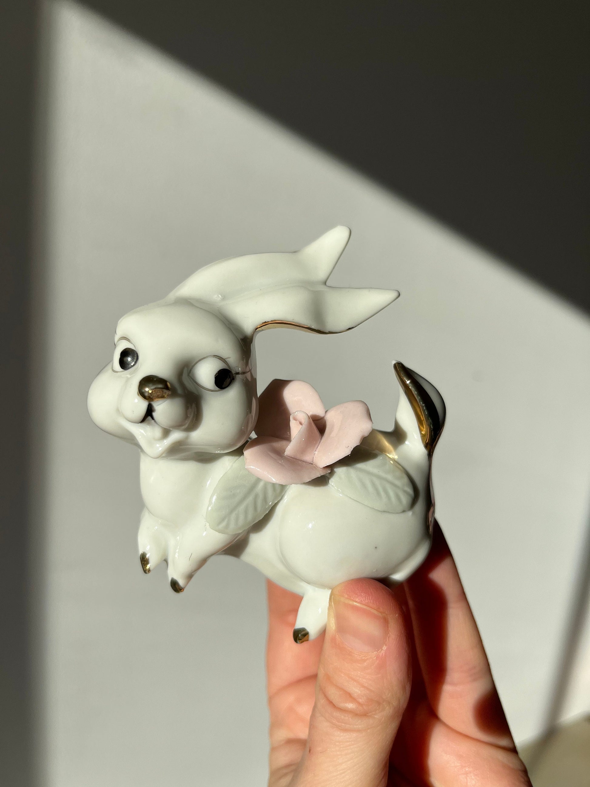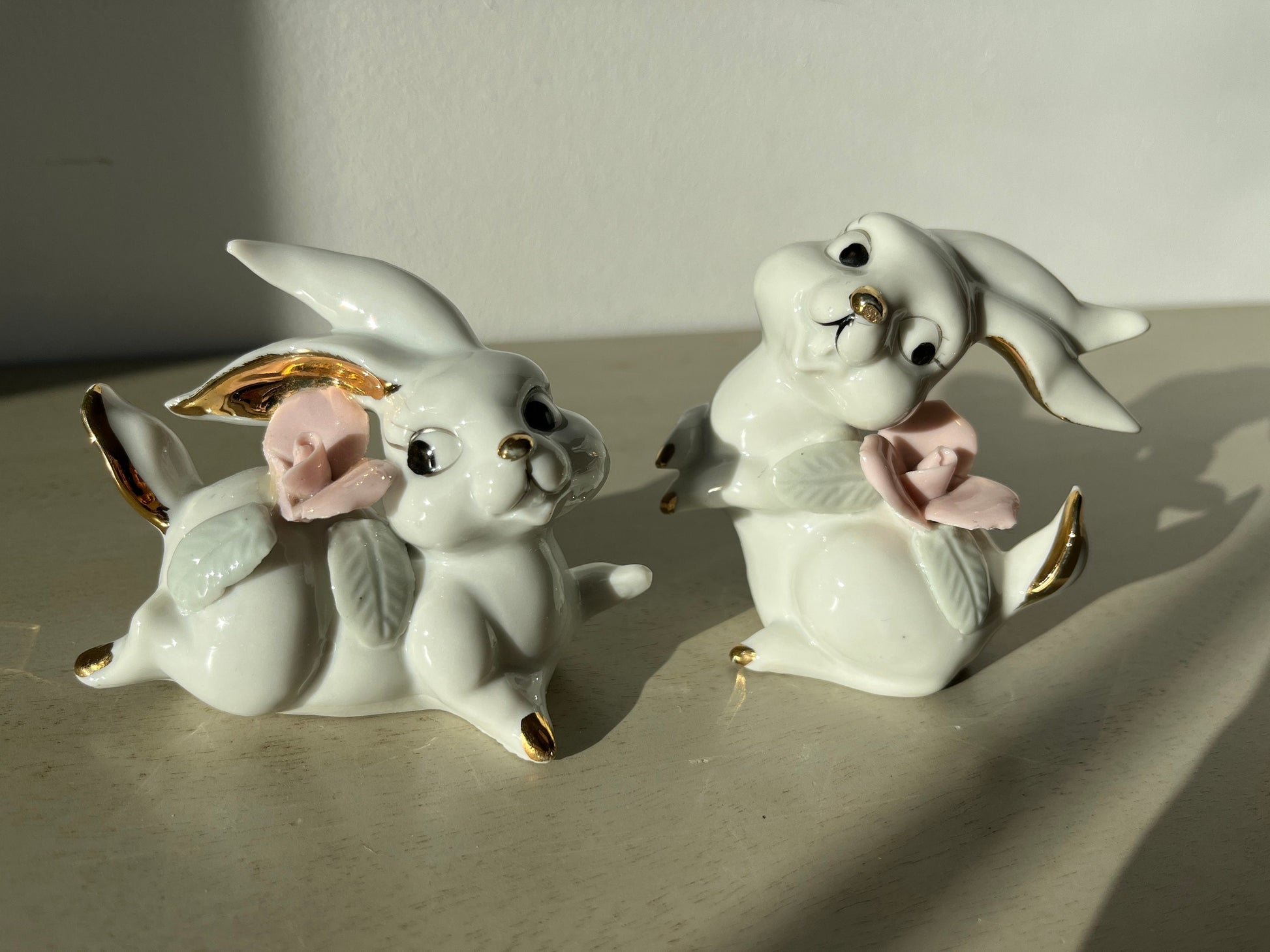 A pair of white vintage bunny rabbits with gold trims and a wearing a pink rose each. Likely made by Chase Japan.
