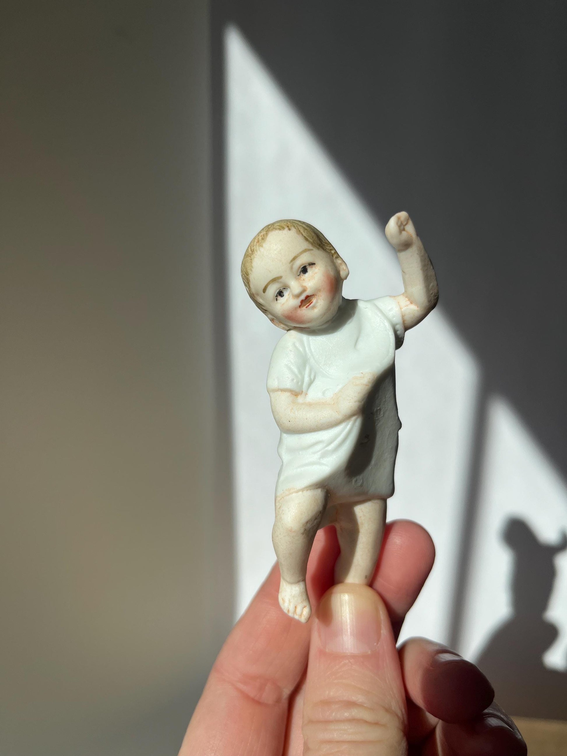 Antique bisque Piano Baby figurine, measures 3.5 inches in length.