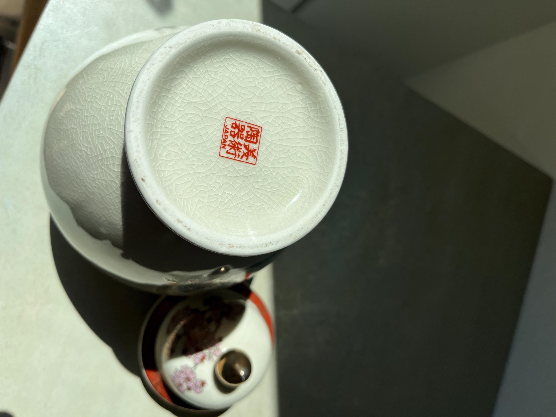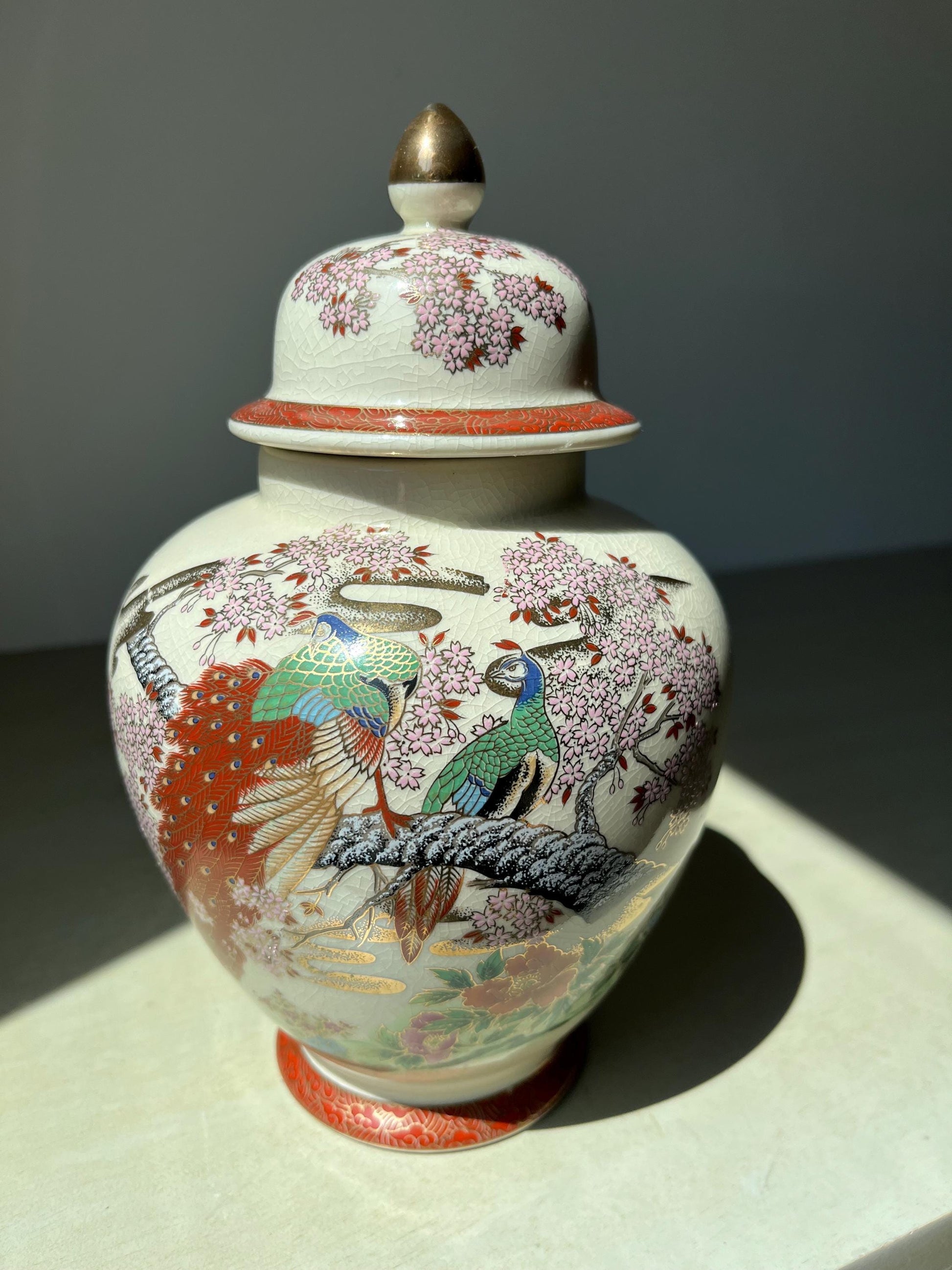 Beautiful vintage Satsuma Japanese urn shaped ginger jar wit a lid. Featuring 2 peacocks on the background of cherry blossoms. Japanese red stamp marking at the bottom.