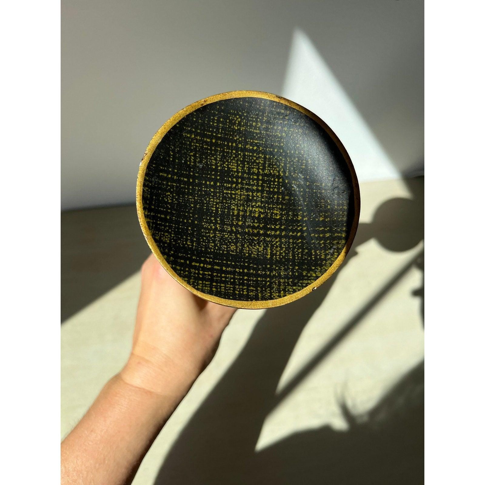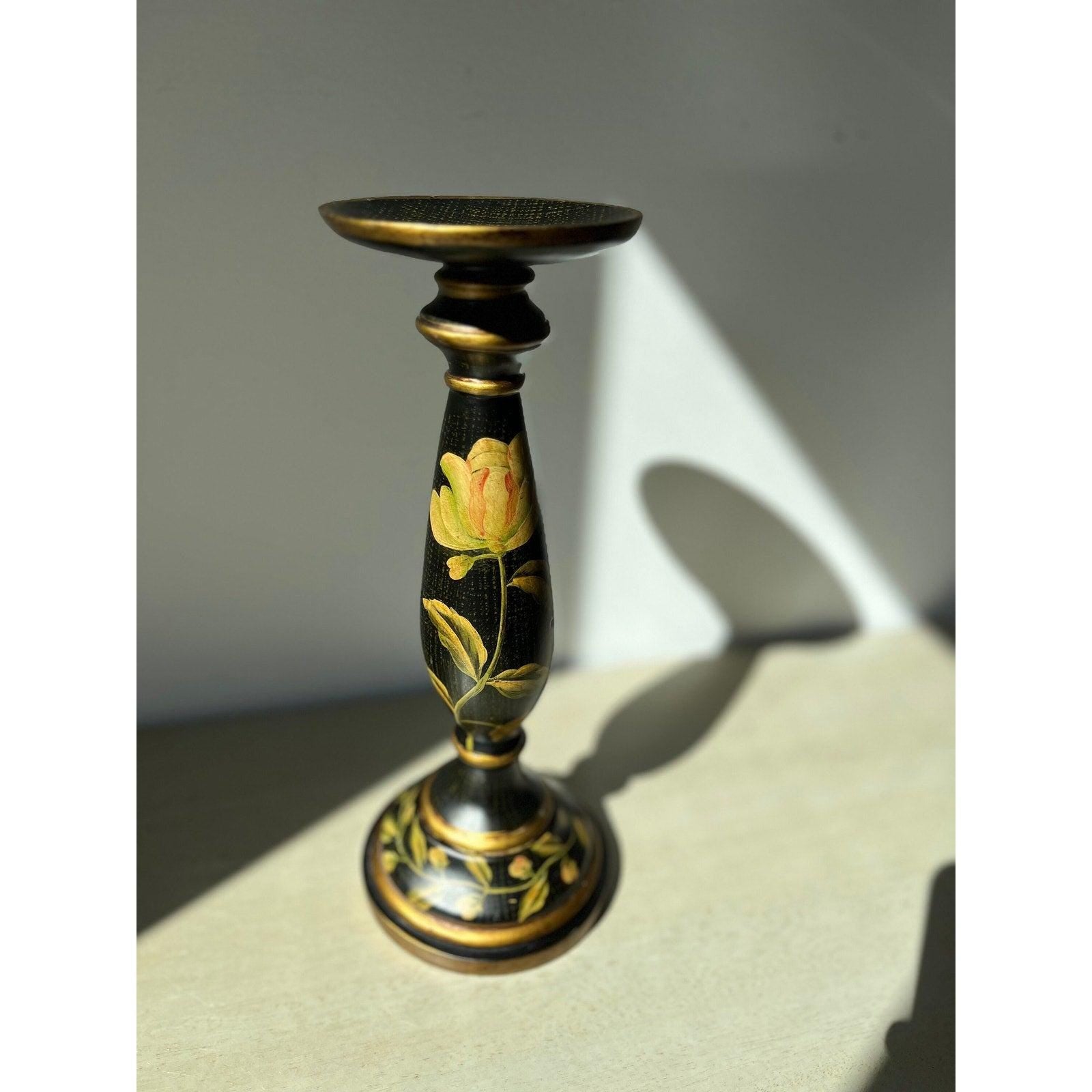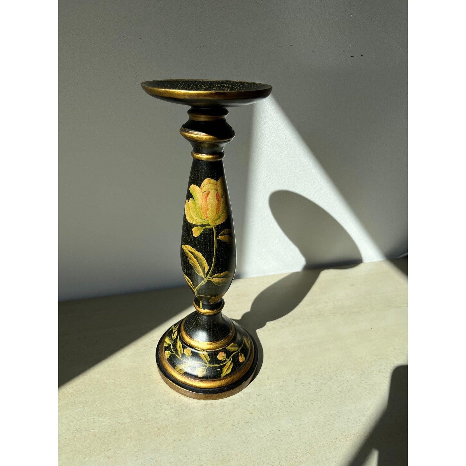 Vintage Wood Hand Painted Floral Black and Yellow Candlestick Holder