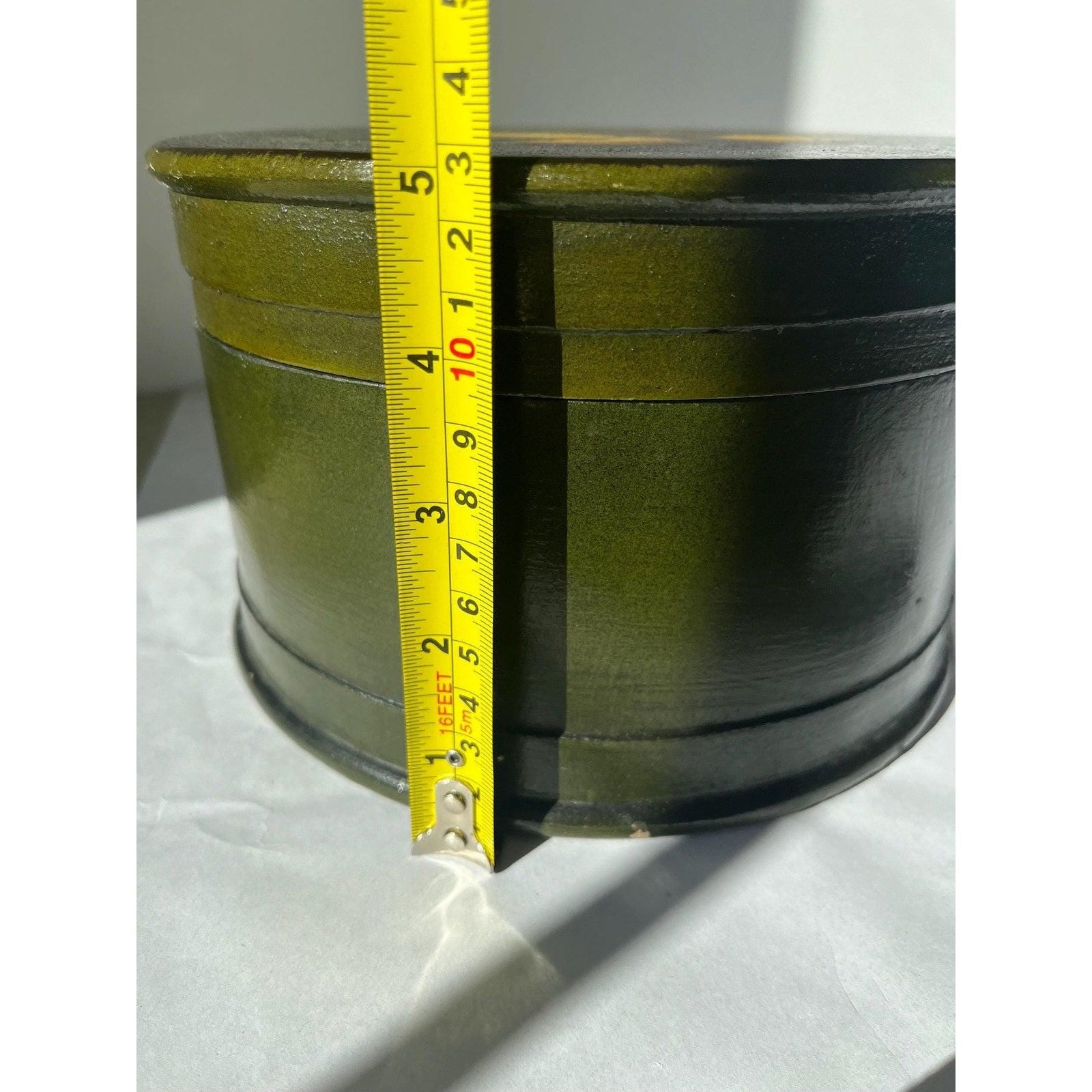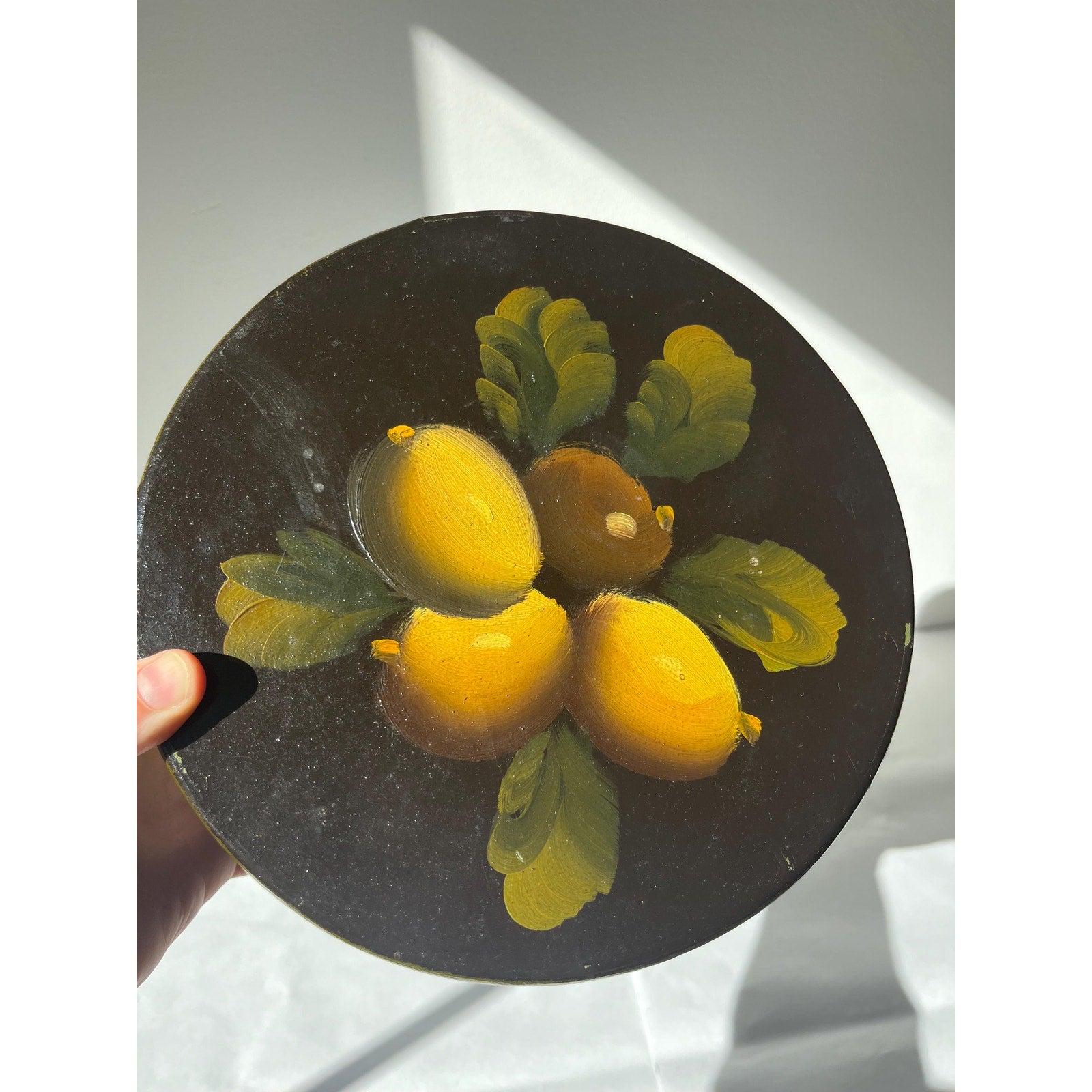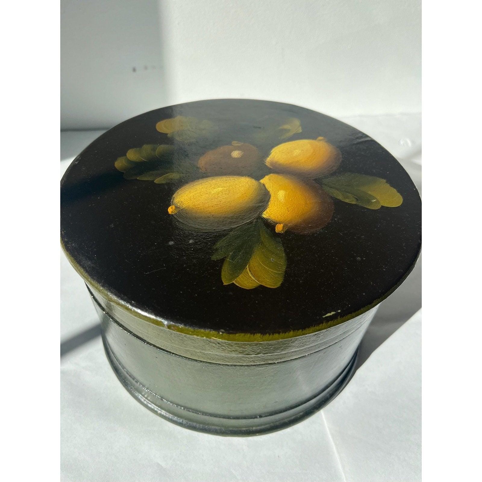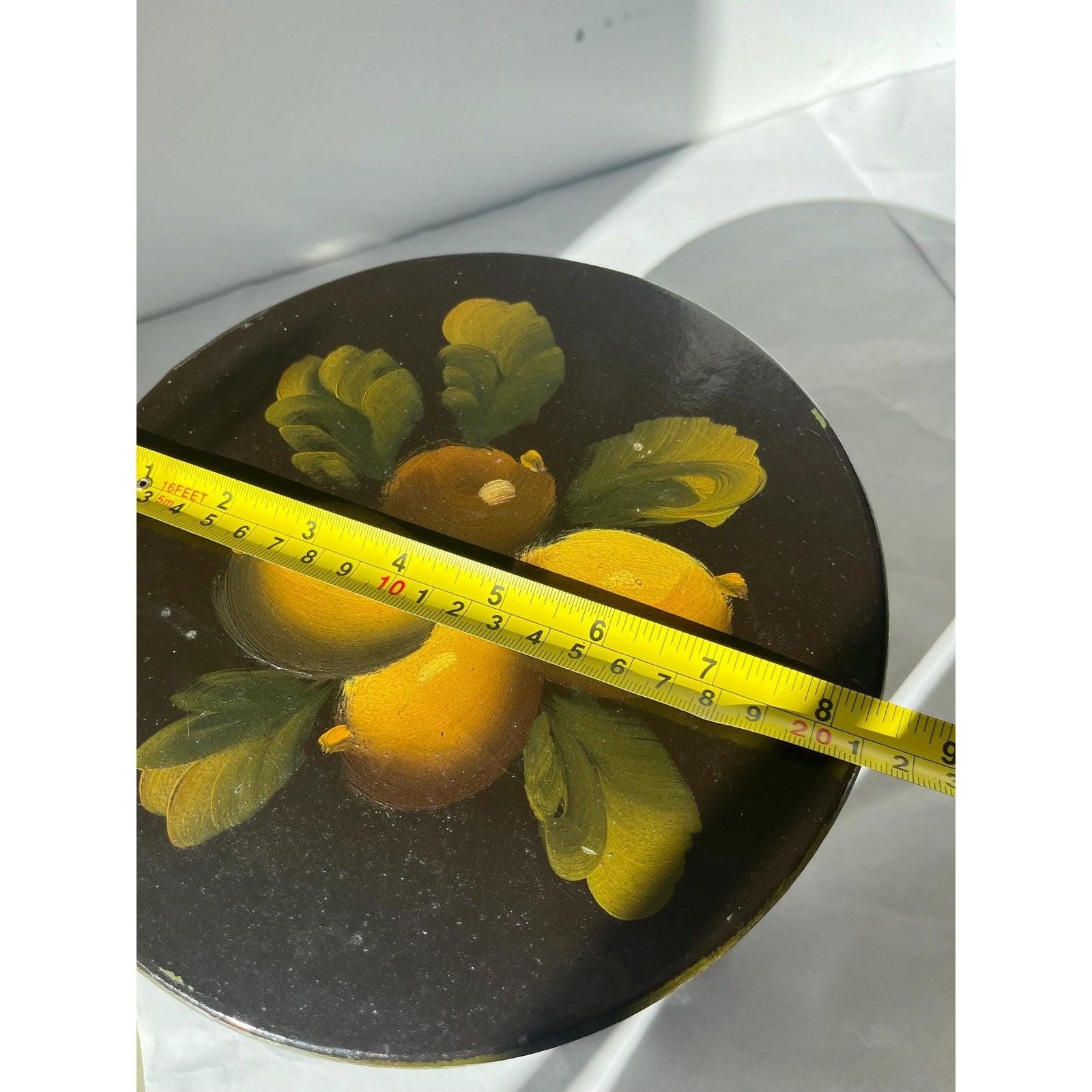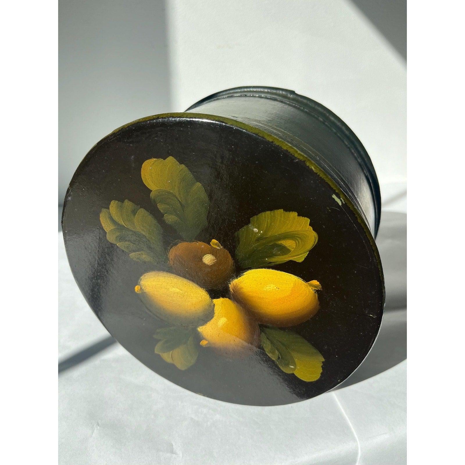 Lovely vintage hand painted wooden box in a shape of a cylinder with a lid and velvet interior. Dark brown exterior, painted top depicting fruits in oil painting still life style.